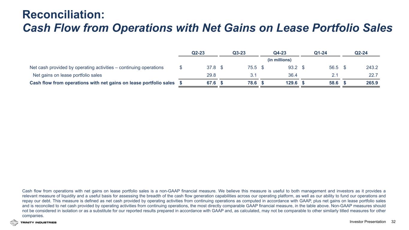 31Investor Presentation (1) The effective tax rate for gains on dispositions of other property; restructuring activities, net; and interest expense, net is before consideration of the CARES Act. (2) Represents insurance recoveries in excess of net book value for assets damaged by a tornado at the Company’s rail maintenance facility in Cartersville, Georgia in the first quarter of 2021. (3) Represents interest income accretion related to a seller-financing agreement associated with the sale of certain non-operating assets. We have supplemented the presentation of our reported GAAP operating profit, income (loss) from continuing operations before income taxes, provision (benefit) for income taxes, income (loss) from continuing operations, net income from continuing operations attributable to Trinity Industries, Inc., and diluted income from continuing operations per common share attributable to Trinity Industries, Inc. with non-GAAP measures that adjust the GAAP measures to exclude the impact of certain gains on dispositions of other property; restructuring activities, net; interest expense, net; the income tax effects of the CARES Act; and certain other transactions or events (as applicable), described in the footnotes to the table above. These non-GAAP measures are derived from amounts included in our GAAP financial statements and are reconciled to the most directly comparable GAAP financial measures in the table above. Management believes that these measures are useful to both management and investors for analyzing the performance of our business without the impact of certain items that are not indicative of our normal business operations. Non-GAAP measures should not be considered in isolation or as a substitute for our reported results prepared in accordance with GAAP and, as calculated, may not be comparable to other similarly titled measures for other companies. 31 Year Ended December 31, 2022 (in millions, except per share amounts) GAAP Gains on dispositions of property – other (1)(2) Restructuring activities, net (1) Interest expense, net (1)(3) Income tax effect of CARES Act Adjusted Operating profit $ 334.0 $ (7.5) $ 1.0 $ — $ — $ 327.5 Income (loss) from continuing operations before income taxes $ 126.5 $ (7.5) $ 1.0 $ (1.4) $ — $ 118.6 Provision (benefit) for income taxes $ 27.6 $ (1.9) $ 0.3 $ (0.3) $ 0.6 $ 26.3 Income (loss) from continuing operations $ 98.9 $ (5.6) $ 0.7 $ (1.1) $ (0.6) $ 92.3 Net income from continuing operations attributable to Trinity Industries, Inc. $ 86.1 $ (5.6) $ 0.7 $ (1.1) $ (0.6) $ 79.5 Diluted weighted average shares outstanding 84.2 84.2 Diluted income from continuing operations per common share attributable to Trinity Industries, Inc. $ 1.02 $ 0.94 Reconciliation: Adjusted Operating Results
