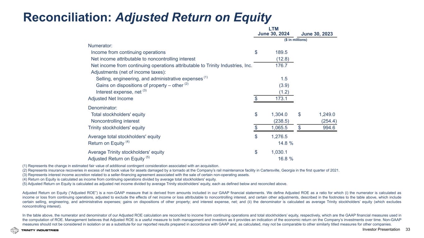 33Investor Presentation (1) Represents the change in estimated fair value of additional contingent consideration associated with an acquisition. (2) Represents insurance recoveries in excess of net book value for assets damaged by a tornado at the Company’s rail maintenance facility in Cartersville, Georgia in the first quarter of 2021. (3) Represents interest income accretion related to a seller-financing agreement associated with the sale of certain non-operating assets. (4) Return on Equity is calculated as income from continuing operations divided by average total stockholders' equity. (5) Adjusted Return on Equity is calculated as adjusted net income divided by average Trinity stockholders' equity, each as defined below and reconciled above. Adjusted Return on Equity (“Adjusted ROE”) is a non-GAAP measure that is derived from amounts included in our GAAP financial statements. We define Adjusted ROE as a ratio for which (i) the numerator is calculated as income or loss from continuing operations, adjusted to exclude the effects of net income or loss attributable to noncontrolling interest, and certain other adjustments, described in the footnotes to the table above, which include certain selling, engineering, and administrative expenses; gains on dispositions of other property; and interest expense, net; and (ii) the denominator is calculated as average Trinity stockholders’ equity (which excludes noncontrolling interest). In the table above, the numerator and denominator of our Adjusted ROE calculation are reconciled to income from continuing operations and total stockholders’ equity, respectively, which are the GAAP financial measures used in the computation of ROE. Management believes that Adjusted ROE is a useful measure to both management and investors as it provides an indication of the economic return on the Company’s investments over time. Non-GAAP measures should not be considered in isolation or as a substitute for our reported results prepared in accordance with GAAP and, as calculated, may not be comparable to other similarly titled measures for other companies. LTM June 30, 2024 June 30, 2023 ($ in millions) Numerator: Income from continuing operations $ 189.5 Net income attributable to noncontrolling interest (12.8) Net income from continuing operations attributable to Trinity Industries, Inc. 176.7 Adjustments (net of income taxes): Selling, engineering, and administrative expenses (1) 1.5 Gains on dispositions of property – other (2) (3.9) Interest expense, net (3) (1.2) Adjusted Net Income $ 173.1 Denominator: Total stockholders' equity $ 1,304.0 $ 1,249.0 Noncontrolling interest (238.5) (254.4) Trinity stockholders' equity $ 1,065.5 $ 994.6 Average total stockholders' equity $ 1,276.5 Return on Equity (4) 14.8 % Average Trinity stockholders' equity $ 1,030.1 Adjusted Return on Equity (5) 16.8 % Reconciliation: Adjusted Return on Equity