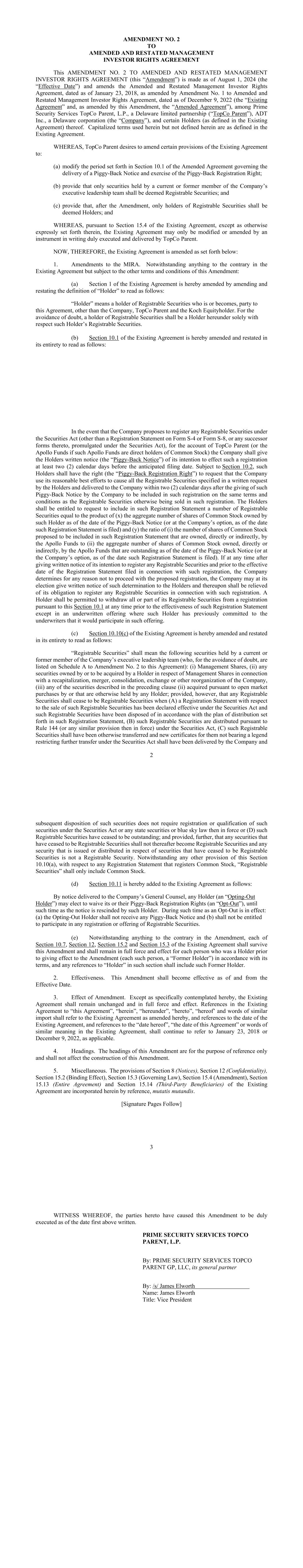 AMENDMENT NO. 2 TO AMENDED AND RESTATED MANAGEMENT INVESTOR RIGHTS AGREEMENT This AMENDMENT NO. 2 TO AMENDED AND RESTATED MANAGEMENT INVESTOR RIGHTS AGREEMENT (this “Amendment”) is made as of August 1, 2024 (the “Effective Date”) and amends the Amended and Restated Management Investor Rights Agreement, dated as of January 23, 2018, as amended by Amendment No. 1 to Amended and Restated Management Investor Rights Agreement, dated as of December 9, 2022 (the “Existing Agreement” and, as amended by this Amendment, the “Amended Agreement”), among Prime Security Services TopCo Parent, L.P., a Delaware limited partnership (“TopCo Parent”), ADT Inc., a Delaware corporation (the “Company”), and certain Holders (as defined in the Existing Agreement) thereof. Capitalized terms used herein but not defined herein are as defined in the Existing Agreement. WHEREAS, TopCo Parent desires to amend certain provisions of the Existing Agreement to: (a) modify the period set forth in Section 10.1 of the Amended Agreement governing the delivery of a Piggy-Back Notice and exercise of the Piggy-Back Registration Right; (b) provide that only securities held by a current or former member of the Company’s executive leadership team shall be deemed Registrable Securities; and (c) provide that, after the Amendment, only holders of Registrable Securities shall be deemed Holders; and WHEREAS, pursuant to Section 15.4 of the Existing Agreement, except as otherwise expressly set forth therein, the Existing Agreement may only be modified or amended by an instrument in writing duly executed and delivered by TopCo Parent. NOW, THEREFORE, the Existing Agreement is amended as set forth below: 1. Amendments to the MIRA. Notwithstanding anything to the contrary in the Existing Agreement but subject to the other terms and conditions of this Amendment: (a) Section 1 of the Existing Agreement is hereby amended by amending and restating the definition of “Holder” to read as follows: “Holder” means a holder of Registrable Securities who is or becomes, party to this Agreement, other than the Company, TopCo Parent and the Koch Equityholder. For the avoidance of doubt, a holder of Registrable Securities shall be a Holder hereunder solely with respect such Holder’s Registrable Securities. (b) Section 10.1 of the Existing Agreement is hereby amended and restated in its entirety to read as follows: 2 In the event that the Company proposes to register any Registrable Securities under the Securities Act (other than a Registration Statement on Form S-4 or Form S-8, or any successor forms thereto, promulgated under the Securities Act), for the account of TopCo Parent (or the Apollo Funds if such Apollo Funds are direct holders of Common Stock) the Company shall give the Holders written notice (the “Piggy-Back Notice”) of its intention to effect such a registration at least two (2) calendar days before the anticipated filing date. Subject to Section 10.2, such Holders shall have the right (the “Piggy-Back Registration Right”) to request that the Company use its reasonable best efforts to cause all the Registrable Securities specified in a written request by the Holders and delivered to the Company within two (2) calendar days after the giving of such Piggy-Back Notice by the Company to be included in such registration on the same terms and conditions as the Registrable Securities otherwise being sold in such registration. The Holders shall be entitled to request to include in such Registration Statement a number of Registrable Securities equal to the product of (x) the aggregate number of shares of Common Stock owned by such Holder as of the date of the Piggy-Back Notice (or at the Company’s option, as of the date such Registration Statement is filed) and (y) the ratio of (i) the number of shares of Common Stock proposed to be included in such Registration Statement that are owned, directly or indirectly, by the Apollo Funds to (ii) the aggregate number of shares of Common Stock owned, directly or indirectly, by the Apollo Funds that are outstanding as of the date of the Piggy-Back Notice (or at the Company’s option, as of the date such Registration Statement is filed). If at any time after giving written notice of its intention to register any Registrable Securities and prior to the effective date of the Registration Statement filed in connection with such registration, the Company determines for any reason not to proceed with the proposed registration, the Company may at its election give written notice of such determination to the Holders and thereupon shall be relieved of its obligation to register any Registrable Securities in connection with such registration. A Holder shall be permitted to withdraw all or part of its Registrable Securities from a registration pursuant to this Section 10.1 at any time prior to the effectiveness of such Registration Statement except in an underwritten offering where such Holder has previously committed to the underwriters that it would participate in such offering. (c) Section 10.10(c) of the Existing Agreement is hereby amended and restated in its entirety to read as follows: “Registrable Securities” shall mean the following securities held by a current or former member of the Company’s executive leadership team (who, for the avoidance of doubt, are listed on Schedule A to Amendment No. 2 to this Agreement): (i) Management Shares, (ii) any securities owned by or to be acquired by a Holder in respect of Management Shares in connection with a recapitalization, merger, consolidation, exchange or other reorganization of the Company, (iii) any of the securities described in the preceding clause (ii) acquired pursuant to open market purchases by or that are otherwise held by any Holder; provided, however, that any Registrable Securities shall cease to be Registrable Securities when (A) a Registration Statement with respect to the sale of such Registrable Sec