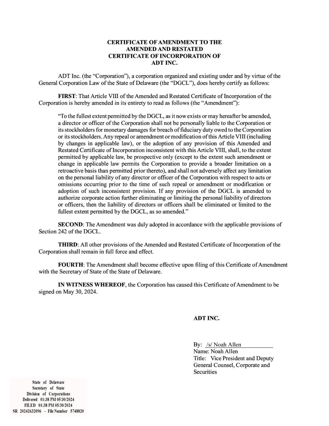 Delaware The First State Page 1 5748820 8100 Authentication: 203592072 SR# 20242632096 Date: 05-30-24 You may verify this certificate online at corp.delaware.gov/authver.shtml I, JEFFREY W. BULLOCK, SECRETARY OF STATE OF THE STATE OF DELAWARE, DO HEREBY CERTIFY THE ATTACHED IS A TRUE AND CORRECT COPY OF THE CERTIFICATE OF AMENDMENT OF “ADT INC.”, FILED IN THIS OFFICE ON THE THIRTIETH DAY OF MAY, A.D. 2024, AT 1:38 O`CLOCK P.M.