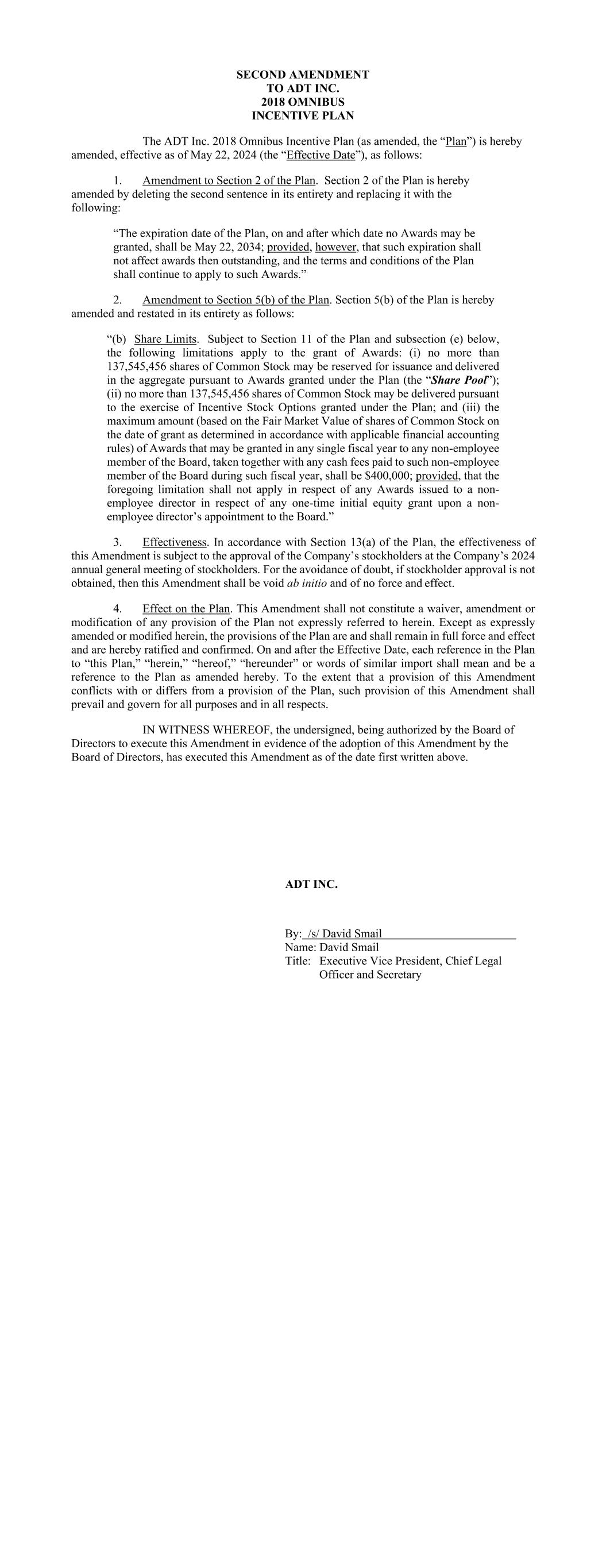 SECOND AMENDMENT TO ADT INC. 2018 OMNIBUS INCENTIVE PLAN The ADT Inc. 2018 Omnibus Incentive Plan (as amended, the “Plan”) is hereby amended, effective as of May 22, 2024 (the “Effective Date”), as follows: 1. Amendment to Section 2 of the Plan. Section 2 of the Plan is hereby amended by deleting the second sentence in its entirety and replacing it with the following: “The expiration date of the Plan, on and after which date no Awards may be granted, shall be May 22, 2034; provided, however, that such expiration shall not affect awards then outstanding, and the terms and conditions of the Plan shall continue to apply to such Awards.” 2. Amendment to Section 5(b) of the Plan. Section 5(b) of the Plan is hereby amended and restated in its entirety as follows: “(b) Share Limits. Subject to Section 11 of the Plan and subsection (e) below, the following limitations apply to the grant of Awards: (i) no more than 137,545,456 shares of Common Stock may be reserved for issuance and delivered in the aggregate pursuant to Awards granted under the Plan (the “Share Pool”); (ii) no more than 137,545,456 shares of Common Stock may be delivered pursuant to the exercise of Incentive Stock Options granted under the Plan; and (iii) the maximum amount (based on the Fair Market Value of shares of Common Stock on the date of grant as determined in accordance with applicable financial accounting rules) of Awards that may be granted in any single fiscal year to any non-employee member of the Board, taken together with any cash fees paid to such non-employee member of the Board during such fiscal year, shall be $400,000; provided, that the foregoing limitation shall not apply in respect of any Awards issued to a non- employee director in respect of any one-time initial equity grant upon a non- employee director’s appointment to the Board.” 3. Effectiveness. In accordance with Section 13(a) of the Plan, the effectiveness of this Amendment is subject to the approval of the Company’s stockholders at the Company’s 2024 annual general meeting of stockholders. For the avoidance of doubt, if stockholder approval is not obtained, then this Amendment shall be void ab initio and of no force and effect. 4. Effect on the Plan. This Amendment shall not constitute a waiver, amendment or modification of any provision of the Plan not expressly referred to herein. Except as expressly amended or modified herein, the provisions of the Plan are and shall remain in full force and effect and are hereby ratified and confirmed. On and after the Effective Date, each reference in the Plan to “this Plan,” “herein,” “hereof,” “hereunder” or words of similar import shall mean and be a reference to the Plan as amended hereby. To the extent that a provision of this Amendment conflicts with or differs from a provision of the Plan, such provision of this Amendment shall prevail and govern for all purposes and in all respects. IN WITNESS WHEREOF, the undersigned, being authorized by the Board of Directors to execute this Amendment in evidence of the adoption of this Amendment by the Board of Directors, has executed this Amendment as of the date first written above. ADT INC. By: /s/ David Smail Name: David Smail Title: Executive Vice President, Chief Legal Officer and Secretary