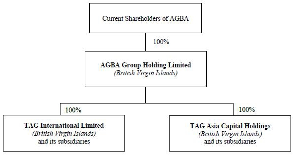 | 3. | A proposal (the “Domestication Proposal”) to change the domicile of the Company by way of continuation out of the British Virgin Islands, as a business company incorporated under the laws of the British Virgin Islands, and into the State of Delaware to become a corporation incorporated under the laws of the State of Delaware (the “Domestication”). The Domestication will be effected prior to the Merger as follows: (i) with respect to the British Virgin Islands, filing a Notice of Continuation Out of the British Virgin Islands together with supporting documents with the Registrar under section 184 of the BVI Companies Act and receiving a Certificate of Discontinuance from the Registrar in relation to the Domestication pursuant to section 184 of the BVI Companies Act; and (ii) with respect to Delaware, approval of filing of a Certificate of Domestication under Section 388 of the Delaware General Corporation Law (the “DGCL”) (the “Certificate of Domestication”) along with a Certificate of Incorporation under Section 103 of the DGCL (the “AGBA Delaware Certificate of Incorporation”), upon which the Company shall become a Delaware corporation, or “AGBA Delaware”, and will change its name to “AGBA Group Holding Inc.” Upon the effectiveness of the Domestication, all outstanding securities of the Company will convert to outstanding securities of AGBA Delaware, as described in more detail in this proxy statement. | |