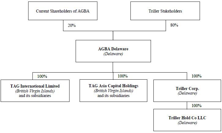 | (3) | Proposal 3. Domestication Proposal — to change the domicile of the Company by way of continuation out of the British Virgin Islands, as a business company incorporated under the laws of the British Virgin Islands, and into the State of Delaware to become a corporation incorporated under the laws of the State of Delaware (the “Domestication”). The Domestication will be effected prior to the Merger by (i) with respect to the British Virgin Islands, filing a Notice of Continuation Out of the Virgin Islands together with supporting documents with the Registrar under section 184 of the BVI Companies Act and receiving a Certificate of Discontinuance from the Registrar in relation to the Domestication pursuant to section 184 of the BVI Companies Act and (ii) with respect to Delaware, filing a Certificate of Domestication under Section 388 of the Delaware General Corporation Law (the “DGCL”) (the “Certificate of Domestication”) along with a Certificate of Incorporation under Section 103 of the DGCL (the “AGBA Delaware Certificate of Incorporation”), upon which the Company shall become a Delaware corporation (the Company, after giving effect to the Domestication, is sometimes referred to herein as “AGBA Delaware”) and will change its name to “Triller Group Inc.” Upon the effectiveness of the Domestication, all outstanding securities of the Company will convert to outstanding securities of AGBA Delaware, as described in more detail in the accompanying proxy statement; |