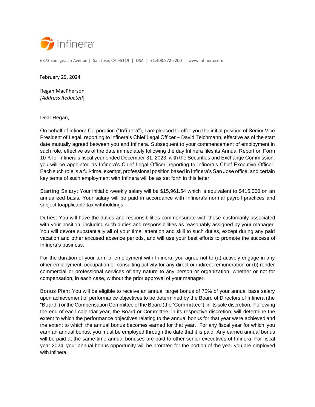 6373 San Ignacio Avenue | San Jose, CA 95119 | USA | +1.408.572.5200 | www.infinera.com February 29, 2024 Regan MacPherson [Address Redacted] Dear Regan, On behalf of Infinera Corporation (“Infinera”), I am pleased to offer you the initial position of Senior Vice President of Legal, reporting to Infinera’s Chief Legal Officer – David Teichmann, effective as of the start date mutually agreed between you and Infinera. Subsequent to your commencement of employment in such role, effective as of the date immediately following the day Infinera files its Annual Report on Form 10-K for Infinera’s fiscal year ended December 31, 2023, with the Securities and Exchange Commission, you will be appointed as Infinera’s Chief Legal Officer, reporting to Infinera’s Chief Executive Officer. Each such role is a full-time, exempt, professional position based in Infinera’s San Jose office, and certain key terms of such employment with Infinera will be as set forth in this letter. Starting Salary: Your initial bi-weekly salary will be $15,961.54 which is equivalent to $415,000 on an annualized basis. Your salary will be paid in accordance with Infinera's normal payroll practices and subject to applicable tax withholdings. Duties: You will have the duties and responsibilities commensurate with those customarily associated with your position, including such duties and responsibilities as reasonably assigned by your manager. You will devote substantially all of your time, attention and skill to such duties, except during any paid vacation and other excused absence periods, and will use your best efforts to promote the success of Infinera’s business. For the duration of your term of employment with Infinera, you agree not to (a) actively engage in any other employment, occupation or consulting activity for any direct or indirect remuneration or (b) render commercial or professional services of any nature to any person or organization, whether or not for compensation, in each case, without the prior approval of your manager. Bonus Plan: You will be eligible to receive an annual target bonus of 75% of your annual base salary upon achievement of performance objectives to be determined by the Board of Directors of Infinera (the “Board”) or the Compensation Committee of the Board (the “Committee”), in its sole discretion. Following the end of each calendar year, the Board or Committee, in its respective discretion, will determine the extent to which the performance objectives relating to the annual bonus for that year were achieved and the extent to which the annual bonus becomes earned for that year. For any fiscal year for which you earn an annual bonus, you must be employed through the date that it is paid. Any earned annual bonus will be paid at the same time annual bonuses are paid to other senior executives of Infinera. For fiscal year 2024, your annual bonus opportunity will be prorated for the portion of the year you are employed with Infinera.