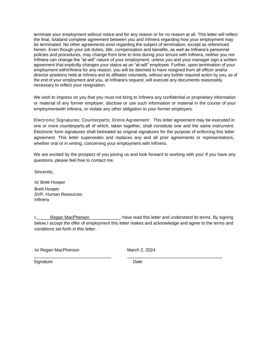 terminate your employment without notice and for any reason or for no reason at all. This letter will reflect the final, total and complete agreement between you and Infinera regarding how your employment may be terminated. No other agreements exist regarding the subject of termination, except as referenced herein. Even though your job duties, title, compensation and benefits, as well as Infinera’s personnel policies and procedures, may change from time to time during your tenure with Infinera, neither you nor Infinera can change the “at-will” nature of your employment, unless you and your manager sign a written agreement that explicitly changes your status as an “at-will” employee. Further, upon termination of your employment with Infinera for any reason, you will be deemed to have resigned from all officer and/or director positions held at Infinera and its affiliates voluntarily, without any further required action by you, as of the end of your employment and you, at Infinera’s request, will execute any documents reasonably necessary to reflect your resignation. We wish to impress on you that you must not bring to Infinera any confidential or proprietary information or material of any former employer, disclose or use such information or material in the course of your employment with Infinera, or violate any other obligation to your former employers. Electronic Signatures; Counterparts; Entire Agreement: This letter agreement may be executed in one or more counterparts, all of which, taken together, shall constitute one and the same instrument. Electronic form signatures shall be treated as original signatures for the purpose of enforcing this letter agreement. This letter supersedes and replaces any and all prior agreements or representations, whether oral or in writing, concerning your employment with Infinera. We are excited by the prospect of you joining us and look forward to working with you! If you have any questions, please feel free to contact me. Sincerely, /s/ Brett Hooper Brett Hooper SVP, Human Resources Infinera I, Regan MacPherson , have read this letter and understand its terms. By signing below, I accept the offer of employment this letter makes and acknowledge and agree to the terms and conditions set forth in this letter. /s/ Regan MacPherson March 2, 2024 Signature Date