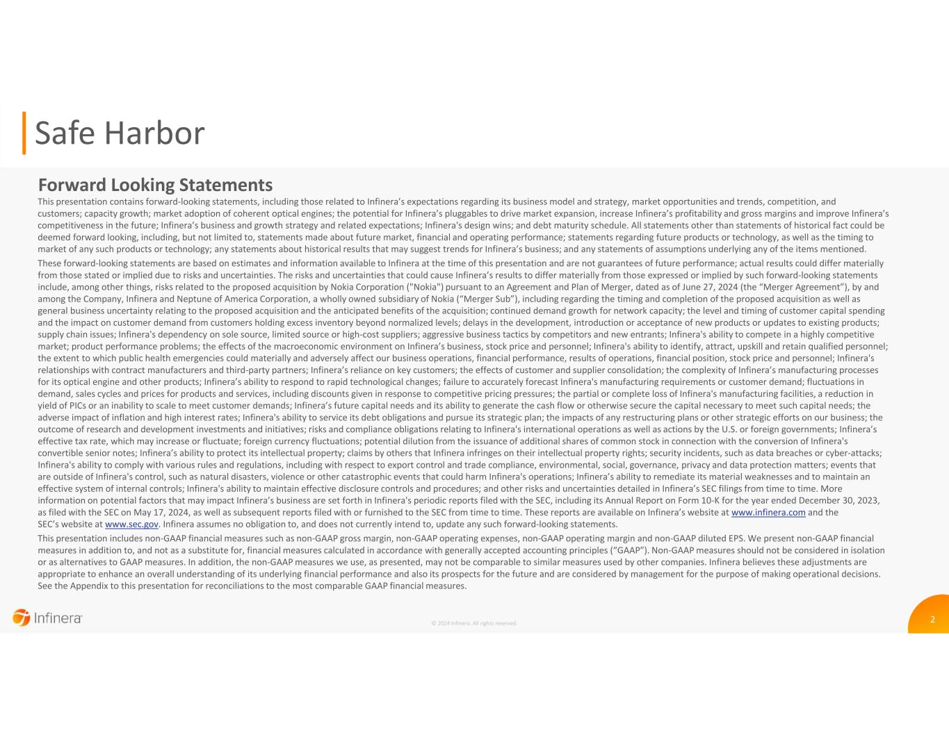 These forward-looking statements are based on estimates and information available to Infinera as of the date hereof and are not guarantees of actual or future performance; actual results could differ materially from those stated or implied due to risks and uncertainties. The risks and uncertainties that could cause Infinera’s results to differ materially from those expressed or implied by such forward-looking statements include statements related to the Merger, including whether the Merger may not be completed or completion may be delayed, and if the Merger Agreement is terminated, there may be a required payment of a significant termination fee by either party; the receipt of necessary approvals to complete the Merger; the possibility that due to the Merger, and uncertainty regarding the Merger, Infinera’s customers, suppliers or strategic partners may delay or defer entering into contracts or making other decisions concerning Infinera; the significance and timing of costs related to the Merger; the impact on us of litigation or other stockholder action related to the Merger; the effects on us and our stockholders if the Merger is not completed; demand growth for additional network capacity and the level and timing of customer capital spending and excess inventory held by customers beyond normalized levels; delays in the development, introduction or acceptance of new products or in releasing enhancements to existing products; aggressive business tactics by Infinera’s competitors and new entrants and Infinera's ability to compete in a highly competitive market; supply chain and logistics issues and their impact on our business, and Infinera's dependency on sole source, limited source or high-cost suppliers; dependence on a small number of key customers; product performance problems; the complexity of Infinera's manufacturing process; Infinera's ability to identify, attract, upskill and retain qualified personnel; challenges with our contract manufacturers and other third-party partners; the effects of customer and supplier consolidation; dependence on third-party service partners; Infinera’s ability to respond to rapid technological changes; failure to accurately forecast Infinera's manufacturing requirements or customer demand; the effects of public health emergencies; Infinera’s future capital needs and its ability to generate the cash flow or otherwise secure the capital necessary to meet such capital needs; the effect of global and regional economic conditions on Infinera’s business, including effects on purchasing decisions by customers; the adverse impact inflation and higher interest rates may have on Infinera by increasing costs beyond what it can recover through price increases; restrictions to our operations resulting from loan or other credit agreements; the impacts of any restructuring plans or other strategic efforts on our business; Infinera’s international sales and operations; the impacts of foreign currency fluctuations; the effective tax rate of Infinera, which may increase or fluctuate; potential dilution from the issuance of additional shares of common stock in connection with the conversion of Infinera's convertible senior notes; Infinera’s ability to protect its intellectual property; claims by others that Infinera infringes on their intellectual property rights; security incidents, such as data breaches or cyber-attacks; Infinera's ability to comply with various rules and regulations, including with respect to export control and trade compliance, environmental, social, governance, privacy and data protection matters; events that are outside of Infinera's control, such as natural disasters, acts of war or terrorism, or other catastrophic events that could harm Infinera's operations; Infinera’s ability to remediate its recently disclosed material weaknesses in internal control over financial reporting in a timely and effective manner, and other risks and uncertainties detailed in Infinera’s SEC filings from time to time; and statements of assumptions underlying any of the foregoing. More information on potential factors