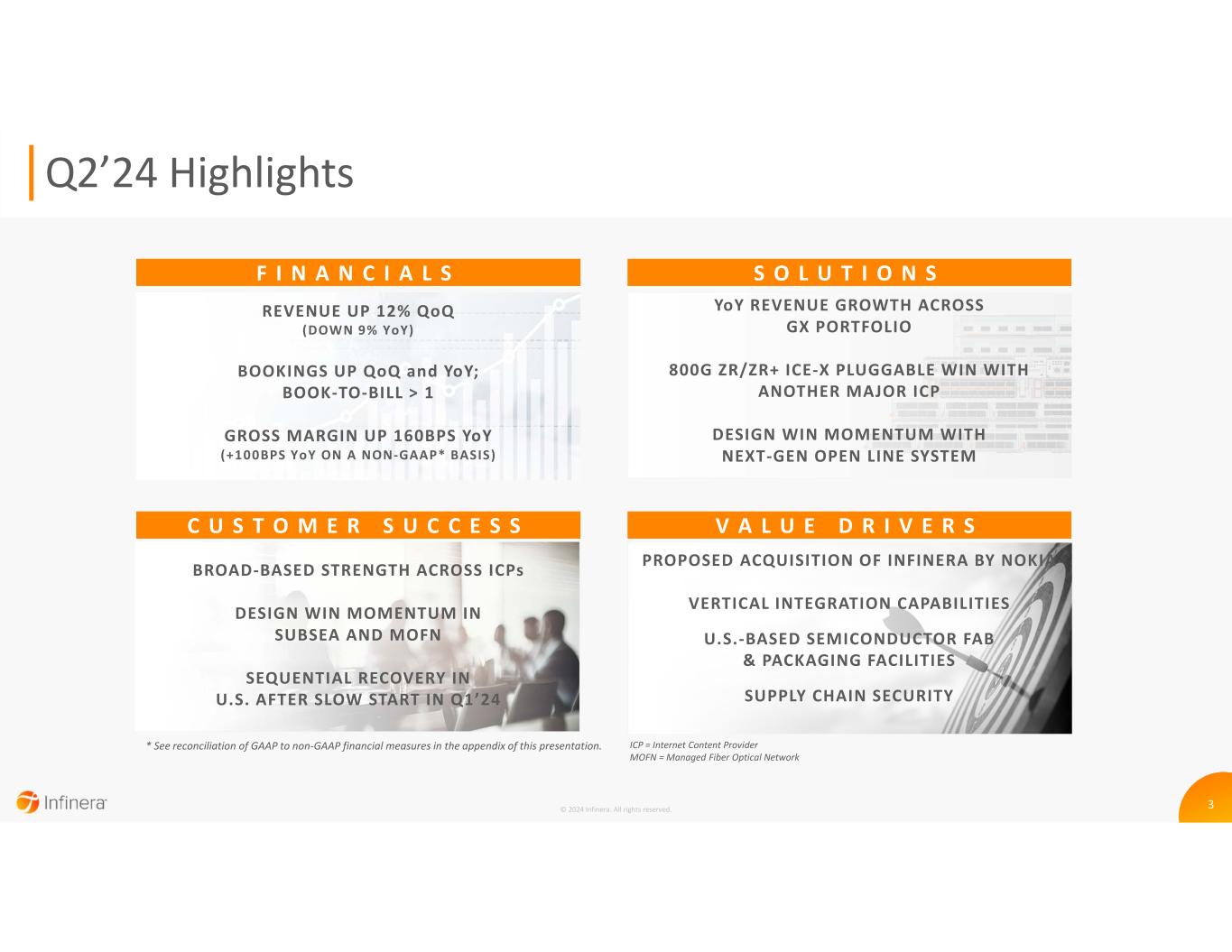 2© 2024 Infinera. All rights reserved. Safe Harbor This presentation contains forward-looking statements, including those related to Infinera’s expectations regarding its business model and strategy, market opportunities and trends, competition, and customers; capacity growth; market adoption of coherent optical engines; the potential for Infinera’s pluggables to drive market expansion, increase Infinera’s profitability and gross margins and improve Infinera’s competitiveness in the future; Infinera’s business and growth strategy and related expectations; Infinera's design wins; and debt maturity schedule. All statements other than statements of historical fact could be deemed forward looking, including, but not limited to, statements made about future market, financial and operating performance; statements regarding future products or technology, as well as the timing to market of any such products or technology; any statements about historical results that may suggest trends for Infinera’s business; and any statements of assumptions underlying any of the items mentioned. These forward-looking statements are based on estimates and information available to Infinera at the time of this presentation and are not guarantees of future performance; actual results could differ materially from those stated or implied due to risks and uncertainties. The risks and uncertainties that could cause Infinera’s results to differ materially from those expressed or implied by such forward-looking statements include, among other things, risks related to the proposed acquisition by Nokia Corporation ("Nokia") pursuant to an Agreement and Plan of Merger, dated as of June 27, 2024 (the “Merger Agreement”), by and among the Company, Infinera and Neptune of America Corporation, a wholly owned subsidiary of Nokia (“Merger Sub”), including regarding the timing and completion of the proposed acquisition as well as general business uncertainty relating to the proposed acquisition and the anticipated benefits of the acquisition; continued demand growth for network capacity; the level and timing of customer capital spending and the impact on customer demand from customers holding excess inventory beyond normalized levels; delays in the development, introduction or acceptance of new products or updates to existing products; supply chain issues; Infinera's dependency on sole source, limited source or high-cost suppliers; aggressive business tactics by competitors and new entrants; Infinera's ability to compete in a highly competitive market; product performance problems; the effects of the macroeconomic environment on Infinera’s business, stock price and personnel; Infinera's ability to identify, attract, upskill and retain qualified personnel; the extent to which public health emergencies could materially and adversely affect our business operations, financial performance, results of operations, financial position, stock price and personnel; Infinera's relationships with contract manufacturers and third-party partners; Infinera’s reliance on key customers; the effects of customer and supplier consolidation; the complexity of Infinera’s manufacturing processes for its optical engine and other products; Infinera’s ability to respond to rapid technological changes; failure to accurately forecast Infinera's manufacturing requirements or customer demand; fluctuations in demand, sales cycles and prices for products and services, including discounts given in response to competitive pricing pressures; the partial or complete loss of Infinera's manufacturing facilities, a reduction in yield of PICs or an inability to scale to meet customer demands; Infinera’s future capital needs and its ability to generate the cash flow or otherwise secure the capital necessary to meet such capital needs; the adverse impact of inflation and high interest rates; Infinera's ability to service its debt obligations and pursue its strategic plan; the impacts of any restructuring plans or other strategic efforts on our business; the outcome of research and development investments and initiatives; risks and compliance obligations relating to Infinera's international operations as well as actions by the U.S. or foreign governments; Infinera’s effective tax rate, which may increase or fluctuate; foreign currency fluctuations; potential dilution from the issuance of additional shares of common stock in connection with the conversion of Infinera's convertible senior notes; Infinera’s ability to protect its intellectual property; claims by others that Infinera infringes on their intellectual property rights; security incidents, such as data breaches or cyber-attacks; Infinera's ability to comply with various rules and regulations, including with respect to export control and trade compliance, environmental, social, governance, privacy and data protection matters; events that are outside of Infinera's control, such as natural disasters, violence or other catastrophic events that could harm Infinera's operations; Infinera’s ability to remediate its material weaknesses and to maintain an effective system of internal controls; Infinera's ability to maintain effective disclosure controls and procedures; and other risks and uncertainties detailed in Infinera’s SEC filings from time to time. More information on potential factors that may impact Infinera’s business are set forth in Infinera's periodic reports filed with the SEC, including its Annual Report on Form 10-K for the year ended December 30, 2023, as filed with the SEC on May 17, 2024, as well as subsequent reports filed with or furnished to the SEC from time to time. These reports are available on Infinera’s website at www.infinera.com and the SEC’s website at www.sec.gov. Infinera assumes no obligation to, and does not currently intend to, update any such forward-looking statements. This presentation includes non-GAAP financial measures such as non-GAAP g