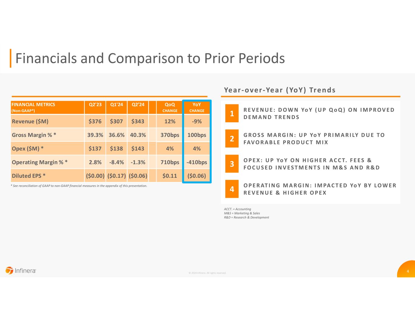 3© 2024 Infinera. All rights reserved. Q2’24 Highlights F I N A N C I A L S REVENUE UP 12% QoQ (DOWN 9% YoY) BOOKINGS UP QoQ and YoY; BOOK-TO-BILL > 1 GROSS MARGIN UP 160BPS YoY (+100BPS YoY ON A NON-GAAP* BASIS) YoY REVENUE GROWTH ACROSS GX PORTFOLIO 800G ZR/ZR+ ICE-X PLUGGABLE WIN WITH ANOTHER MAJOR ICP DESIGN WIN MOMENTUM WITH NEXT-GEN OPEN LINE SYSTEM S O L U T I O N S BROAD-BASED STRENGTH ACROSS ICPs DESIGN WIN MOMENTUM IN SUBSEA AND MOFN SEQUENTIAL RECOVERY IN U.S. AFTER SLOW START IN Q1’24 C U S T O M E R S U C C E S S * See reconciliation of GAAP to non-GAAP financial measures in the appendix of this presentation. PROPOSED ACQUISITION OF INFINERA BY NOKIA VERTICAL INTEGRATION CAPABILITIES U.S.-BASED SEMICONDUCTOR FAB & PACKAGING FACILITIES SUPPLY CHAIN SECURITY V A L U E D R I V E R S ICP = Internet Content Provider MOFN = Managed Fiber Optical Network