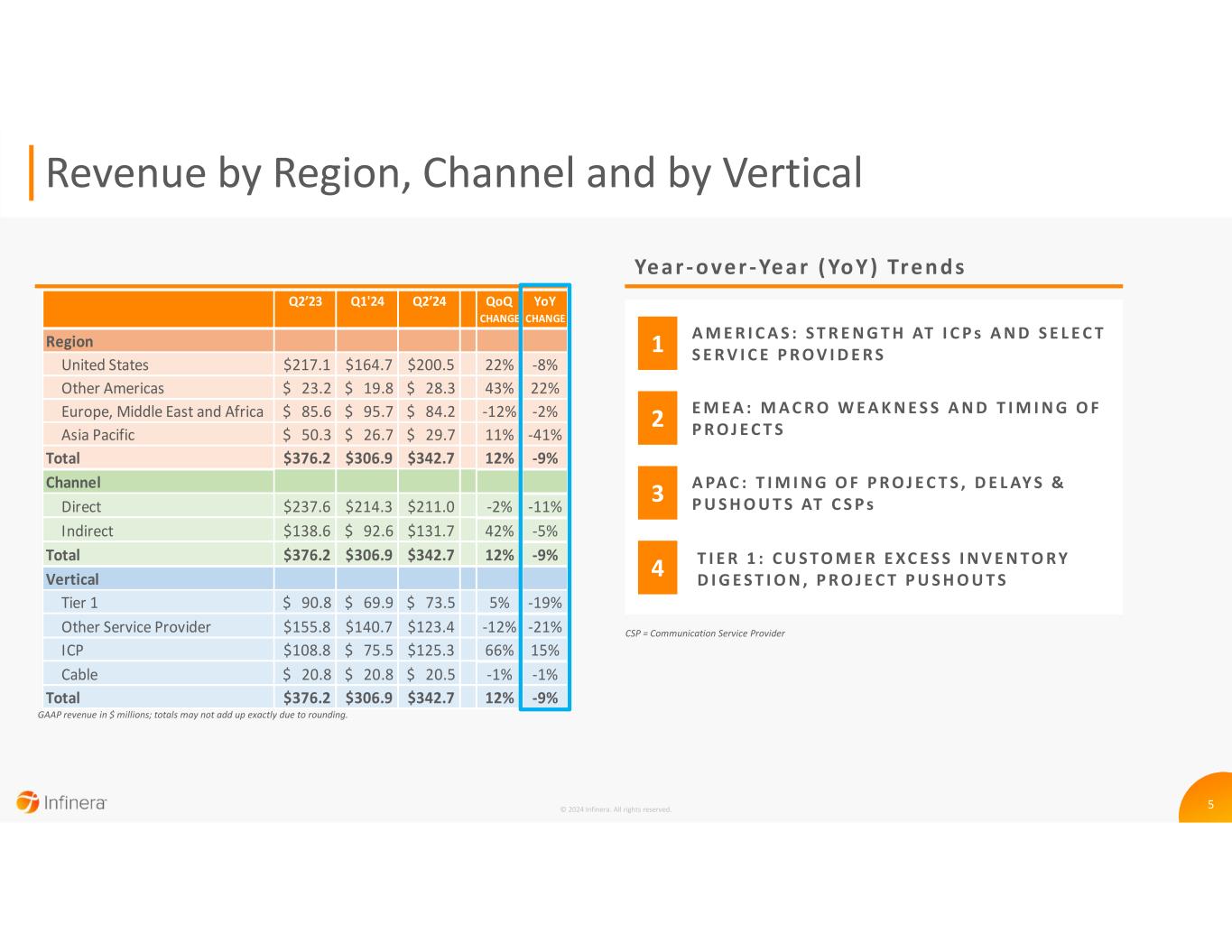 4 FINANCIAL METRICS QoQ YoY (Non-GAAP*) CHANGE CHANGE Revenue ($M) $376 $307 $343 12% -9% Gross Margin % * 39.3% 36.6% 40.3% 370bps 100bps Opex ($M) * $137 $138 $143 4% 4% Operating Margin % * 2.8% -8.4% -1.3% 710bps -410bps Diluted EPS * ($0.00) ($0.17) ($0.06) $0.11 ($0.06) Q2'23 Q1'24 Q2’24 © 2024 Infinera. All rights reserved. Financials and Comparison to Prior Periods * See reconciliation of GAAP to non-GAAP financial measures in the appendix of this presentation. R E V E N U E : D O W N Yo Y ( U P Q o Q ) O N I M P R O V E D D E M A N D T R E N D S1 G R O S S M A R G I N : U P Yo Y P R I M A R I LY D U E T O FAV O R A B L E P R O D U C T M I X2 O P E R AT I N G M A R G I N : I M PA C T E D Yo Y B Y L O W E R R E V E N U E & H I G H E R O P E X4 O P E X : U P Yo Y O N H I G H E R A C C T. F E E S & F O C U S E D I N V E S T M E N T S I N M & S A N D R & D3 Year - o ver -Year ( YoY) Tren ds ACCT. = Accounting M&S = Marketing & Sales R&D = Research & Development