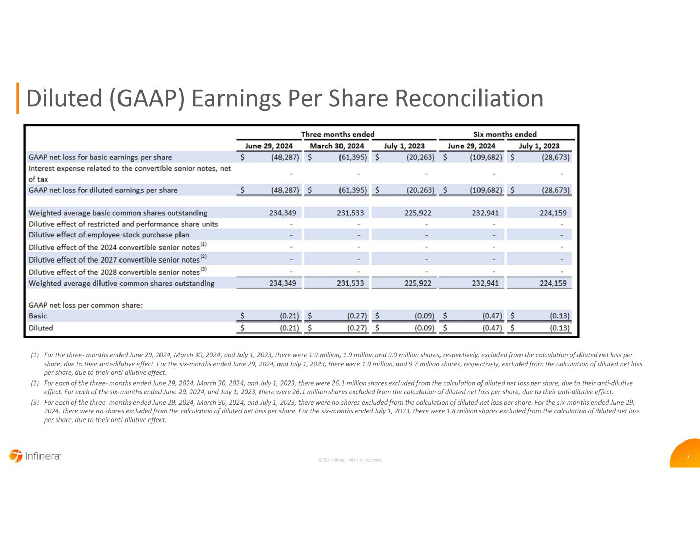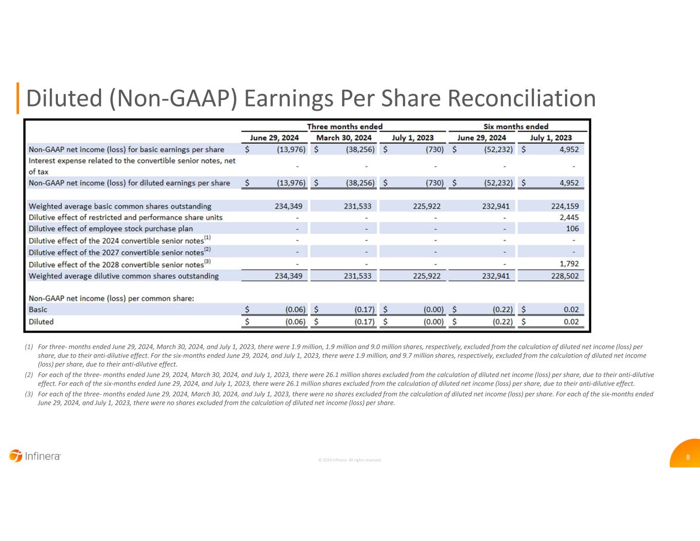 7 Diluted (GAAP) Earnings Per Share Reconciliation © 2024 Infinera. All rights reserved. (1) For the three- months ended June 29, 2024, March 30, 2024, and July 1, 2023, there were 1.9 million, 1.9 million and 9.0 million shares, respectively, excluded from the calculation of diluted net loss per share, due to their anti-dilutive effect. For the six-months ended June 29, 2024, and July 1, 2023, there were 1.9 million, and 9.7 million shares, respectively, excluded from the calculation of diluted net loss per share, due to their anti-dilutive effect. (2) For each of the three- months ended June 29, 2024, March 30, 2024, and July 1, 2023, there were 26.1 million shares excluded from the calculation of diluted net loss per share, due to their anti-dilutive effect. For each of the six-months ended June 29, 2024, and July 1, 2023, there were 26.1 million shares excluded from the calculation of diluted net loss per share, due to their anti-dilutive effect. (3) For each of the three- months ended June 29, 2024, March 30, 2024, and July 1, 2023, there were no shares excluded from the calculation of diluted net loss per share. For the six-months ended June 29, 2024, there were no shares excluded from the calculation of diluted net loss per share. For the six-months ended July 1, 2023, there were 1.8 million shares excluded from the calculation of diluted net loss per share, due to their anti-dilutive effect.