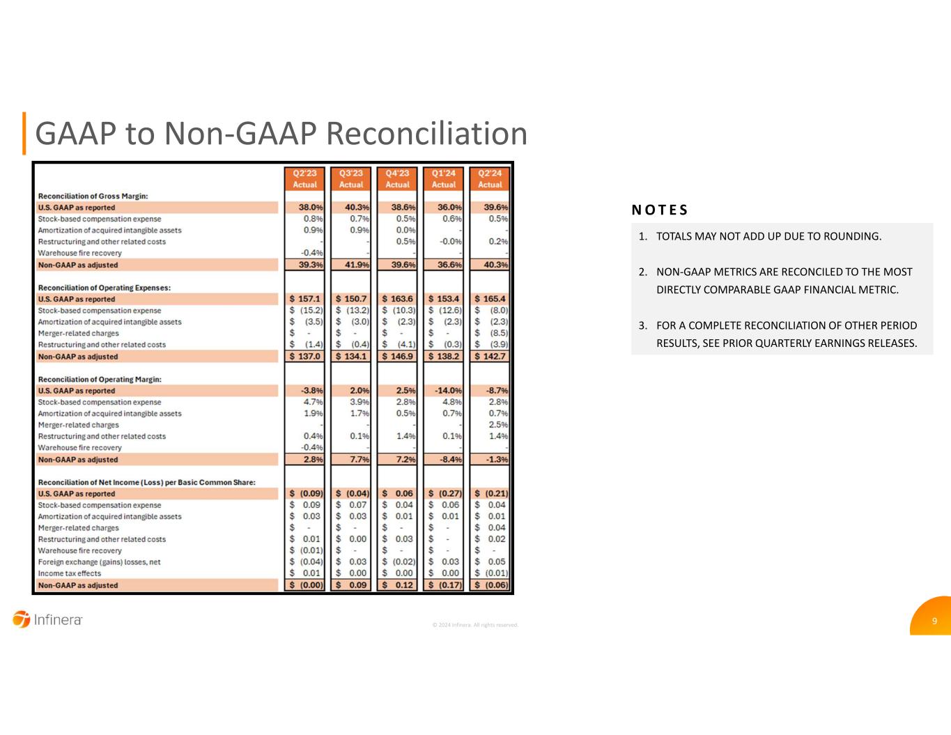 9 GAAP to Non-GAAP Reconciliation 1. TOTALS MAY NOT ADD UP DUE TO ROUNDING. 2. NON-GAAP METRICS ARE RECONCILED TO THE MOST DIRECTLY COMPARABLE GAAP FINANCIAL METRIC. 3. FOR A COMPLETE RECONCILIATION OF OTHER PERIOD RESULTS, SEE PRIOR QUARTERLY EARNINGS RELEASES. N O T E S © 2024 Infinera. All rights reserved.