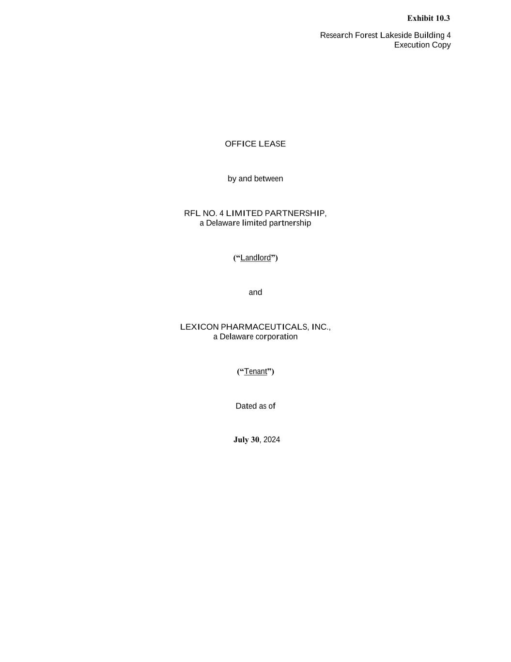 Research Forest Lakeside Building 4 Execution Copy OFFICE LEASE by and between RFL NO. 4 LIMITED PARTNERSHIP, a Delaware limited partnership (“Landlord”) and LEXICON PHARMACEUTICALS, INC., a Delaware corporation (“Tenant”) Dated as of July 30, 2024 Exhibit 10.3