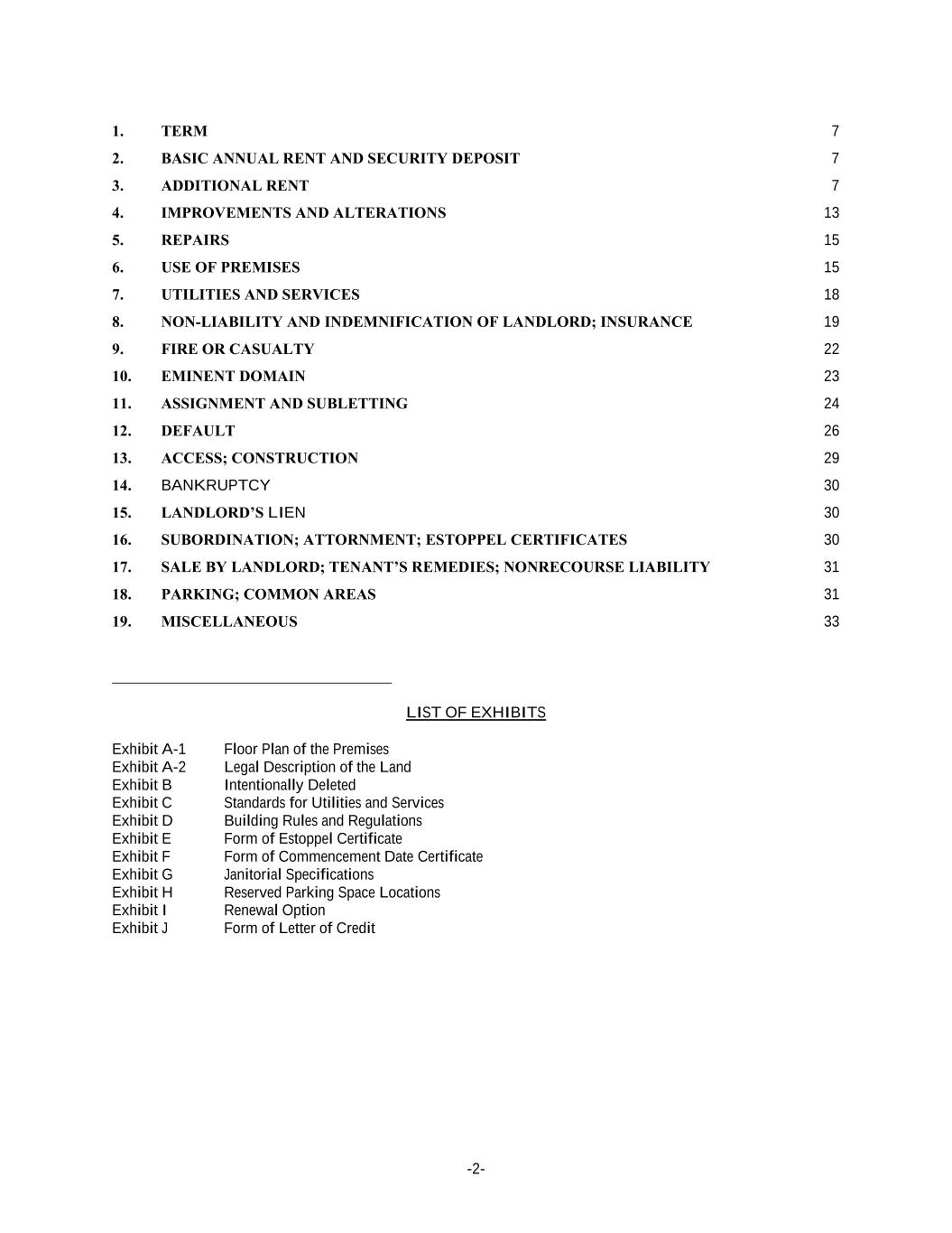 -2- 1. TERM 7 2. BASIC ANNUAL RENT AND SECURITY DEPOSIT 7 3. ADDITIONAL RENT 7 4. IMPROVEMENTS AND ALTERATIONS 13 5. REPAIRS 15 6. USE OF PREMISES 15 7. UTILITIES AND SERVICES 18 8. NON-LIABILITY AND INDEMNIFICATION OF LANDLORD; INSURANCE 19 9. FIRE OR CASUALTY 22 10. EMINENT DOMAIN 23 11. ASSIGNMENT AND SUBLETTING 24 12. DEFAULT 26 13. ACCESS; CONSTRUCTION 29 14. BANKRUPTCY 30 15. LANDLORD’S LIEN 30 16. SUBORDINATION; ATTORNMENT; ESTOPPEL CERTIFICATES 30 17. SALE BY LANDLORD; TENANT’S REMEDIES; NONRECOURSE LIABILITY 31 18. PARKING; COMMON AREAS 31 19. MISCELLANEOUS 33 LIST OF EXHIBITS Exhibit A-1 Floor Plan of the Premises Exhibit A-2 Legal Description of the Land Exhibit B Intentionally Deleted Exhibit C Standards for Utilities and Services Exhibit D Building Rules and Regulations Exhibit E Form of Estoppel Certificate Exhibit F Form of Commencement Date Certificate Exhibit G Janitorial Specifications Exhibit H Reserved Parking Space Locations Exhibit I Renewal Option Exhibit J Form of Letter of Credit