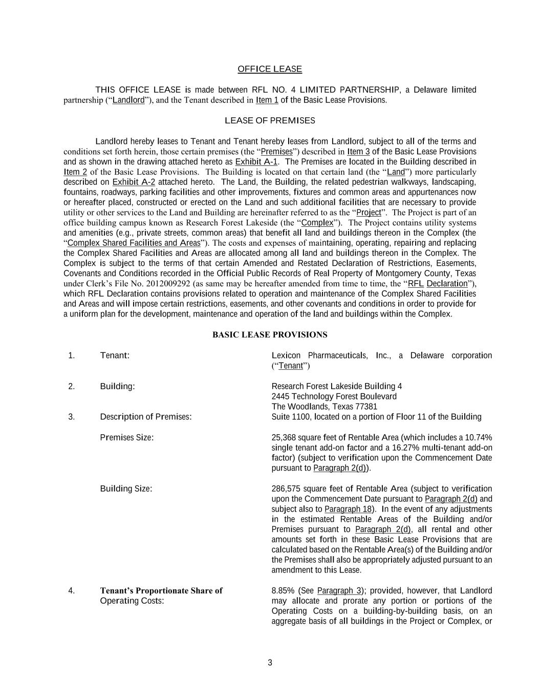 3 OFFICE LEASE THIS OFFICE LEASE is made between RFL NO. 4 LIMITED PARTNERSHIP, a Delaware limited partnership (“Landlord”), and the Tenant described in Item 1 of the Basic Lease Provisions. LEASE OF PREMISES Landlord hereby leases to Tenant and Tenant hereby leases from Landlord, subject to all of the terms and conditions set forth herein, those certain premises (the “Premises”) described in Item 3 of the Basic Lease Provisions and as shown in the drawing attached hereto as Exhibit A-1. The Premises are located in the Building described in Item 2 of the Basic Lease Provisions. The Building is located on that certain land (the “Land”) more particularly described on Exhibit A-2 attached hereto. The Land, the Building, the related pedestrian walkways, landscaping, fountains, roadways, parking facilities and other improvements, fixtures and common areas and appurtenances now or hereafter placed, constructed or erected on the Land and such additional facilities that are necessary to provide utility or other services to the Land and Building are hereinafter referred to as the “Project”. The Project is part of an office building campus known as Research Forest Lakeside (the “Complex”). The Project contains utility systems and amenities (e.g., private streets, common areas) that benefit all land and buildings thereon in the Complex (the “Complex Shared Facilities and Areas”). The costs and expenses of maintaining, operating, repairing and replacing the Complex Shared Facilities and Areas are allocated among all land and buildings thereon in the Complex. The Complex is subject to the terms of that certain Amended and Restated Declaration of Restrictions, Easements, Covenants and Conditions recorded in the Official Public Records of Real Property of Montgomery County, Texas under Clerk’s File No. 2012009292 (as same may be hereafter amended from time to time, the “RFL Declaration”), which RFL Declaration contains provisions related to operation and maintenance of the Complex Shared Facilities and Areas and will impose certain restrictions, easements, and other covenants and conditions in order to provide for a uniform plan for the development, maintenance and operation of the land and buildings within the Complex. BASIC LEASE PROVISIONS 1. Tenant: Lexicon Pharmaceuticals, Inc., a Delaware corporation (“Tenant”) 2. Building: Research Forest Lakeside Building 4 2445 Technology Forest Boulevard The Woodlands, Texas 77381 3. Description of Premises: Suite 1100, located on a portion of Floor 11 of the Building Premises Size: 25,368 square feet of Rentable Area (which includes a 10.74% single tenant add-on factor and a 16.27% multi-tenant add-on factor) (subject to verification upon the Commencement Date pursuant to Paragraph 2(d)). Building Size: 286,575 square feet of Rentable Area (subject to verification upon the Commencement Date pursuant to Paragraph 2(d) and subject also to Paragraph 18). In the event of any adjustments in the estimated Rentable Areas of the Building and/or Premises pursuant to Paragraph 2(d), all rental and other amounts set forth in these Basic Lease Provisions that are calculated based on the Rentable Area(s) of the Building and/or the Premises shall also be appropriately adjusted pursuant to an amendment to this Lease. 4. Tenant’s Proportionate Share of Operating Costs: 8.85% (See Paragraph 3); provided, however, that Landlord may allocate and prorate any portion or portions of the Operating Costs on a building-by-building basis, on an aggregate basis of all buildings in the Project or Complex, or