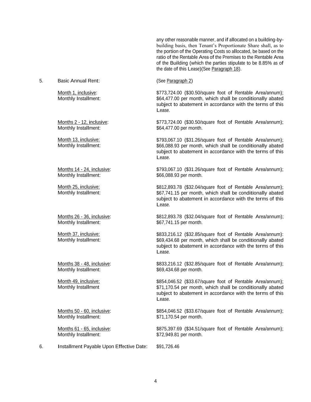 4 any other reasonable manner, and if allocated on a building-by- building basis, then Tenant’s Proportionate Share shall, as to the portion of the Operating Costs so allocated, be based on the ratio of the Rentable Area of the Premises to the Rentable Area of the Building (which the parties stipulate to be 8.85% as of the date of this Lease)(See Paragraph 18). 5. Basic Annual Rent: (See Paragraph 2) Month 1, inclusive: Monthly Installment: $773,724.00 ($30.50/square foot of Rentable Area/annum); $64,477.00 per month, which shall be conditionally abated subject to abatement in accordance with the terms of this Lease. Months 2 - 12, inclusive: Monthly Installment: Month 13, inclusive: Monthly Installment: $773,724.00 ($30.50/square foot of Rentable Area/annum); $64,477.00 per month. $793,067.10 ($31.26/square foot of Rentable Area/annum); $66,088.93 per month, which shall be conditionally abated subject to abatement in accordance with the terms of this Lease. Months 14 - 24, inclusive: Monthly Installment: Month 25, inclusive: Monthly Installment: $793,067.10 ($31.26/square foot of Rentable Area/annum); $66,088.93 per month. $812,893.78 ($32.04/square foot of Rentable Area/annum); $67,741.15 per month, which shall be conditionally abated subject to abatement in accordance with the terms of this Lease. Months 26 - 36, inclusive: Monthly Installment: Month 37, inclusive: Monthly Installment: $812,893.78 ($32.04/square foot of Rentable Area/annum); $67,741.15 per month. $833,216.12 ($32.85/square foot of Rentable Area/annum): $69,434.68 per month, which shall be conditionally abated subject to abatement in accordance with the terms of this Lease. Months 38 - 48, inclusive: Monthly Installment: Month 49, inclusive: Monthly Installment $833,216.12 ($32.85/square foot of Rentable Area/annum); $69,434.68 per month. $854,046.52 ($33.67/square foot of Rentable Area/annum); $71,170.54 per month, which shall be conditionally abated subject to abatement in accordance with the terms of this Lease. Months 50 - 60, inclusive: Monthly Installment: $854,046.52 ($33.67/square foot of Rentable Area/annum); $71,170.54 per month. Months 61 - 65, inclusive: Monthly Installment: $875,397.69 ($34.51/square foot of Rentable Area/annum); $72,949.81 per month. 6. Installment Payable Upon Effective Date: $91,726.46