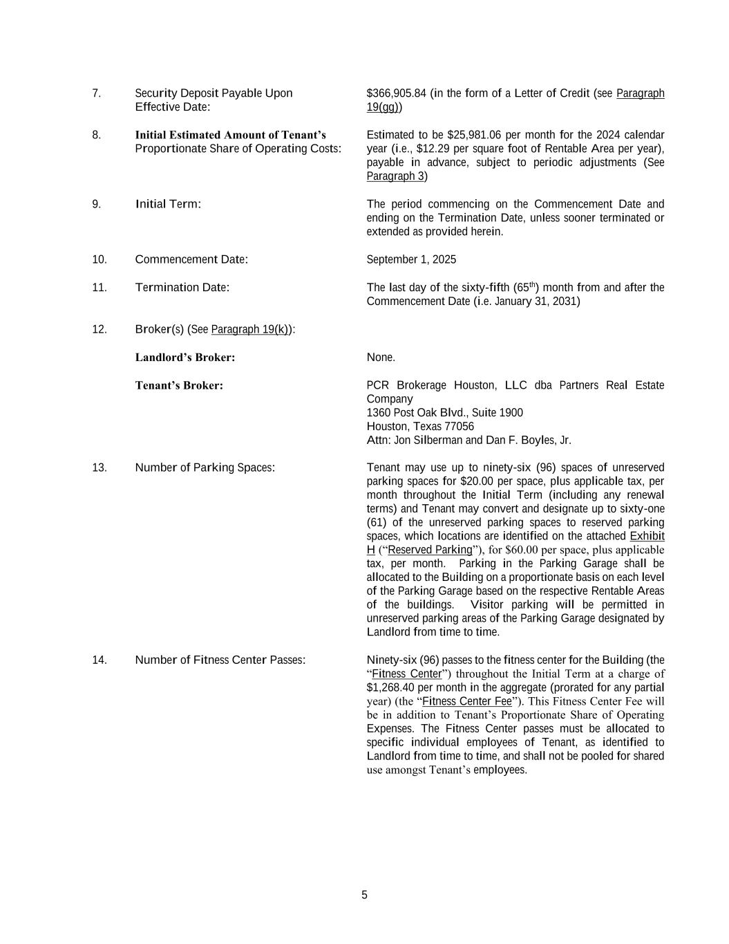 5 7. Security Deposit Payable Upon Effective Date: $366,905.84 (in the form of a Letter of Credit (see Paragraph 19(gg)) 8. Initial Estimated Amount of Tenant’s Proportionate Share of Operating Costs: Estimated to be $25,981.06 per month for the 2024 calendar year (i.e., $12.29 per square foot of Rentable Area per year), payable in advance, subject to periodic adjustments (See Paragraph 3) 9. Initial Term: The period commencing on the Commencement Date and ending on the Termination Date, unless sooner terminated or extended as provided herein. 10. Commencement Date: September 1, 2025 11. Termination Date: The last day of the sixty-fifth (65th) month from and after the Commencement Date (i.e. January 31, 2031) 12. Broker(s) (See Paragraph 19(k)): Landlord’s Broker: None. Tenant’s Broker: PCR Brokerage Houston, LLC dba Partners Real Estate Company 1360 Post Oak Blvd., Suite 1900 Houston, Texas 77056 Attn: Jon Silberman and Dan F. Boyles, Jr. 13. Number of Parking Spaces: Tenant may use up to ninety-six (96) spaces of unreserved parking spaces for $20.00 per space, plus applicable tax, per month throughout the Initial Term (including any renewal terms) and Tenant may convert and designate up to sixty-one (61) of the unreserved parking spaces to reserved parking spaces, which locations are identified on the attached Exhibit H (“Reserved Parking”), for $60.00 per space, plus applicable tax, per month. Parking in the Parking Garage shall be allocated to the Building on a proportionate basis on each level of the Parking Garage based on the respective Rentable Areas of the buildings. Visitor parking will be permitted in unreserved parking areas of the Parking Garage designated by Landlord from time to time. 14. Number of Fitness Center Passes: Ninety-six (96) passes to the fitness center for the Building (the “Fitness Center”) throughout the Initial Term at a charge of $1,268.40 per month in the aggregate (prorated for any partial year) (the “Fitness Center Fee”). This Fitness Center Fee will be in addition to Tenant’s Proportionate Share of Operating Expenses. The Fitness Center passes must be allocated to specific individual employees of Tenant, as identified to Landlord from time to time, and shall not be pooled for shared use amongst Tenant’s employees.