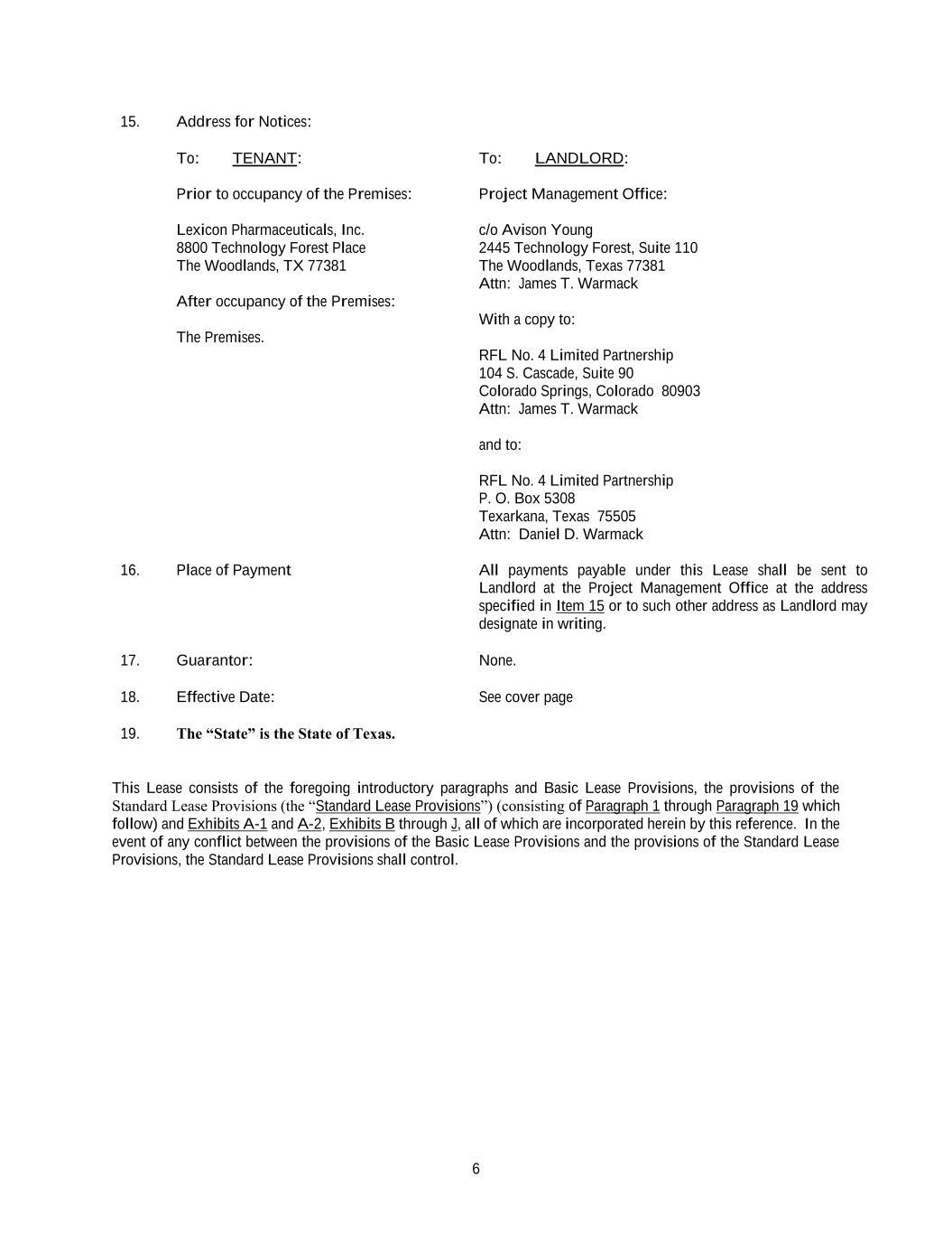 6 15. Address for Notices: To: TENANT: Prior to occupancy of the Premises: Lexicon Pharmaceuticals, Inc. 8800 Technology Forest Place The Woodlands, TX 77381 After occupancy of the Premises: The Premises. To: LANDLORD: Project Management Office: c/o Avison Young 2445 Technology Forest, Suite 110 The Woodlands, Texas 77381 Attn: James T. Warmack With a copy to: RFL No. 4 Limited Partnership 104 S. Cascade, Suite 90 Colorado Springs, Colorado 80903 Attn: James T. Warmack and to: RFL No. 4 Limited Partnership P. O. Box 5308 Texarkana, Texas 75505 Attn: Daniel D. Warmack 16. Place of Payment All payments payable under this Lease shall be sent to Landlord at the Project Management Office at the address specified in Item 15 or to such other address as Landlord may designate in writing. 17. Guarantor: None. 18. Effective Date: See cover page 19. The “State” is the State of Texas. This Lease consists of the foregoing introductory paragraphs and Basic Lease Provisions, the provisions of the Standard Lease Provisions (the “Standard Lease Provisions”) (consisting of Paragraph 1 through Paragraph 19 which follow) and Exhibits A-1 and A-2, Exhibits B through J, all of which are incorporated herein by this reference. In the event of any conflict between the provisions of the Basic Lease Provisions and the provisions of the Standard Lease Provisions, the Standard Lease Provisions shall control.