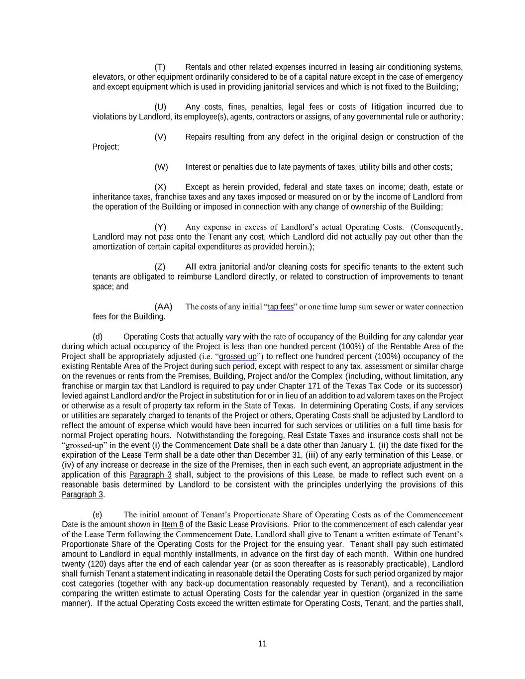 11 (T) Rentals and other related expenses incurred in leasing air conditioning systems, elevators, or other equipment ordinarily considered to be of a capital nature except in the case of emergency and except equipment which is used in providing janitorial services and which is not fixed to the Building; (U) Any costs, fines, penalties, legal fees or costs of litigation incurred due to violations by Landlord, its employee(s), agents, contractors or assigns, of any governmental rule or authority; (V) Repairs resulting from any defect in the original design or construction of the Project; (W) Interest or penalties due to late payments of taxes, utility bills and other costs; (X) Except as herein provided, federal and state taxes on income; death, estate or inheritance taxes, franchise taxes and any taxes imposed or measured on or by the income of Landlord from the operation of the Building or imposed in connection with any change of ownership of the Building; (Y) Any expense in excess of Landlord’s actual Operating Costs. (Consequently, Landlord may not pass onto the Tenant any cost, which Landlord did not actually pay out other than the amortization of certain capital expenditures as provided herein.); (Z) All extra janitorial and/or cleaning costs for specific tenants to the extent such tenants are obligated to reimburse Landlord directly, or related to construction of improvements to tenant space; and (AA) The costs of any initial “tap fees” or one time lump sum sewer or water connection fees for the Building. (d) Operating Costs that actually vary with the rate of occupancy of the Building for any calendar year during which actual occupancy of the Project is less than one hundred percent (100%) of the Rentable Area of the Project shall be appropriately adjusted (i.e. “grossed up”) to reflect one hundred percent (100%) occupancy of the existing Rentable Area of the Project during such period, except with respect to any tax, assessment or similar charge on the revenues or rents from the Premises, Building, Project and/or the Complex (including, without limitation, any franchise or margin tax that Landlord is required to pay under Chapter 171 of the Texas Tax Code or its successor) levied against Landlord and/or the Project in substitution for or in lieu of an addition to ad valorem taxes on the Project or otherwise as a result of property tax reform in the State of Texas. In determining Operating Costs, if any services or utilities are separately charged to tenants of the Project or others, Operating Costs shall be adjusted by Landlord to reflect the amount of expense which would have been incurred for such services or utilities on a full time basis for normal Project operating hours. Notwithstanding the foregoing, Real Estate Taxes and insurance costs shall not be “grossed-up” in the event (i) the Commencement Date shall be a date other than January 1, (ii) the date fixed for the expiration of the Lease Term shall be a date other than December 31, (iii) of any early termination of this Lease, or (iv) of any increase or decrease in the size of the Premises, then in each such event, an appropriate adjustment in the application of this Paragraph 3 shall, subject to the provisions of this Lease, be made to reflect such event on a reasonable basis determined by Landlord to be consistent with the principles underlying the provisions of this Paragraph 3. (e) The initial amount of Tenant’s Proportionate Share of Operating Costs as of the Commencement Date is the amount shown in Item 8 of the Basic Lease Provisions. Prior to the commencement of each calendar year of the Lease Term following the Commencement Date, Landlord shall give to Tenant a written estimate of Tenant’s Proportionate Share of the Operating Costs for the Project for the ensuing year. Tenant shall pay such estimated amount to Landlord in equal monthly installments, in advance on the first day of each month. Within one hundred twenty (120) days after the end of each calendar year (or as soon thereafter as is reasonably practicable), Landlord shall furnish Tenant a statement indicating in reasonable detail the Operating Costs for such period organized by major cost categories (together with any back-up documentation reasonably requested by Tenant), and a reconciliation comparing the written estimate to actual Operating Costs for the calendar year in question (organized in the same manner). If the actual Operating Costs exceed the written estimate for Operating Costs, Tenant, and the parties shall,