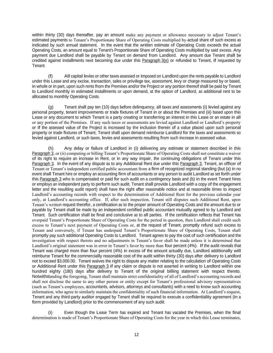 12 within thirty (30) days thereafter, pay an amount make any payment or allowance necessary to adjust Tenant’s estimated payments to Tenant’s Proportionate Share of Operating Costs multiplied by actual share of such excess as indicated by such annual statement. In the event that the written estimate of Operating Costs exceeds the actual Operating Costs, an amount equal to Tenant's Proportionate Share of Operating Costs multiplied by said excess. Any payment due Landlord shall be payable by Tenant on demand from Landlord. Any amount due Tenant shall be credited against installments next becoming due under this Paragraph 3(e) or refunded to Tenant, if requested by Tenant. (f) All capital levies or other taxes assessed or imposed on Landlord upon the rents payable to Landlord under this Lease and any excise, transaction, sales or privilege tax, assessment, levy or charge measured by or based, in whole or in part, upon such rents from the Premises and/or the Project or any portion thereof shall be paid by Tenant to Landlord monthly in estimated installments or upon demand, at the option of Landlord, as additional rent to be allocated to monthly Operating Costs. (g) Tenant shall pay ten (10) days before delinquency, all taxes and assessments (i) levied against any personal property, tenant improvements or trade fixtures of Tenant in or about the Premises and (ii) based upon this Lease or any document to which Tenant is a party creating or transferring an interest in this Lease or an estate in all or any portion of the Premises. If any such taxes or assessments are levied against Landlord or Landlord’s property or if the assessed value of the Project is increased by the inclusion therein of a value placed upon such personal property or trade fixtures of Tenant, Tenant shall upon demand reimburse Landlord for the taxes and assessments so levied against Landlord, or such taxes, levies and assessments resulting from such increase in assessed value. (h) Any delay or failure of Landlord in (i) delivering any estimate or statement described in this Paragraph 3, or (ii) computing or billing Tenant’s Proportionate Share of Operating Costs shall not constitute a waiver of its right to require an increase in Rent, or in any way impair, the continuing obligations of Tenant under this Paragraph 3. In the event of any dispute as to any Additional Rent due under this Paragraph 3, Tenant, an officer of Tenant or Tenant’s independent certified public accountant from a firm of recognized regional standing (but (a) in no event shall Tenant hire or employ an accounting firm of accountants or any person to audit Landlord as set forth under this Paragraph 3 who is compensated or paid for such audit on a contingency basis and (b) in the event Tenant hires or employs an independent party to perform such audit, Tenant shall provide Landlord with a copy of the engagement letter and the resulting audit report) shall have the right after reasonable notice and at reasonable times to inspect Landlord’s accounting records with respect to the determination of Additional Rent for the previous calendar year only, at Landlord’s accounting office. If, after such inspection, Tenant still disputes such Additional Rent, upon Tenant’s written request therefor, a certification as to the proper amount of Operating Costs and the amount due to or payable by Tenant shall be made by an independent certified public accountant mutually agreed to by Landlord and Tenant. Such certification shall be final and conclusive as to all parties. If the certification reflects that Tenant has overpaid Tenant’s Proportionate Share of Operating Costs for the period in question, then Landlord shall credit such excess to Tenant’s next payment of Operating Costs or, at the request of Tenant, promptly refund such excess to Tenant and conversely, if Tenant has underpaid Tenant’s Proportionate Share of Operating Costs, Tenant shall promptly pay such additional Operating Costs to Landlord. Tenant agrees to pay the cost of such certification and the investigation with respect thereto and no adjustments in Tenant’s favor shall be made unless it is determined that Landlord’s original statement was in error in Tenant’s favor by more than four percent (4%). If the audit reveals that Tenant was charged more than four percent (4%) in excess of the amount actually due, Landlord additionally will reimburse Tenant for the commercially reasonable cost of the audit within thirty (30) days after delivery to Landlord not to exceed $3,000.00. Tenant waives the right to dispute any matter relating to the calculation of Operating Costs or Additional Rent under this Paragraph 3 if any claim or dispute is not asserted in writing to Landlord within one hundred eighty (180) days after delivery to Tenant of the original billing statement with respect thereto. Notwithstanding the foregoing, Tenant shall maintain strict confidentiality of all of Landlord’s accounting records and shall not disclose the same to any other person or entity except for Tenant’s professional advisory representatives (such as Tenant’s employees, accountants, advisors, attorneys and consultants) with a need to know such accounting information, who agree to similarly maintain the confidentiality of such financial information. At Landlord’s request, Tenant and any third-party auditor engaged by Tenant shall be required to execute a confidentiality agreement (in a form provided by Landlord) prior to the commencement of any such audit. (i) Even though the Lease Term has expired and Tenant has vacated the Premises, when the final determination is made of Tenant’s Proportionate Share of Operating Costs for the year in which this Lease terminates,