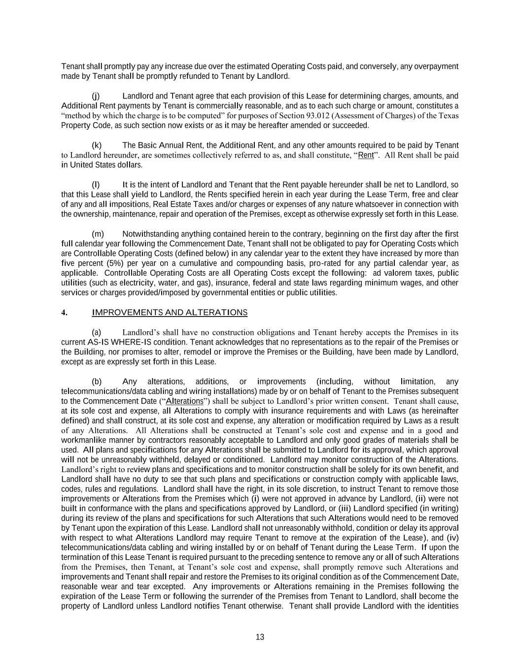 13 Tenant shall promptly pay any increase due over the estimated Operating Costs paid, and conversely, any overpayment made by Tenant shall be promptly refunded to Tenant by Landlord. (j) Landlord and Tenant agree that each provision of this Lease for determining charges, amounts, and Additional Rent payments by Tenant is commercially reasonable, and as to each such charge or amount, constitutes a “method by which the charge is to be computed” for purposes of Section 93.012 (Assessment of Charges) of the Texas Property Code, as such section now exists or as it may be hereafter amended or succeeded. (k) The Basic Annual Rent, the Additional Rent, and any other amounts required to be paid by Tenant to Landlord hereunder, are sometimes collectively referred to as, and shall constitute, “Rent”. All Rent shall be paid in United States dollars. (l) It is the intent of Landlord and Tenant that the Rent payable hereunder shall be net to Landlord, so that this Lease shall yield to Landlord, the Rents specified herein in each year during the Lease Term, free and clear of any and all impositions, Real Estate Taxes and/or charges or expenses of any nature whatsoever in connection with the ownership, maintenance, repair and operation of the Premises, except as otherwise expressly set forth in this Lease. (m) Notwithstanding anything contained herein to the contrary, beginning on the first day after the first full calendar year following the Commencement Date, Tenant shall not be obligated to pay for Operating Costs which are Controllable Operating Costs (defined below) in any calendar year to the extent they have increased by more than five percent (5%) per year on a cumulative and compounding basis, pro-rated for any partial calendar year, as applicable. Controllable Operating Costs are all Operating Costs except the following: ad valorem taxes, public utilities (such as electricity, water, and gas), insurance, federal and state laws regarding minimum wages, and other services or charges provided/imposed by governmental entities or public utilities. 4. IMPROVEMENTS AND ALTERATIONS (a) Landlord’s shall have no construction obligations and Tenant hereby accepts the Premises in its current AS-IS WHERE-IS condition. Tenant acknowledges that no representations as to the repair of the Premises or the Building, nor promises to alter, remodel or improve the Premises or the Building, have been made by Landlord, except as are expressly set forth in this Lease. (b) Any alterations, additions, or improvements (including, without limitation, any telecommunications/data cabling and wiring installations) made by or on behalf of Tenant to the Premises subsequent to the Commencement Date (“Alterations”) shall be subject to Landlord’s prior written consent. Tenant shall cause, at its sole cost and expense, all Alterations to comply with insurance requirements and with Laws (as hereinafter defined) and shall construct, at its sole cost and expense, any alteration or modification required by Laws as a result of any Alterations. All Alterations shall be constructed at Tenant’s sole cost and expense and in a good and workmanlike manner by contractors reasonably acceptable to Landlord and only good grades of materials shall be used. All plans and specifications for any Alterations shall be submitted to Landlord for its approval, which approval will not be unreasonably withheld, delayed or conditioned. Landlord may monitor construction of the Alterations. Landlord’s right to review plans and specifications and to monitor construction shall be solely for its own benefit, and Landlord shall have no duty to see that such plans and specifications or construction comply with applicable laws, codes, rules and regulations. Landlord shall have the right, in its sole discretion, to instruct Tenant to remove those improvements or Alterations from the Premises which (i) were not approved in advance by Landlord, (ii) were not built in conformance with the plans and specifications approved by Landlord, or (iii) Landlord specified (in writing) during its review of the plans and specifications for such Alterations that such Alterations would need to be removed by Tenant upon the expiration of this Lease. Landlord shall not unreasonably withhold, condition or delay its approval with respect to what Alterations Landlord may require Tenant to remove at the expiration of the Lease), and (iv) telecommunications/data cabling and wiring installed by or on behalf of Tenant during the Lease Term. If upon the termination of this Lease Tenant is required pursuant to the preceding sentence to remove any or all of such Alterations from the Premises, then Tenant, at Tenant’s sole cost and expense, shall promptly remove such Alterations and improvements and Tenant shall repair and restore the Premises to its original condition as of the Commencement Date, reasonable wear and tear excepted. Any improvements or Alterations remaining in the Premises following the expiration of the Lease Term or following the surrender of the Premises from Tenant to Landlord, shall become the property of Landlord unless Landlord notifies Tenant otherwise. Tenant shall provide Landlord with the identities