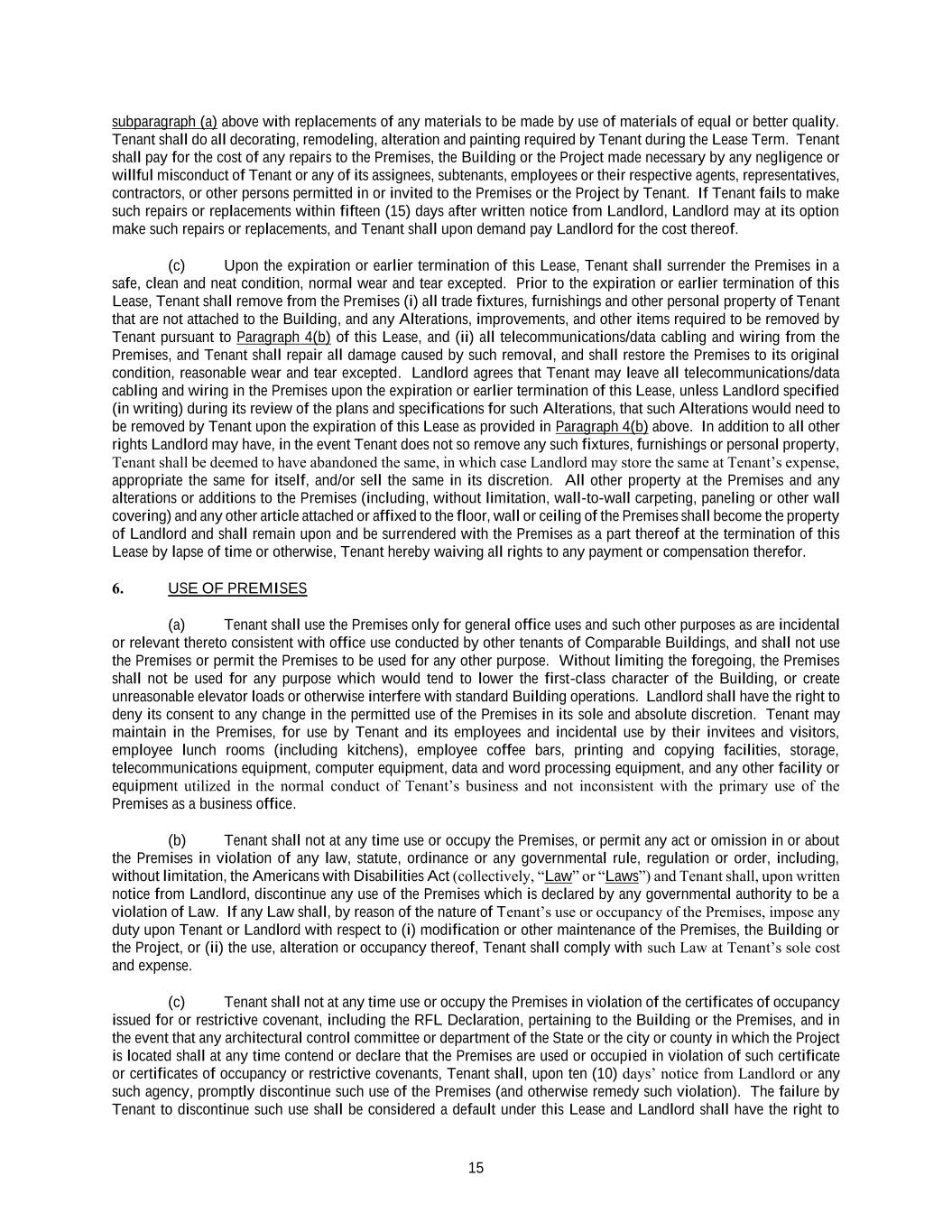 15 subparagraph (a) above with replacements of any materials to be made by use of materials of equal or better quality. Tenant shall do all decorating, remodeling, alteration and painting required by Tenant during the Lease Term. Tenant shall pay for the cost of any repairs to the Premises, the Building or the Project made necessary by any negligence or willful misconduct of Tenant or any of its assignees, subtenants, employees or their respective agents, representatives, contractors, or other persons permitted in or invited to the Premises or the Project by Tenant. If Tenant fails to make such repairs or replacements within fifteen (15) days after written notice from Landlord, Landlord may at its option make such repairs or replacements, and Tenant shall upon demand pay Landlord for the cost thereof. (c) Upon the expiration or earlier termination of this Lease, Tenant shall surrender the Premises in a safe, clean and neat condition, normal wear and tear excepted. Prior to the expiration or earlier termination of this Lease, Tenant shall remove from the Premises (i) all trade fixtures, furnishings and other personal property of Tenant that are not attached to the Building, and any Alterations, improvements, and other items required to be removed by Tenant pursuant to Paragraph 4(b) of this Lease, and (ii) all telecommunications/data cabling and wiring from the Premises, and Tenant shall repair all damage caused by such removal, and shall restore the Premises to its original condition, reasonable wear and tear excepted. Landlord agrees that Tenant may leave all telecommunications/data cabling and wiring in the Premises upon the expiration or earlier termination of this Lease, unless Landlord specified (in writing) during its review of the plans and specifications for such Alterations, that such Alterations would need to be removed by Tenant upon the expiration of this Lease as provided in Paragraph 4(b) above. In addition to all other rights Landlord may have, in the event Tenant does not so remove any such fixtures, furnishings or personal property, Tenant shall be deemed to have abandoned the same, in which case Landlord may store the same at Tenant’s expense, appropriate the same for itself, and/or sell the same in its discretion. All other property at the Premises and any alterations or additions to the Premises (including, without limitation, wall-to-wall carpeting, paneling or other wall covering) and any other article attached or affixed to the floor, wall or ceiling of the Premises shall become the property of Landlord and shall remain upon and be surrendered with the Premises as a part thereof at the termination of this Lease by lapse of time or otherwise, Tenant hereby waiving all rights to any payment or compensation therefor. 6. USE OF PREMISES (a) Tenant shall use the Premises only for general office uses and such other purposes as are incidental or relevant thereto consistent with office use conducted by other tenants of Comparable Buildings, and shall not use the Premises or permit the Premises to be used for any other purpose. Without limiting the foregoing, the Premises shall not be used for any purpose which would tend to lower the first-class character of the Building, or create unreasonable elevator loads or otherwise interfere with standard Building operations. Landlord shall have the right to deny its consent to any change in the permitted use of the Premises in its sole and absolute discretion. Tenant may maintain in the Premises, for use by Tenant and its employees and incidental use by their invitees and visitors, employee lunch rooms (including kitchens), employee coffee bars, printing and copying facilities, storage, telecommunications equipment, computer equipment, data and word processing equipment, and any other facility or equipment utilized in the normal conduct of Tenant’s business and not inconsistent with the primary use of the Premises as a business office. (b) Tenant shall not at any time use or occupy the Premises, or permit any act or omission in or about the Premises in violation of any law, statute, ordinance or any governmental rule, regulation or order, including, without limitation, the Americans with Disabilities Act (collectively, “Law” or “Laws”) and Tenant shall, upon written notice from Landlord, discontinue any use of the Premises which is declared by any governmental authority to be a violation of Law. If any Law shall, by reason of the nature of Tenant’s use or occupancy of the Premises, impose any duty upon Tenant or Landlord with respect to (i) modification or other maintenance of the Premises, the Building or the Project, or (ii) the use, alteration or occupancy thereof, Tenant shall comply with such Law at Tenant’s sole cost and expense. (c) Tenant shall not at any time use or occupy the Premises in violation of the certificates of occupancy issued for or restrictive covenant, including the RFL Declaration, pertaining to the Building or the Premises, and in the event that any architectural control committee or department of the State or the city or county in which the Project is located shall at any time contend or declare that the Premises are used or occupied in violation of such certificate or certificates of occupancy or restrictive covenants, Tenant shall, upon ten (10) days’ notice from Landlord or any such agency, promptly discontinue such use of the Premises (and otherwise remedy such violation). The failure by Tenant to discontinue such use shall be considered a default under this Lease and Landlord shall have the right to
