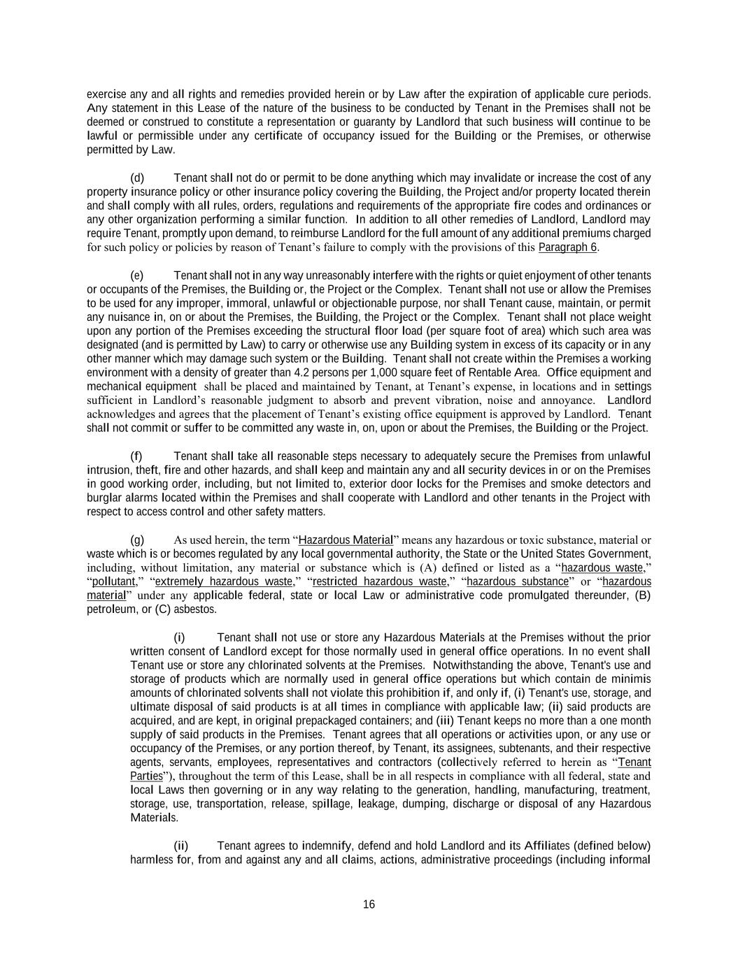 16 exercise any and all rights and remedies provided herein or by Law after the expiration of applicable cure periods. Any statement in this Lease of the nature of the business to be conducted by Tenant in the Premises shall not be deemed or construed to constitute a representation or guaranty by Landlord that such business will continue to be lawful or permissible under any certificate of occupancy issued for the Building or the Premises, or otherwise permitted by Law. (d) Tenant shall not do or permit to be done anything which may invalidate or increase the cost of any property insurance policy or other insurance policy covering the Building, the Project and/or property located therein and shall comply with all rules, orders, regulations and requirements of the appropriate fire codes and ordinances or any other organization performing a similar function. In addition to all other remedies of Landlord, Landlord may require Tenant, promptly upon demand, to reimburse Landlord for the full amount of any additional premiums charged for such policy or policies by reason of Tenant’s failure to comply with the provisions of this Paragraph 6. (e) Tenant shall not in any way unreasonably interfere with the rights or quiet enjoyment of other tenants or occupants of the Premises, the Building or, the Project or the Complex. Tenant shall not use or allow the Premises to be used for any improper, immoral, unlawful or objectionable purpose, nor shall Tenant cause, maintain, or permit any nuisance in, on or about the Premises, the Building, the Project or the Complex. Tenant shall not place weight upon any portion of the Premises exceeding the structural floor load (per square foot of area) which such area was designated (and is permitted by Law) to carry or otherwise use any Building system in excess of its capacity or in any other manner which may damage such system or the Building. Tenant shall not create within the Premises a working environment with a density of greater than 4.2 persons per 1,000 square feet of Rentable Area. Office equipment and mechanical equipment shall be placed and maintained by Tenant, at Tenant’s expense, in locations and in settings sufficient in Landlord’s reasonable judgment to absorb and prevent vibration, noise and annoyance. Landlord acknowledges and agrees that the placement of Tenant’s existing office equipment is approved by Landlord. Tenant shall not commit or suffer to be committed any waste in, on, upon or about the Premises, the Building or the Project. (f) Tenant shall take all reasonable steps necessary to adequately secure the Premises from unlawful intrusion, theft, fire and other hazards, and shall keep and maintain any and all security devices in or on the Premises in good working order, including, but not limited to, exterior door locks for the Premises and smoke detectors and burglar alarms located within the Premises and shall cooperate with Landlord and other tenants in the Project with respect to access control and other safety matters. (g) As used herein, the term “Hazardous Material” means any hazardous or toxic substance, material or waste which is or becomes regulated by any local governmental authority, the State or the United States Government, including, without limitation, any material or substance which is (A) defined or listed as a “hazardous waste,” “pollutant,” “extremely hazardous waste,” “restricted hazardous waste,” “hazardous substance” or “hazardous material” under any applicable federal, state or local Law or administrative code promulgated thereunder, (B) petroleum, or (C) asbestos. (i) Tenant shall not use or store any Hazardous Materials at the Premises without the prior written consent of Landlord except for those normally used in general office operations. In no event shall Tenant use or store any chlorinated solvents at the Premises. Notwithstanding the above, Tenant's use and storage of products which are normally used in general office operations but which contain de minimis amounts of chlorinated solvents shall not violate this prohibition if, and only if, (i) Tenant's use, storage, and ultimate disposal of said products is at all times in compliance with applicable law; (ii) said products are acquired, and are kept, in original prepackaged containers; and (iii) Tenant keeps no more than a one month supply of said products in the Premises. Tenant agrees that all operations or activities upon, or any use or occupancy of the Premises, or any portion thereof, by Tenant, its assignees, subtenants, and their respective agents, servants, employees, representatives and contractors (collectively referred to herein as “Tenant Parties”), throughout the term of this Lease, shall be in all respects in compliance with all federal, state and local Laws then governing or in any way relating to the generation, handling, manufacturing, treatment, storage, use, transportation, release, spillage, leakage, dumping, discharge or disposal of any Hazardous Materials. (ii) Tenant agrees to indemnify, defend and hold Landlord and its Affiliates (defined below) harmless for, from and against any and all claims, actions, administrative proceedings (including informal