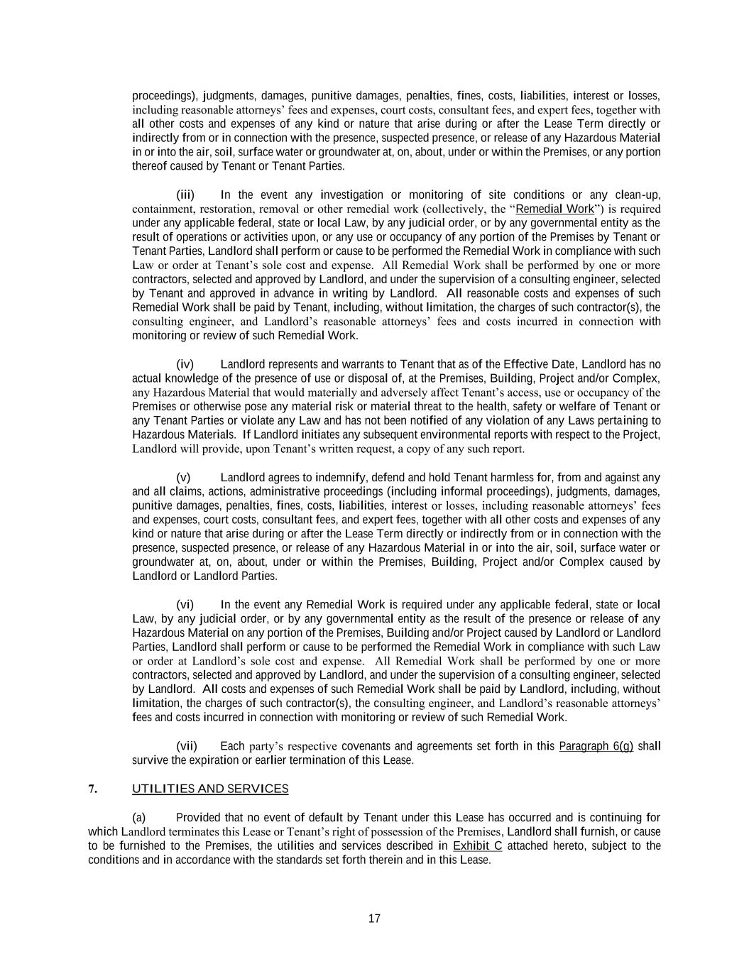 17 proceedings), judgments, damages, punitive damages, penalties, fines, costs, liabilities, interest or losses, including reasonable attorneys’ fees and expenses, court costs, consultant fees, and expert fees, together with all other costs and expenses of any kind or nature that arise during or after the Lease Term directly or indirectly from or in connection with the presence, suspected presence, or release of any Hazardous Material in or into the air, soil, surface water or groundwater at, on, about, under or within the Premises, or any portion thereof caused by Tenant or Tenant Parties. (iii) In the event any investigation or monitoring of site conditions or any clean-up, containment, restoration, removal or other remedial work (collectively, the “Remedial Work”) is required under any applicable federal, state or local Law, by any judicial order, or by any governmental entity as the result of operations or activities upon, or any use or occupancy of any portion of the Premises by Tenant or Tenant Parties, Landlord shall perform or cause to be performed the Remedial Work in compliance with such Law or order at Tenant’s sole cost and expense. All Remedial Work shall be performed by one or more contractors, selected and approved by Landlord, and under the supervision of a consulting engineer, selected by Tenant and approved in advance in writing by Landlord. All reasonable costs and expenses of such Remedial Work shall be paid by Tenant, including, without limitation, the charges of such contractor(s), the consulting engineer, and Landlord’s reasonable attorneys’ fees and costs incurred in connection with monitoring or review of such Remedial Work. (iv) Landlord represents and warrants to Tenant that as of the Effective Date, Landlord has no actual knowledge of the presence of use or disposal of, at the Premises, Building, Project and/or Complex, any Hazardous Material that would materially and adversely affect Tenant’s access, use or occupancy of the Premises or otherwise pose any material risk or material threat to the health, safety or welfare of Tenant or any Tenant Parties or violate any Law and has not been notified of any violation of any Laws pertaining to Hazardous Materials. If Landlord initiates any subsequent environmental reports with respect to the Project, Landlord will provide, upon Tenant’s written request, a copy of any such report. (v) Landlord agrees to indemnify, defend and hold Tenant harmless for, from and against any and all claims, actions, administrative proceedings (including informal proceedings), judgments, damages, punitive damages, penalties, fines, costs, liabilities, interest or losses, including reasonable attorneys’ fees and expenses, court costs, consultant fees, and expert fees, together with all other costs and expenses of any kind or nature that arise during or after the Lease Term directly or indirectly from or in connection with the presence, suspected presence, or release of any Hazardous Material in or into the air, soil, surface water or groundwater at, on, about, under or within the Premises, Building, Project and/or Complex caused by Landlord or Landlord Parties. (vi) In the event any Remedial Work is required under any applicable federal, state or local Law, by any judicial order, or by any governmental entity as the result of the presence or release of any Hazardous Material on any portion of the Premises, Building and/or Project caused by Landlord or Landlord Parties, Landlord shall perform or cause to be performed the Remedial Work in compliance with such Law or order at Landlord’s sole cost and expense. All Remedial Work shall be performed by one or more contractors, selected and approved by Landlord, and under the supervision of a consulting engineer, selected by Landlord. All costs and expenses of such Remedial Work shall be paid by Landlord, including, without limitation, the charges of such contractor(s), the consulting engineer, and Landlord’s reasonable attorneys’ fees and costs incurred in connection with monitoring or review of such Remedial Work. (vii) Each party’s respective covenants and agreements set forth in this Paragraph 6(g) shall survive the expiration or earlier termination of this Lease. 7. UTILITIES AND SERVICES (a) Provided that no event of default by Tenant under this Lease has occurred and is continuing for which Landlord terminates this Lease or Tenant’s right of possession of the Premises, Landlord shall furnish, or cause to be furnished to the Premises, the utilities and services described in Exhibit C attached hereto, subject to the conditions and in accordance with the standards set forth therein and in this Lease.