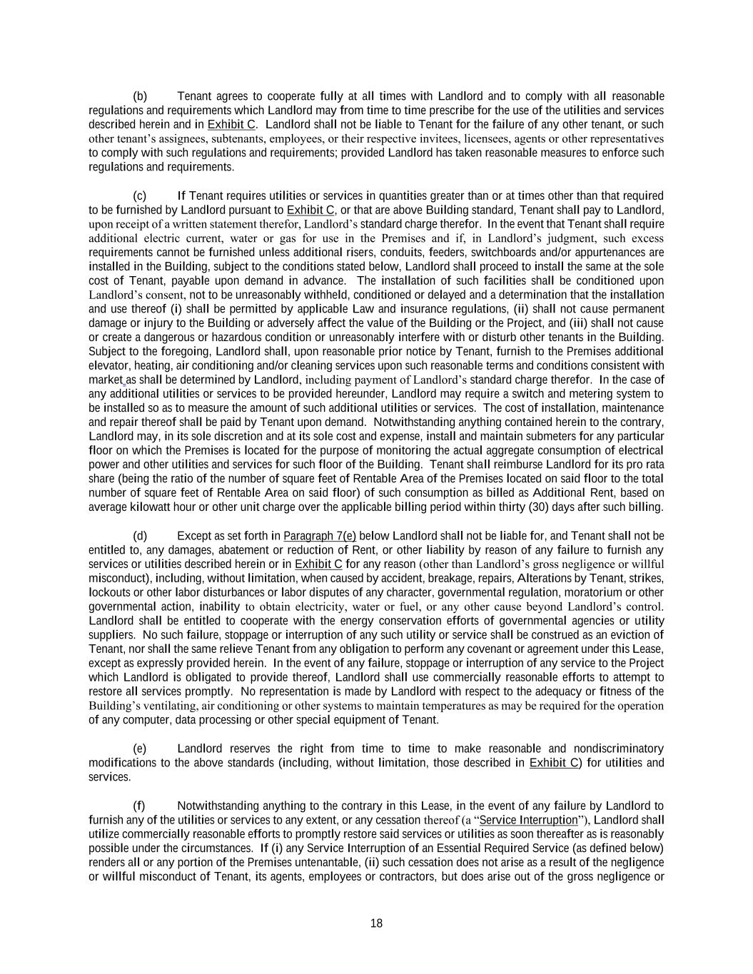 18 (b) Tenant agrees to cooperate fully at all times with Landlord and to comply with all reasonable regulations and requirements which Landlord may from time to time prescribe for the use of the utilities and services described herein and in Exhibit C. Landlord shall not be liable to Tenant for the failure of any other tenant, or such other tenant’s assignees, subtenants, employees, or their respective invitees, licensees, agents or other representatives to comply with such regulations and requirements; provided Landlord has taken reasonable measures to enforce such regulations and requirements. (c) If Tenant requires utilities or services in quantities greater than or at times other than that required to be furnished by Landlord pursuant to Exhibit C, or that are above Building standard, Tenant shall pay to Landlord, upon receipt of a written statement therefor, Landlord’s standard charge therefor. In the event that Tenant shall require additional electric current, water or gas for use in the Premises and if, in Landlord’s judgment, such excess requirements cannot be furnished unless additional risers, conduits, feeders, switchboards and/or appurtenances are installed in the Building, subject to the conditions stated below, Landlord shall proceed to install the same at the sole cost of Tenant, payable upon demand in advance. The installation of such facilities shall be conditioned upon Landlord’s consent, not to be unreasonably withheld, conditioned or delayed and a determination that the installation and use thereof (i) shall be permitted by applicable Law and insurance regulations, (ii) shall not cause permanent damage or injury to the Building or adversely affect the value of the Building or the Project, and (iii) shall not cause or create a dangerous or hazardous condition or unreasonably interfere with or disturb other tenants in the Building. Subject to the foregoing, Landlord shall, upon reasonable prior notice by Tenant, furnish to the Premises additional elevator, heating, air conditioning and/or cleaning services upon such reasonable terms and conditions consistent with market as shall be determined by Landlord, including payment of Landlord’s standard charge therefor. In the case of any additional utilities or services to be provided hereunder, Landlord may require a switch and metering system to be installed so as to measure the amount of such additional utilities or services. The cost of installation, maintenance and repair thereof shall be paid by Tenant upon demand. Notwithstanding anything contained herein to the contrary, Landlord may, in its sole discretion and at its sole cost and expense, install and maintain submeters for any particular floor on which the Premises is located for the purpose of monitoring the actual aggregate consumption of electrical power and other utilities and services for such floor of the Building. Tenant shall reimburse Landlord for its pro rata share (being the ratio of the number of square feet of Rentable Area of the Premises located on said floor to the total number of square feet of Rentable Area on said floor) of such consumption as billed as Additional Rent, based on average kilowatt hour or other unit charge over the applicable billing period within thirty (30) days after such billing. (d) Except as set forth in Paragraph 7(e) below Landlord shall not be liable for, and Tenant shall not be entitled to, any damages, abatement or reduction of Rent, or other liability by reason of any failure to furnish any services or utilities described herein or in Exhibit C for any reason (other than Landlord’s gross negligence or willful misconduct), including, without limitation, when caused by accident, breakage, repairs, Alterations by Tenant, strikes, lockouts or other labor disturbances or labor disputes of any character, governmental regulation, moratorium or other governmental action, inability to obtain electricity, water or fuel, or any other cause beyond Landlord’s control. Landlord shall be entitled to cooperate with the energy conservation efforts of governmental agencies or utility suppliers. No such failure, stoppage or interruption of any such utility or service shall be construed as an eviction of Tenant, nor shall the same relieve Tenant from any obligation to perform any covenant or agreement under this Lease, except as expressly provided herein. In the event of any failure, stoppage or interruption of any service to the Project which Landlord is obligated to provide thereof, Landlord shall use commercially reasonable efforts to attempt to restore all services promptly. No representation is made by Landlord with respect to the adequacy or fitness of the Building’s ventilating, air conditioning or other systems to maintain temperatures as may be required for the operation of any computer, data processing or other special equipment of Tenant. (e) Landlord reserves the right from time to time to make reasonable and nondiscriminatory modifications to the above standards (including, without limitation, those described in Exhibit C) for utilities and services. (f) Notwithstanding anything to the contrary in this Lease, in the event of any failure by Landlord to furnish any of the utilities or services to any extent, or any cessation thereof (a “Service Interruption”), Landlord shall utilize commercially reasonable efforts to promptly restore said services or utilities as soon thereafter as is reasonably possible under the circumstances. If (i) any Service Interruption of an Essential Required Service (as defined below) renders all or any portion of the Premises untenantable, (ii) such cessation does not arise as a result of the negligence or willful misconduct of Tenant, its agents, employees or contractors, but does arise out of the gross negligence or