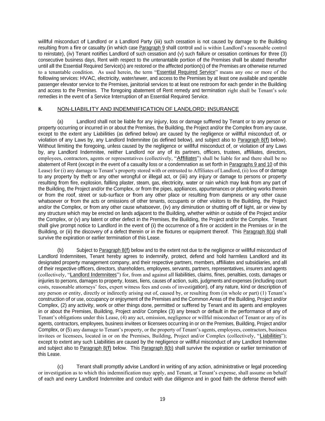 19 willful misconduct of Landlord or a Landlord Party (iii) such cessation is not caused by damage to the Building resulting from a fire or casualty (in which case Paragraph 9 shall control and is within Landlord’s reasonable control to reinstate), (iv) Tenant notifies Landlord of such cessation and (v) such failure or cessation continues for three (3) consecutive business days, Rent with respect to the untenantable portion of the Premises shall be abated thereafter until all the Essential Required Service(s) are restored or the affected portion(s) of the Premises are otherwise returned to a tenantable condition. As used herein, the term “Essential Required Service” means any one or more of the following services: HVAC, electricity, water/sewer, and access to the Premises by at least one available and operable passenger elevator service to the Premises, janitorial services to at least one restroom for each gender in the Building and access to the Premises. The foregoing abatement of Rent remedy and termination right shall be Tenant’s sole remedies in the event of a Service Interruption of an Essential Required Service. 8. NON-LIABILITY AND INDEMNIFICATION OF LANDLORD; INSURANCE (a) Landlord shall not be liable for any injury, loss or damage suffered by Tenant or to any person or property occurring or incurred in or about the Premises, the Building, the Project and/or the Complex from any cause, except to the extent any Liabilities (as defined below) are caused by the negligence or willful misconduct of, or violation of any Laws by, any Landlord Indemnitee (as defined below), and subject also to Paragraph 8(f) below). Without limiting the foregoing, unless caused by the negligence or willful misconduct of, or violation of any Laws by, any Landlord Indemnitee, neither Landlord nor any of its partners, officers, trustees, affiliates, directors, employees, contractors, agents or representatives (collectively, “Affiliates”) shall be liable for and there shall be no abatement of Rent (except in the event of a casualty loss or a condemnation as set forth in Paragraphs 9 and 10 of this Lease) for (i) any damage to Tenant’s property stored with or entrusted to Affiliates of Landlord, (ii) loss of or damage to any property by theft or any other wrongful or illegal act, or (iii) any injury or damage to persons or property resulting from fire, explosion, falling plaster, steam, gas, electricity, water or rain which may leak from any part of the Building, the Project and/or the Complex, or from the pipes, appliances, appurtenances or plumbing works therein or from the roof, street or sub-surface or from any other place or resulting from dampness or any other cause whatsoever or from the acts or omissions of other tenants, occupants or other visitors to the Building, the Project and/or the Complex, or from any other cause whatsoever, (iv) any diminution or shutting off of light, air or view by any structure which may be erected on lands adjacent to the Building, whether within or outside of the Project and/or the Complex, or (v) any latent or other defect in the Premises, the Building, the Project and/or the Complex. Tenant shall give prompt notice to Landlord in the event of (i) the occurrence of a fire or accident in the Premises or in the Building, or (ii) the discovery of a defect therein or in the fixtures or equipment thereof. This Paragraph 8(a) shall survive the expiration or earlier termination of this Lease. (b) Subject to Paragraph 8(f) below and to the extent not due to the negligence or willful misconduct of Landlord Indemnitees, Tenant hereby agrees to indemnify, protect, defend and hold harmless Landlord and its designated property management company, and their respective partners, members, affiliates and subsidiaries, and all of their respective officers, directors, shareholders, employees, servants, partners, representatives, insurers and agents (collectively, “Landlord Indemnitees”) for, from and against all liabilities, claims, fines, penalties, costs, damages or injuries to persons, damages to property, losses, liens, causes of action, suits, judgments and expenses (including court costs, reasonable attorneys’ fees, expert witness fees and costs of investigation), of any nature, kind or description of any person or entity, directly or indirectly arising out of, caused by, or resulting from (in whole or part) (1) Tenant’s construction of or use, occupancy or enjoyment of the Premises and the Common Areas of the Building, Project and/or Complex, (2) any activity, work or other things done, permitted or suffered by Tenant and its agents and employees in or about the Premises, Building, Project and/or Complex (3) any breach or default in the performance of any of Tenant’s obligations under this Lease, (4) any act, omission, negligence or willful misconduct of Tenant or any of its agents, contractors, employees, business invitees or licensees occurring in or on the Premises, Building, Project and/or Complex, or (5) any damage to Tenant’s property, or the property of Tenant’s agents, employees, contractors, business invitees or licensees, located in or on the Premises, Building, Project and/or Complex (collectively, “Liabilities”); except to extent any such Liabilities are caused by the negligence or willful misconduct of any Landlord Indemnitee and subject also to Paragraph 8(f) below. This Paragraph 8(b) shall survive the expiration or earlier termination of this Lease. (c) Tenant shall promptly advise Landlord in writing of any action, administrative or legal proceeding or investigation as to which this indemnification may apply, and Tenant, at Tenant’s expense, shall assume on behalf of each and every Landlord Indemnitee and conduct with due diligence and in good faith the defense thereof with