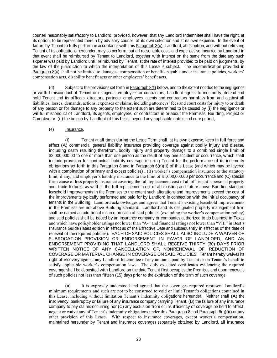 20 counsel reasonably satisfactory to Landlord; provided, however, that any Landlord Indemnitee shall have the right, at its option, to be represented therein by advisory counsel of its own selection and at its own expense. In the event of failure by Tenant to fully perform in accordance with this Paragraph 8(c), Landlord, at its option, and without relieving Tenant of its obligations hereunder, may so perform, but all reasonable costs and expenses so incurred by Landlord in that event shall be reimbursed by Tenant to Landlord, together with interest on the same from the date any such expense was paid by Landlord until reimbursed by Tenant, at the rate of interest provided to be paid on judgments, by the law of the jurisdiction to which the interpretation of this Lease is subject. The indemnification provided in Paragraph 8(c) shall not be limited to damages, compensation or benefits payable under insurance policies, workers’ compensation acts, disability benefit acts or other employees’ benefit acts. (d) Subject to the provisions set forth in Paragraph 8(f) below, and to the extent not due to the negligence or willful misconduct of Tenant or its agents, employees or contractors, Landlord agrees to indemnify, defend and hold Tenant and its officers, directors, partners, employees, agents and contractors harmless from and against all liabilities, losses, demands, actions, expenses or claims, including attorneys’ fees and court costs for injury to or death of any person or for damage to any property to the extent such are determined to be caused by (i) the negligence or willful misconduct of Landlord, its agents, employees, or contractors in or about the Premises, Building, Project or Complex, or (ii) the breach by Landlord of this Lease beyond any applicable notice and cure period,. (e) Insurance. (i) Tenant at all times during the Lease Term shall, at its own expense, keep in full force and effect (A) commercial general liability insurance providing coverage against bodily injury and disease, including death resulting therefrom, bodily injury and property damage to a combined single limit of $2,000,000.00 to one or more than one person as the result of any one accident or occurrence, which shall include provision for contractual liability coverage insuring Tenant for the performance of its indemnity obligations set forth in this Paragraph 8 and in Paragraph 6(g)(ii) of this Lease (and which may be layered with a combination of primary and excess policies) , (B) worker’s compensation insurance to the statutory limit, if any, and employer’s liability insurance to the limit of $1,000,000.00 per occurrence and (C) special form cause of loss property insurance covering the full replacement cost of all of Tenant’s personal property and, trade fixtures, as well as the full replacement cost of all existing and future above Building standard leasehold improvements in the Premises to the extent such alterations and improvements exceed the cost of the improvements typically performed and paid for by Landlord in connection with the initial occupancy of tenants in the Building. Landlord acknowledges and agrees that Tenant’s existing leasehold improvements in the Premises are not above Building standard. Landlord and its designated property management firm shall be named an additional insured on each of said policies (excluding the worker’s compensation policy) and said policies shall be issued by an insurance company or companies authorized to do business in Texas and which have policyholder ratings not lower than “A-” and financial ratings not lower than “VIII” in Best’s Insurance Guide (latest edition in effect as of the Effective Date and subsequently in effect as of the date of renewal of the required policies). EACH OF SAID POLICIES SHALL ALSO INCLUDE A WAIVER OF SUBROGATION PROVISION OR ENDORSEMENT IN FAVOR OF LANDLORD, AND AN ENDORSEMENT PROVIDING THAT LANDLORD SHALL RECEIVE THIRTY (30) DAYS PRIOR WRITTEN NOTICE OF ANY CANCELLATION OF, NONRENEWAL OF, REDUCTION OF COVERAGE OR MATERIAL CHANGE IN COVERAGE ON SAID POLICIES. Tenant hereby waives its right of recovery against any Landlord Indemnitee of any amounts paid by Tenant or on Tenant’s behalf to satisfy applicable worker’s compensation laws. The duly executed certificates evidencing the required coverage shall be deposited with Landlord on the date Tenant first occupies the Premises and upon renewals of such policies not less than fifteen (15) days prior to the expiration of the term of such coverage. (ii) It is expressly understood and agreed that the coverages required represent Landlord’s minimum requirements and such are not to be construed to void or limit Tenant’s obligations contained in this Lease, including without limitation Tenant’s indemnity obligations hereunder. Neither shall (A) the insolvency, bankruptcy or failure of any insurance company carrying Tenant, (B) the failure of any insurance company to pay claims occurring nor (C) any exclusion from or insufficiency of coverage be held to affect, negate or waive any of Tenant’s indemnity obligations under this Paragraph 8 and Paragraph 6(g)(ii) or any other provision of this Lease. With respect to insurance coverages, except worker’s compensation, maintained hereunder by Tenant and insurance coverages separately obtained by Landlord, all insurance