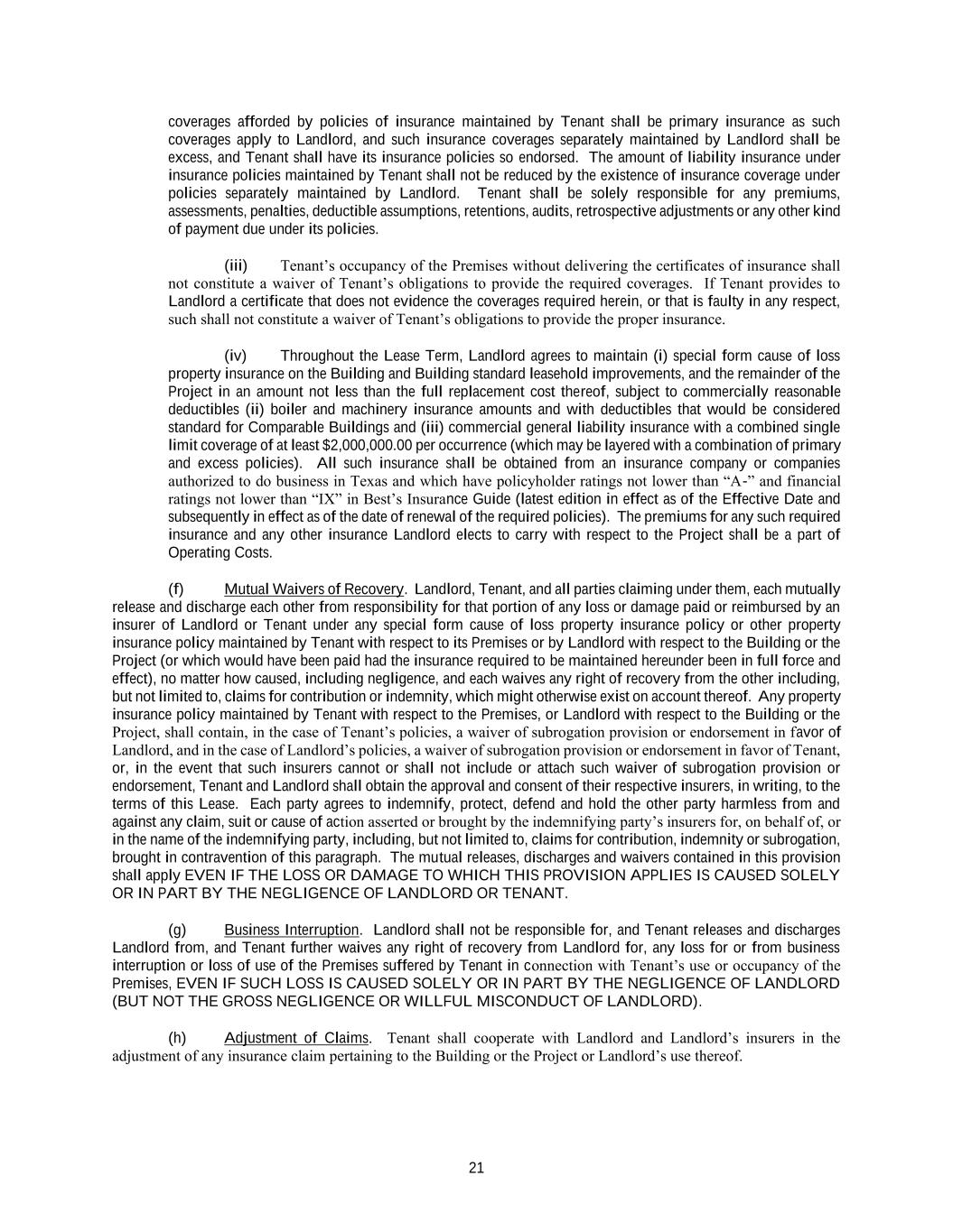 21 coverages afforded by policies of insurance maintained by Tenant shall be primary insurance as such coverages apply to Landlord, and such insurance coverages separately maintained by Landlord shall be excess, and Tenant shall have its insurance policies so endorsed. The amount of liability insurance under insurance policies maintained by Tenant shall not be reduced by the existence of insurance coverage under policies separately maintained by Landlord. Tenant shall be solely responsible for any premiums, assessments, penalties, deductible assumptions, retentions, audits, retrospective adjustments or any other kind of payment due under its policies. (iii) Tenant’s occupancy of the Premises without delivering the certificates of insurance shall not constitute a waiver of Tenant’s obligations to provide the required coverages. If Tenant provides to Landlord a certificate that does not evidence the coverages required herein, or that is faulty in any respect, such shall not constitute a waiver of Tenant’s obligations to provide the proper insurance. (iv) Throughout the Lease Term, Landlord agrees to maintain (i) special form cause of loss property insurance on the Building and Building standard leasehold improvements, and the remainder of the Project in an amount not less than the full replacement cost thereof, subject to commercially reasonable deductibles (ii) boiler and machinery insurance amounts and with deductibles that would be considered standard for Comparable Buildings and (iii) commercial general liability insurance with a combined single limit coverage of at least $2,000,000.00 per occurrence (which may be layered with a combination of primary and excess policies). All such insurance shall be obtained from an insurance company or companies authorized to do business in Texas and which have policyholder ratings not lower than “A-” and financial ratings not lower than “IX” in Best’s Insurance Guide (latest edition in effect as of the Effective Date and subsequently in effect as of the date of renewal of the required policies). The premiums for any such required insurance and any other insurance Landlord elects to carry with respect to the Project shall be a part of Operating Costs. (f) Mutual Waivers of Recovery. Landlord, Tenant, and all parties claiming under them, each mutually release and discharge each other from responsibility for that portion of any loss or damage paid or reimbursed by an insurer of Landlord or Tenant under any special form cause of loss property insurance policy or other property insurance policy maintained by Tenant with respect to its Premises or by Landlord with respect to the Building or the Project (or which would have been paid had the insurance required to be maintained hereunder been in full force and effect), no matter how caused, including negligence, and each waives any right of recovery from the other including, but not limited to, claims for contribution or indemnity, which might otherwise exist on account thereof. Any property insurance policy maintained by Tenant with respect to the Premises, or Landlord with respect to the Building or the Project, shall contain, in the case of Tenant’s policies, a waiver of subrogation provision or endorsement in favor of Landlord, and in the case of Landlord’s policies, a waiver of subrogation provision or endorsement in favor of Tenant, or, in the event that such insurers cannot or shall not include or attach such waiver of subrogation provision or endorsement, Tenant and Landlord shall obtain the approval and consent of their respective insurers, in writing, to the terms of this Lease. Each party agrees to indemnify, protect, defend and hold the other party harmless from and against any claim, suit or cause of action asserted or brought by the indemnifying party’s insurers for, on behalf of, or in the name of the indemnifying party, including, but not limited to, claims for contribution, indemnity or subrogation, brought in contravention of this paragraph. The mutual releases, discharges and waivers contained in this provision shall apply EVEN IF THE LOSS OR DAMAGE TO WHICH THIS PROVISION APPLIES IS CAUSED SOLELY OR IN PART BY THE NEGLIGENCE OF LANDLORD OR TENANT. (g) Business Interruption. Landlord shall not be responsible for, and Tenant releases and discharges Landlord from, and Tenant further waives any right of recovery from Landlord for, any loss for or from business interruption or loss of use of the Premises suffered by Tenant in connection with Tenant’s use or occupancy of the Premises, EVEN IF SUCH LOSS IS CAUSED SOLELY OR IN PART BY THE NEGLIGENCE OF LANDLORD (BUT NOT THE GROSS NEGLIGENCE OR WILLFUL MISCONDUCT OF LANDLORD). (h) Adjustment of Claims. Tenant shall cooperate with Landlord and Landlord’s insurers in the adjustment of any insurance claim pertaining to the Building or the Project or Landlord’s use thereof.