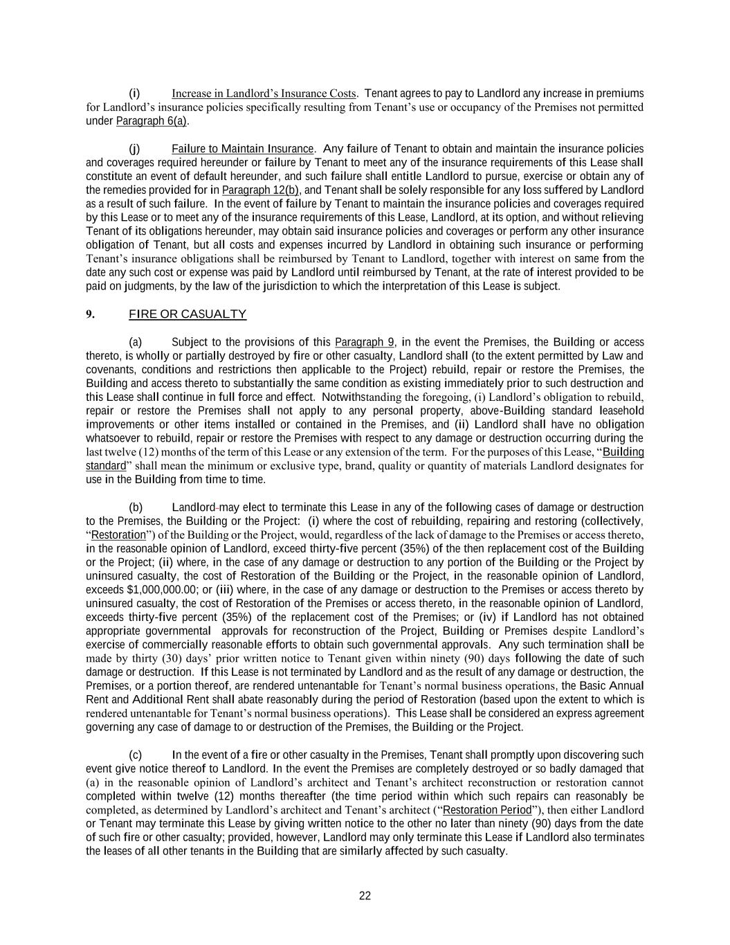 22 (i) Increase in Landlord’s Insurance Costs. Tenant agrees to pay to Landlord any increase in premiums for Landlord’s insurance policies specifically resulting from Tenant’s use or occupancy of the Premises not permitted under Paragraph 6(a). (j) Failure to Maintain Insurance. Any failure of Tenant to obtain and maintain the insurance policies and coverages required hereunder or failure by Tenant to meet any of the insurance requirements of this Lease shall constitute an event of default hereunder, and such failure shall entitle Landlord to pursue, exercise or obtain any of the remedies provided for in Paragraph 12(b), and Tenant shall be solely responsible for any loss suffered by Landlord as a result of such failure. In the event of failure by Tenant to maintain the insurance policies and coverages required by this Lease or to meet any of the insurance requirements of this Lease, Landlord, at its option, and without relieving Tenant of its obligations hereunder, may obtain said insurance policies and coverages or perform any other insurance obligation of Tenant, but all costs and expenses incurred by Landlord in obtaining such insurance or performing Tenant’s insurance obligations shall be reimbursed by Tenant to Landlord, together with interest on same from the date any such cost or expense was paid by Landlord until reimbursed by Tenant, at the rate of interest provided to be paid on judgments, by the law of the jurisdiction to which the interpretation of this Lease is subject. 9. FIRE OR CASUALTY (a) Subject to the provisions of this Paragraph 9, in the event the Premises, the Building or access thereto, is wholly or partially destroyed by fire or other casualty, Landlord shall (to the extent permitted by Law and covenants, conditions and restrictions then applicable to the Project) rebuild, repair or restore the Premises, the Building and access thereto to substantially the same condition as existing immediately prior to such destruction and this Lease shall continue in full force and effect. Notwithstanding the foregoing, (i) Landlord’s obligation to rebuild, repair or restore the Premises shall not apply to any personal property, above-Building standard leasehold improvements or other items installed or contained in the Premises, and (ii) Landlord shall have no obligation whatsoever to rebuild, repair or restore the Premises with respect to any damage or destruction occurring during the last twelve (12) months of the term of this Lease or any extension of the term. For the purposes of this Lease, “Building standard” shall mean the minimum or exclusive type, brand, quality or quantity of materials Landlord designates for use in the Building from time to time. (b) Landlord may elect to terminate this Lease in any of the following cases of damage or destruction to the Premises, the Building or the Project: (i) where the cost of rebuilding, repairing and restoring (collectively, “Restoration”) of the Building or the Project, would, regardless of the lack of damage to the Premises or access thereto, in the reasonable opinion of Landlord, exceed thirty-five percent (35%) of the then replacement cost of the Building or the Project; (ii) where, in the case of any damage or destruction to any portion of the Building or the Project by uninsured casualty, the cost of Restoration of the Building or the Project, in the reasonable opinion of Landlord, exceeds $1,000,000.00; or (iii) where, in the case of any damage or destruction to the Premises or access thereto by uninsured casualty, the cost of Restoration of the Premises or access thereto, in the reasonable opinion of Landlord, exceeds thirty-five percent (35%) of the replacement cost of the Premises; or (iv) if Landlord has not obtained appropriate governmental approvals for reconstruction of the Project, Building or Premises despite Landlord’s exercise of commercially reasonable efforts to obtain such governmental approvals. Any such termination shall be made by thirty (30) days’ prior written notice to Tenant given within ninety (90) days following the date of such damage or destruction. If this Lease is not terminated by Landlord and as the result of any damage or destruction, the Premises, or a portion thereof, are rendered untenantable for Tenant’s normal business operations, the Basic Annual Rent and Additional Rent shall abate reasonably during the period of Restoration (based upon the extent to which is rendered untenantable for Tenant’s normal business operations). This Lease shall be considered an express agreement governing any case of damage to or destruction of the Premises, the Building or the Project. (c) In the event of a fire or other casualty in the Premises, Tenant shall promptly upon discovering such event give notice thereof to Landlord. In the event the Premises are completely destroyed or so badly damaged that (a) in the reasonable opinion of Landlord’s architect and Tenant’s architect reconstruction or restoration cannot completed within twelve (12) months thereafter (the time period within which such repairs can reasonably be completed, as determined by Landlord’s architect and Tenant’s architect (“Restoration Period”), then either Landlord or Tenant may terminate this Lease by giving written notice to the other no later than ninety (90) days from the date of such fire or other casualty; provided, however, Landlord may only terminate this Lease if Landlord also terminates the leases of all other tenants in the Building that are similarly affected by such casualty.