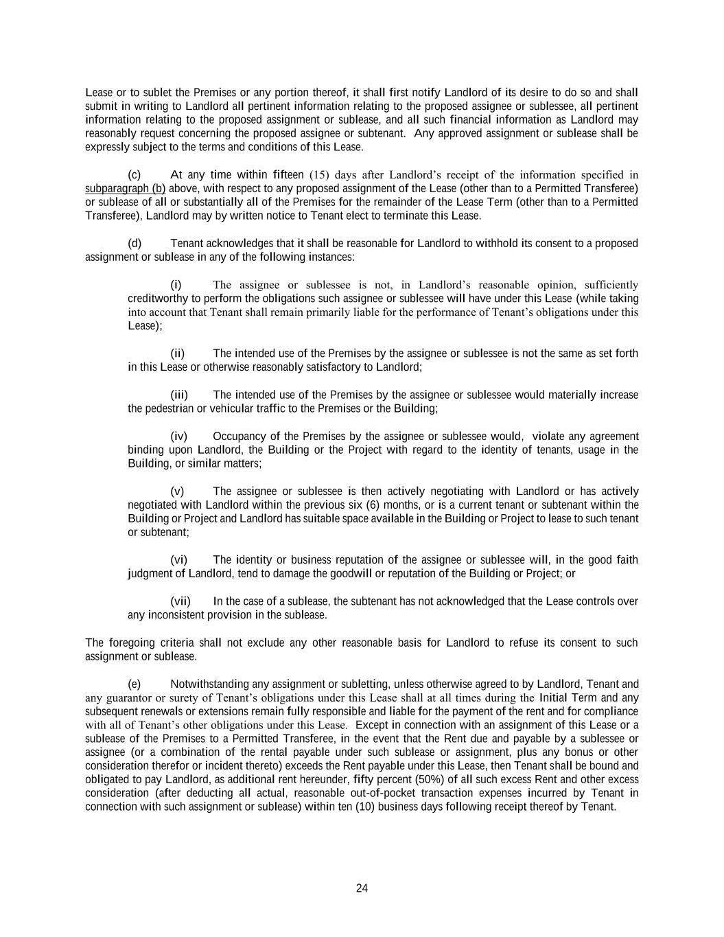 24 Lease or to sublet the Premises or any portion thereof, it shall first notify Landlord of its desire to do so and shall submit in writing to Landlord all pertinent information relating to the proposed assignee or sublessee, all pertinent information relating to the proposed assignment or sublease, and all such financial information as Landlord may reasonably request concerning the proposed assignee or subtenant. Any approved assignment or sublease shall be expressly subject to the terms and conditions of this Lease. (c) At any time within fifteen (15) days after Landlord’s receipt of the information specified in subparagraph (b) above, with respect to any proposed assignment of the Lease (other than to a Permitted Transferee) or sublease of all or substantially all of the Premises for the remainder of the Lease Term (other than to a Permitted Transferee), Landlord may by written notice to Tenant elect to terminate this Lease. (d) Tenant acknowledges that it shall be reasonable for Landlord to withhold its consent to a proposed assignment or sublease in any of the following instances: (i) The assignee or sublessee is not, in Landlord’s reasonable opinion, sufficiently creditworthy to perform the obligations such assignee or sublessee will have under this Lease (while taking into account that Tenant shall remain primarily liable for the performance of Tenant’s obligations under this Lease); (ii) The intended use of the Premises by the assignee or sublessee is not the same as set forth in this Lease or otherwise reasonably satisfactory to Landlord; (iii) The intended use of the Premises by the assignee or sublessee would materially increase the pedestrian or vehicular traffic to the Premises or the Building; (iv) Occupancy of the Premises by the assignee or sublessee would, violate any agreement binding upon Landlord, the Building or the Project with regard to the identity of tenants, usage in the Building, or similar matters; (v) The assignee or sublessee is then actively negotiating with Landlord or has actively negotiated with Landlord within the previous six (6) months, or is a current tenant or subtenant within the Building or Project and Landlord has suitable space available in the Building or Project to lease to such tenant or subtenant; (vi) The identity or business reputation of the assignee or sublessee will, in the good faith judgment of Landlord, tend to damage the goodwill or reputation of the Building or Project; or (vii) In the case of a sublease, the subtenant has not acknowledged that the Lease controls over any inconsistent provision in the sublease. The foregoing criteria shall not exclude any other reasonable basis for Landlord to refuse its consent to such assignment or sublease. (e) Notwithstanding any assignment or subletting, unless otherwise agreed to by Landlord, Tenant and any guarantor or surety of Tenant’s obligations under this Lease shall at all times during the Initial Term and any subsequent renewals or extensions remain fully responsible and liable for the payment of the rent and for compliance with all of Tenant’s other obligations under this Lease. Except in connection with an assignment of this Lease or a sublease of the Premises to a Permitted Transferee, in the event that the Rent due and payable by a sublessee or assignee (or a combination of the rental payable under such sublease or assignment, plus any bonus or other consideration therefor or incident thereto) exceeds the Rent payable under this Lease, then Tenant shall be bound and obligated to pay Landlord, as additional rent hereunder, fifty percent (50%) of all such excess Rent and other excess consideration (after deducting all actual, reasonable out-of-pocket transaction expenses incurred by Tenant in connection with such assignment or sublease) within ten (10) business days following receipt thereof by Tenant.