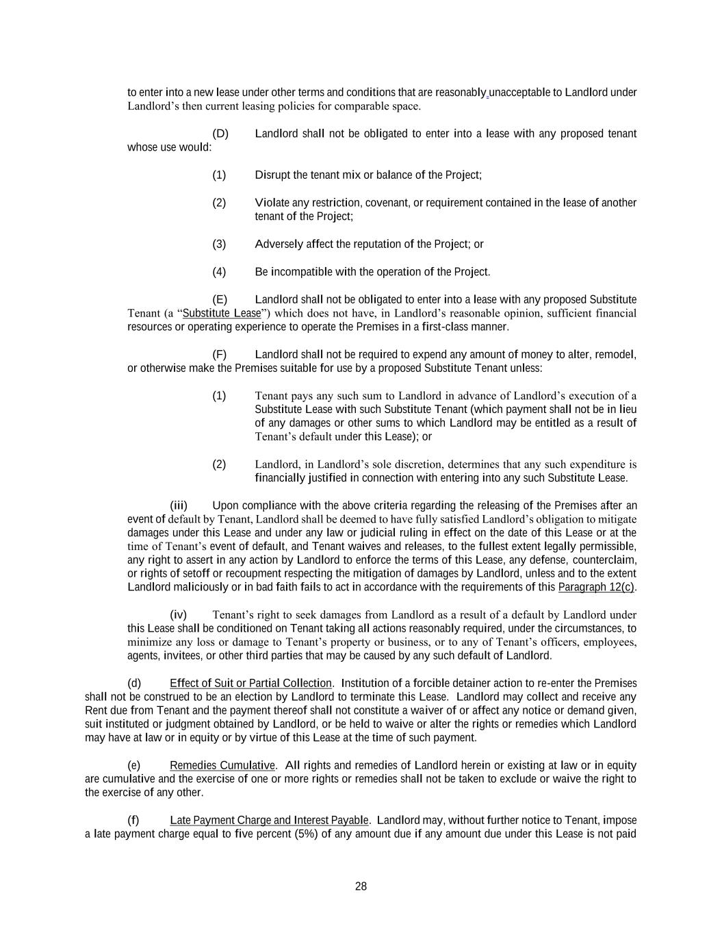 28 to enter into a new lease under other terms and conditions that are reasonably unacceptable to Landlord under Landlord’s then current leasing policies for comparable space. (D) Landlord shall not be obligated to enter into a lease with any proposed tenant whose use would: (1) Disrupt the tenant mix or balance of the Project; (2) Violate any restriction, covenant, or requirement contained in the lease of another tenant of the Project; (3) Adversely affect the reputation of the Project; or (4) Be incompatible with the operation of the Project. (E) Landlord shall not be obligated to enter into a lease with any proposed Substitute Tenant (a “Substitute Lease”) which does not have, in Landlord’s reasonable opinion, sufficient financial resources or operating experience to operate the Premises in a first-class manner. (F) Landlord shall not be required to expend any amount of money to alter, remodel, or otherwise make the Premises suitable for use by a proposed Substitute Tenant unless: (1) Tenant pays any such sum to Landlord in advance of Landlord’s execution of a Substitute Lease with such Substitute Tenant (which payment shall not be in lieu of any damages or other sums to which Landlord may be entitled as a result of Tenant’s default under this Lease); or (2) Landlord, in Landlord’s sole discretion, determines that any such expenditure is financially justified in connection with entering into any such Substitute Lease. (iii) Upon compliance with the above criteria regarding the releasing of the Premises after an event of default by Tenant, Landlord shall be deemed to have fully satisfied Landlord’s obligation to mitigate damages under this Lease and under any law or judicial ruling in effect on the date of this Lease or at the time of Tenant’s event of default, and Tenant waives and releases, to the fullest extent legally permissible, any right to assert in any action by Landlord to enforce the terms of this Lease, any defense, counterclaim, or rights of setoff or recoupment respecting the mitigation of damages by Landlord, unless and to the extent Landlord maliciously or in bad faith fails to act in accordance with the requirements of this Paragraph 12(c). (iv) Tenant’s right to seek damages from Landlord as a result of a default by Landlord under this Lease shall be conditioned on Tenant taking all actions reasonably required, under the circumstances, to minimize any loss or damage to Tenant’s property or business, or to any of Tenant’s officers, employees, agents, invitees, or other third parties that may be caused by any such default of Landlord. (d) Effect of Suit or Partial Collection. Institution of a forcible detainer action to re-enter the Premises shall not be construed to be an election by Landlord to terminate this Lease. Landlord may collect and receive any Rent due from Tenant and the payment thereof shall not constitute a waiver of or affect any notice or demand given, suit instituted or judgment obtained by Landlord, or be held to waive or alter the rights or remedies which Landlord may have at law or in equity or by virtue of this Lease at the time of such payment. (e) Remedies Cumulative. All rights and remedies of Landlord herein or existing at law or in equity are cumulative and the exercise of one or more rights or remedies shall not be taken to exclude or waive the right to the exercise of any other. (f) Late Payment Charge and Interest Payable. Landlord may, without further notice to Tenant, impose a late payment charge equal to five percent (5%) of any amount due if any amount due under this Lease is not paid
