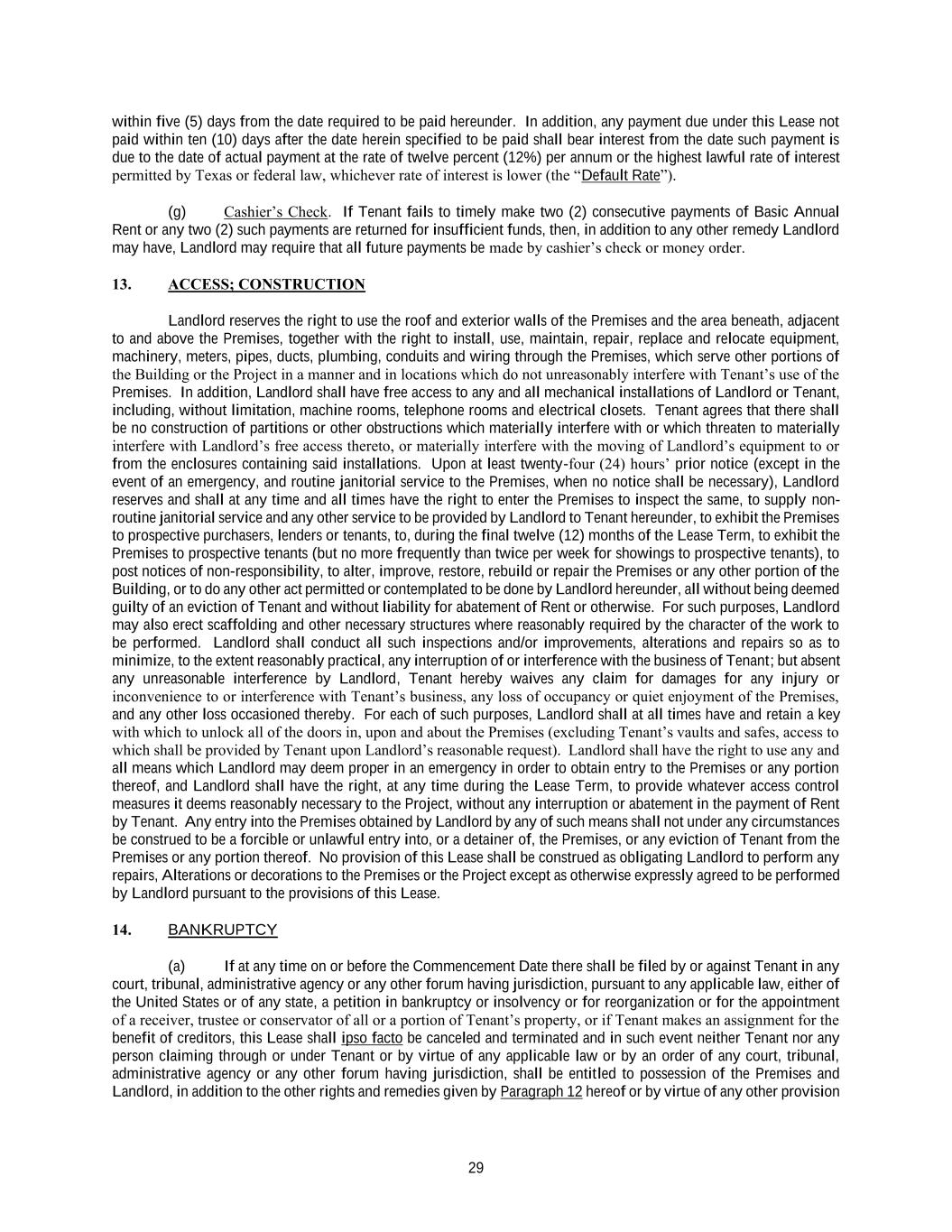 29 within five (5) days from the date required to be paid hereunder. In addition, any payment due under this Lease not paid within ten (10) days after the date herein specified to be paid shall bear interest from the date such payment is due to the date of actual payment at the rate of twelve percent (12%) per annum or the highest lawful rate of interest permitted by Texas or federal law, whichever rate of interest is lower (the “Default Rate”). (g) Cashier’s Check. If Tenant fails to timely make two (2) consecutive payments of Basic Annual Rent or any two (2) such payments are returned for insufficient funds, then, in addition to any other remedy Landlord may have, Landlord may require that all future payments be made by cashier’s check or money order. 13. ACCESS; CONSTRUCTION Landlord reserves the right to use the roof and exterior walls of the Premises and the area beneath, adjacent to and above the Premises, together with the right to install, use, maintain, repair, replace and relocate equipment, machinery, meters, pipes, ducts, plumbing, conduits and wiring through the Premises, which serve other portions of the Building or the Project in a manner and in locations which do not unreasonably interfere with Tenant’s use of the Premises. In addition, Landlord shall have free access to any and all mechanical installations of Landlord or Tenant, including, without limitation, machine rooms, telephone rooms and electrical closets. Tenant agrees that there shall be no construction of partitions or other obstructions which materially interfere with or which threaten to materially interfere with Landlord’s free access thereto, or materially interfere with the moving of Landlord’s equipment to or from the enclosures containing said installations. Upon at least twenty-four (24) hours’ prior notice (except in the event of an emergency, and routine janitorial service to the Premises, when no notice shall be necessary), Landlord reserves and shall at any time and all times have the right to enter the Premises to inspect the same, to supply non- routine janitorial service and any other service to be provided by Landlord to Tenant hereunder, to exhibit the Premises to prospective purchasers, lenders or tenants, to, during the final twelve (12) months of the Lease Term, to exhibit the Premises to prospective tenants (but no more frequently than twice per week for showings to prospective tenants), to post notices of non-responsibility, to alter, improve, restore, rebuild or repair the Premises or any other portion of the Building, or to do any other act permitted or contemplated to be done by Landlord hereunder, all without being deemed guilty of an eviction of Tenant and without liability for abatement of Rent or otherwise. For such purposes, Landlord may also erect scaffolding and other necessary structures where reasonably required by the character of the work to be performed. Landlord shall conduct all such inspections and/or improvements, alterations and repairs so as to minimize, to the extent reasonably practical, any interruption of or interference with the business of Tenant; but absent any unreasonable interference by Landlord, Tenant hereby waives any claim for damages for any injury or inconvenience to or interference with Tenant’s business, any loss of occupancy or quiet enjoyment of the Premises, and any other loss occasioned thereby. For each of such purposes, Landlord shall at all times have and retain a key with which to unlock all of the doors in, upon and about the Premises (excluding Tenant’s vaults and safes, access to which shall be provided by Tenant upon Landlord’s reasonable request). Landlord shall have the right to use any and all means which Landlord may deem proper in an emergency in order to obtain entry to the Premises or any portion thereof, and Landlord shall have the right, at any time during the Lease Term, to provide whatever access control measures it deems reasonably necessary to the Project, without any interruption or abatement in the payment of Rent by Tenant. Any entry into the Premises obtained by Landlord by any of such means shall not under any circumstances be construed to be a forcible or unlawful entry into, or a detainer of, the Premises, or any eviction of Tenant from the Premises or any portion thereof. No provision of this Lease shall be construed as obligating Landlord to perform any repairs, Alterations or decorations to the Premises or the Project except as otherwise expressly agreed to be performed by Landlord pursuant to the provisions of this Lease. 14. BANKRUPTCY (a) If at any time on or before the Commencement Date there shall be filed by or against Tenant in any court, tribunal, administrative agency or any other forum having jurisdiction, pursuant to any applicable law, either of the United States or of any state, a petition in bankruptcy or insolvency or for reorganization or for the appointment of a receiver, trustee or conservator of all or a portion of Tenant’s property, or if Tenant makes an assignment for the benefit of creditors, this Lease shall ipso facto be canceled and terminated and in such event neither Tenant nor any person claiming through or under Tenant or by virtue of any applicable law or by an order of any court, tribunal, administrative agency or any other forum having jurisdiction, shall be entitled to possession of the Premises and Landlord, in addition to the other rights and remedies given by Paragraph 12 hereof or by virtue of any other provision