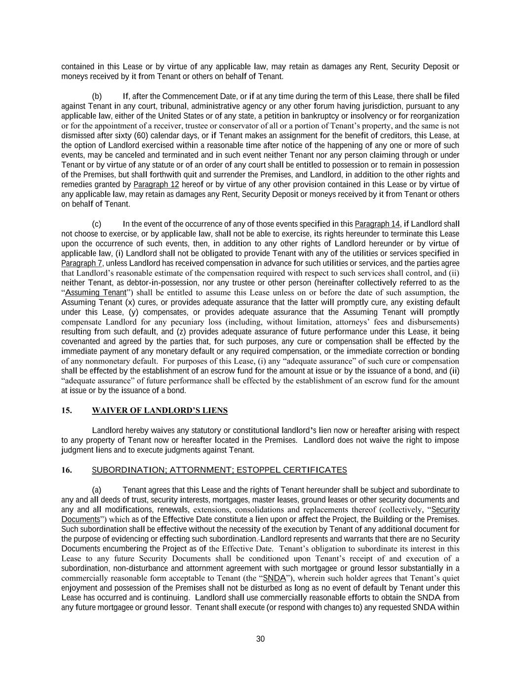 30 contained in this Lease or by virtue of any applicable law, may retain as damages any Rent, Security Deposit or moneys received by it from Tenant or others on behalf of Tenant. (b) If, after the Commencement Date, or if at any time during the term of this Lease, there shall be filed against Tenant in any court, tribunal, administrative agency or any other forum having jurisdiction, pursuant to any applicable law, either of the United States or of any state, a petition in bankruptcy or insolvency or for reorganization or for the appointment of a receiver, trustee or conservator of all or a portion of Tenant’s property, and the same is not dismissed after sixty (60) calendar days, or if Tenant makes an assignment for the benefit of creditors, this Lease, at the option of Landlord exercised within a reasonable time after notice of the happening of any one or more of such events, may be canceled and terminated and in such event neither Tenant nor any person claiming through or under Tenant or by virtue of any statute or of an order of any court shall be entitled to possession or to remain in possession of the Premises, but shall forthwith quit and surrender the Premises, and Landlord, in addition to the other rights and remedies granted by Paragraph 12 hereof or by virtue of any other provision contained in this Lease or by virtue of any applicable law, may retain as damages any Rent, Security Deposit or moneys received by it from Tenant or others on behalf of Tenant. (c) In the event of the occurrence of any of those events specified in this Paragraph 14, if Landlord shall not choose to exercise, or by applicable law, shall not be able to exercise, its rights hereunder to terminate this Lease upon the occurrence of such events, then, in addition to any other rights of Landlord hereunder or by virtue of applicable law, (i) Landlord shall not be obligated to provide Tenant with any of the utilities or services specified in Paragraph 7, unless Landlord has received compensation in advance for such utilities or services, and the parties agree that Landlord’s reasonable estimate of the compensation required with respect to such services shall control, and (ii) neither Tenant, as debtor-in-possession, nor any trustee or other person (hereinafter collectively referred to as the “Assuming Tenant”) shall be entitled to assume this Lease unless on or before the date of such assumption, the Assuming Tenant (x) cures, or provides adequate assurance that the latter will promptly cure, any existing default under this Lease, (y) compensates, or provides adequate assurance that the Assuming Tenant will promptly compensate Landlord for any pecuniary loss (including, without limitation, attorneys’ fees and disbursements) resulting from such default, and (z) provides adequate assurance of future performance under this Lease, it being covenanted and agreed by the parties that, for such purposes, any cure or compensation shall be effected by the immediate payment of any monetary default or any required compensation, or the immediate correction or bonding of any nonmonetary default. For purposes of this Lease, (i) any “adequate assurance” of such cure or compensation shall be effected by the establishment of an escrow fund for the amount at issue or by the issuance of a bond, and (ii) “adequate assurance” of future performance shall be effected by the establishment of an escrow fund for the amount at issue or by the issuance of a bond. 15. WAIVER OF LANDLORD’S LIENS Landlord hereby waives any statutory or constitutional landlord’s lien now or hereafter arising with respect to any property of Tenant now or hereafter located in the Premises. Landlord does not waive the right to impose judgment liens and to execute judgments against Tenant. 16. SUBORDINATION; ATTORNMENT; ESTOPPEL CERTIFICATES (a) Tenant agrees that this Lease and the rights of Tenant hereunder shall be subject and subordinate to any and all deeds of trust, security interests, mortgages, master leases, ground leases or other security documents and any and all modifications, renewals, extensions, consolidations and replacements thereof (collectively, “Security Documents”) which as of the Effective Date constitute a lien upon or affect the Project, the Building or the Premises. Such subordination shall be effective without the necessity of the execution by Tenant of any additional document for the purpose of evidencing or effecting such subordination. Landlord represents and warrants that there are no Security Documents encumbering the Project as of the Effective Date. Tenant’s obligation to subordinate its interest in this Lease to any future Security Documents shall be conditioned upon Tenant’s receipt of and execution of a subordination, non-disturbance and attornment agreement with such mortgagee or ground lessor substantially in a commercially reasonable form acceptable to Tenant (the “SNDA”), wherein such holder agrees that Tenant’s quiet enjoyment and possession of the Premises shall not be disturbed as long as no event of default by Tenant under this Lease has occurred and is continuing. Landlord shall use commercially reasonable efforts to obtain the SNDA from any future mortgagee or ground lessor. Tenant shall execute (or respond with changes to) any requested SNDA within