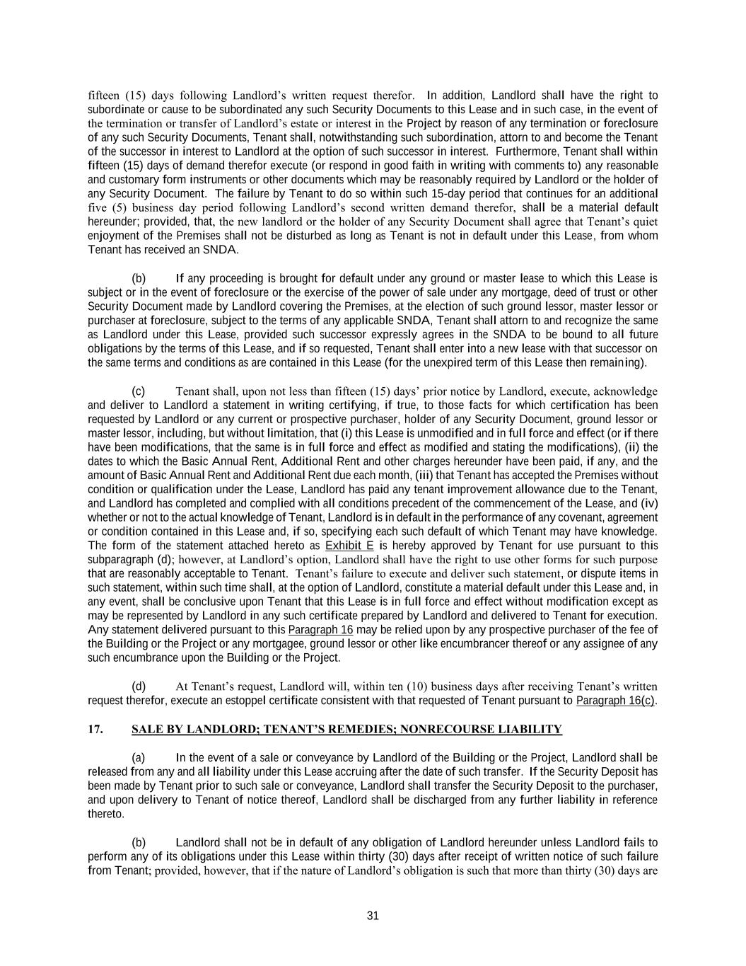 31 fifteen (15) days following Landlord’s written request therefor. In addition, Landlord shall have the right to subordinate or cause to be subordinated any such Security Documents to this Lease and in such case, in the event of the termination or transfer of Landlord’s estate or interest in the Project by reason of any termination or foreclosure of any such Security Documents, Tenant shall, notwithstanding such subordination, attorn to and become the Tenant of the successor in interest to Landlord at the option of such successor in interest. Furthermore, Tenant shall within fifteen (15) days of demand therefor execute (or respond in good faith in writing with comments to) any reasonable and customary form instruments or other documents which may be reasonably required by Landlord or the holder of any Security Document. The failure by Tenant to do so within such 15-day period that continues for an additional five (5) business day period following Landlord’s second written demand therefor, shall be a material default hereunder; provided, that, the new landlord or the holder of any Security Document shall agree that Tenant’s quiet enjoyment of the Premises shall not be disturbed as long as Tenant is not in default under this Lease, from whom Tenant has received an SNDA. (b) If any proceeding is brought for default under any ground or master lease to which this Lease is subject or in the event of foreclosure or the exercise of the power of sale under any mortgage, deed of trust or other Security Document made by Landlord covering the Premises, at the election of such ground lessor, master lessor or purchaser at foreclosure, subject to the terms of any applicable SNDA, Tenant shall attorn to and recognize the same as Landlord under this Lease, provided such successor expressly agrees in the SNDA to be bound to all future obligations by the terms of this Lease, and if so requested, Tenant shall enter into a new lease with that successor on the same terms and conditions as are contained in this Lease (for the unexpired term of this Lease then remaining). (c) Tenant shall, upon not less than fifteen (15) days’ prior notice by Landlord, execute, acknowledge and deliver to Landlord a statement in writing certifying, if true, to those facts for which certification has been requested by Landlord or any current or prospective purchaser, holder of any Security Document, ground lessor or master lessor, including, but without limitation, that (i) this Lease is unmodified and in full force and effect (or if there have been modifications, that the same is in full force and effect as modified and stating the modifications), (ii) the dates to which the Basic Annual Rent, Additional Rent and other charges hereunder have been paid, if any, and the amount of Basic Annual Rent and Additional Rent due each month, (iii) that Tenant has accepted the Premises without condition or qualification under the Lease, Landlord has paid any tenant improvement allowance due to the Tenant, and Landlord has completed and complied with all conditions precedent of the commencement of the Lease, and (iv) whether or not to the actual knowledge of Tenant, Landlord is in default in the performance of any covenant, agreement or condition contained in this Lease and, if so, specifying each such default of which Tenant may have knowledge. The form of the statement attached hereto as Exhibit E is hereby approved by Tenant for use pursuant to this subparagraph (d); however, at Landlord’s option, Landlord shall have the right to use other forms for such purpose that are reasonably acceptable to Tenant. Tenant’s failure to execute and deliver such statement, or dispute items in such statement, within such time shall, at the option of Landlord, constitute a material default under this Lease and, in any event, shall be conclusive upon Tenant that this Lease is in full force and effect without modification except as may be represented by Landlord in any such certificate prepared by Landlord and delivered to Tenant for execution. Any statement delivered pursuant to this Paragraph 16 may be relied upon by any prospective purchaser of the fee of the Building or the Project or any mortgagee, ground lessor or other like encumbrancer thereof or any assignee of any such encumbrance upon the Building or the Project. (d) At Tenant’s request, Landlord will, within ten (10) business days after receiving Tenant’s written request therefor, execute an estoppel certificate consistent with that requested of Tenant pursuant to Paragraph 16(c). 17. SALE BY LANDLORD; TENANT’S REMEDIES; NONRECOURSE LIABILITY (a) In the event of a sale or conveyance by Landlord of the Building or the Project, Landlord shall be released from any and all liability under this Lease accruing after the date of such transfer. If the Security Deposit has been made by Tenant prior to such sale or conveyance, Landlord shall transfer the Security Deposit to the purchaser, and upon delivery to Tenant of notice thereof, Landlord shall be discharged from any further liability in reference thereto. (b) Landlord shall not be in default of any obligation of Landlord hereunder unless Landlord fails to perform any of its obligations under this Lease within thirty (30) days after receipt of written notice of such failure from Tenant; provided, however, that if the nature of Landlord’s obligation is such that more than thirty (30) days are