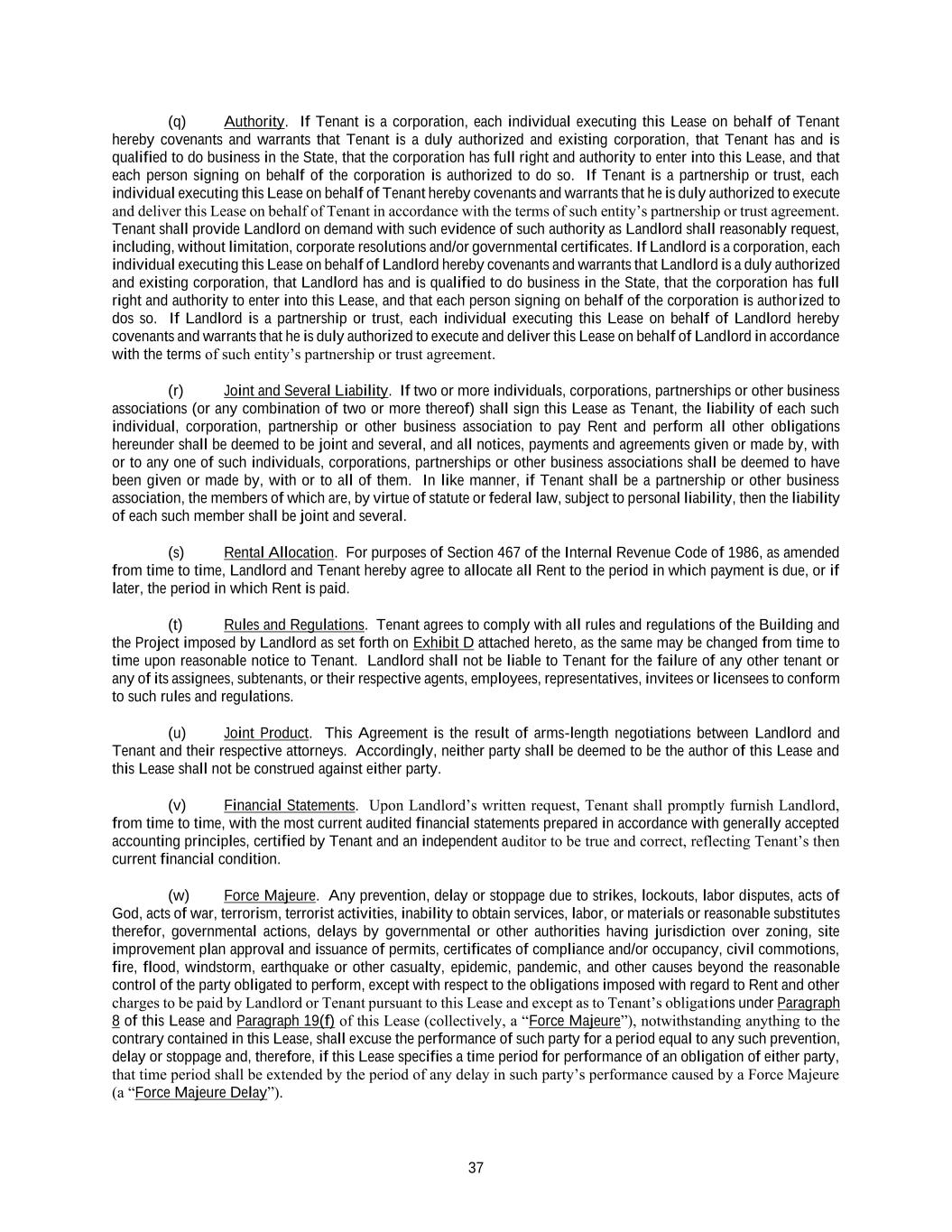 37 (q) Authority. If Tenant is a corporation, each individual executing this Lease on behalf of Tenant hereby covenants and warrants that Tenant is a duly authorized and existing corporation, that Tenant has and is qualified to do business in the State, that the corporation has full right and authority to enter into this Lease, and that each person signing on behalf of the corporation is authorized to do so. If Tenant is a partnership or trust, each individual executing this Lease on behalf of Tenant hereby covenants and warrants that he is duly authorized to execute and deliver this Lease on behalf of Tenant in accordance with the terms of such entity’s partnership or trust agreement. Tenant shall provide Landlord on demand with such evidence of such authority as Landlord shall reasonably request, including, without limitation, corporate resolutions and/or governmental certificates. If Landlord is a corporation, each individual executing this Lease on behalf of Landlord hereby covenants and warrants that Landlord is a duly authorized and existing corporation, that Landlord has and is qualified to do business in the State, that the corporation has full right and authority to enter into this Lease, and that each person signing on behalf of the corporation is authorized to dos so. If Landlord is a partnership or trust, each individual executing this Lease on behalf of Landlord hereby covenants and warrants that he is duly authorized to execute and deliver this Lease on behalf of Landlord in accordance with the terms of such entity’s partnership or trust agreement. (r) Joint and Several Liability. If two or more individuals, corporations, partnerships or other business associations (or any combination of two or more thereof) shall sign this Lease as Tenant, the liability of each such individual, corporation, partnership or other business association to pay Rent and perform all other obligations hereunder shall be deemed to be joint and several, and all notices, payments and agreements given or made by, with or to any one of such individuals, corporations, partnerships or other business associations shall be deemed to have been given or made by, with or to all of them. In like manner, if Tenant shall be a partnership or other business association, the members of which are, by virtue of statute or federal law, subject to personal liability, then the liability of each such member shall be joint and several. (s) Rental Allocation. For purposes of Section 467 of the Internal Revenue Code of 1986, as amended from time to time, Landlord and Tenant hereby agree to allocate all Rent to the period in which payment is due, or if later, the period in which Rent is paid. (t) Rules and Regulations. Tenant agrees to comply with all rules and regulations of the Building and the Project imposed by Landlord as set forth on Exhibit D attached hereto, as the same may be changed from time to time upon reasonable notice to Tenant. Landlord shall not be liable to Tenant for the failure of any other tenant or any of its assignees, subtenants, or their respective agents, employees, representatives, invitees or licensees to conform to such rules and regulations. (u) Joint Product. This Agreement is the result of arms-length negotiations between Landlord and Tenant and their respective attorneys. Accordingly, neither party shall be deemed to be the author of this Lease and this Lease shall not be construed against either party. (v) Financial Statements. Upon Landlord’s written request, Tenant shall promptly furnish Landlord, from time to time, with the most current audited financial statements prepared in accordance with generally accepted accounting principles, certified by Tenant and an independent auditor to be true and correct, reflecting Tenant’s then current financial condition. (w) Force Majeure. Any prevention, delay or stoppage due to strikes, lockouts, labor disputes, acts of God, acts of war, terrorism, terrorist activities, inability to obtain services, labor, or materials or reasonable substitutes therefor, governmental actions, delays by governmental or other authorities having jurisdiction over zoning, site improvement plan approval and issuance of permits, certificates of compliance and/or occupancy, civil commotions, fire, flood, windstorm, earthquake or other casualty, epidemic, pandemic, and other causes beyond the reasonable control of the party obligated to perform, except with respect to the obligations imposed with regard to Rent and other charges to be paid by Landlord or Tenant pursuant to this Lease and except as to Tenant’s obligations under Paragraph 8 of this Lease and Paragraph 19(f) of this Lease (collectively, a “Force Majeure”), notwithstanding anything to the contrary contained in this Lease, shall excuse the performance of such party for a period equal to any such prevention, delay or stoppage and, therefore, if this Lease specifies a time period for performance of an obligation of either party, that time period shall be extended by the period of any delay in such party’s performance caused by a Force Majeure (a “Force Majeure Delay”).