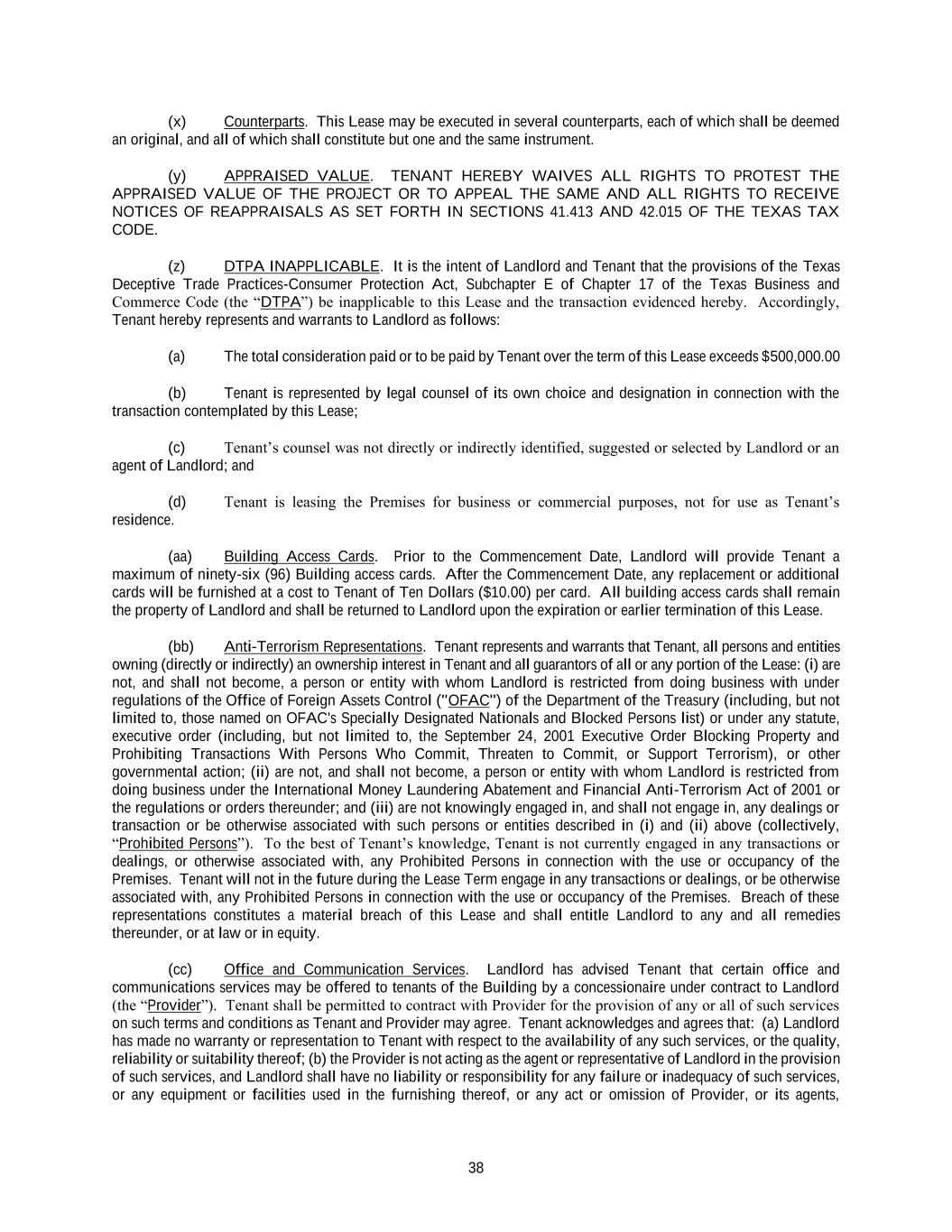 38 (x) Counterparts. This Lease may be executed in several counterparts, each of which shall be deemed an original, and all of which shall constitute but one and the same instrument. (y) APPRAISED VALUE. TENANT HEREBY WAIVES ALL RIGHTS TO PROTEST THE APPRAISED VALUE OF THE PROJECT OR TO APPEAL THE SAME AND ALL RIGHTS TO RECEIVE NOTICES OF REAPPRAISALS AS SET FORTH IN SECTIONS 41.413 AND 42.015 OF THE TEXAS TAX CODE. (z) DTPA INAPPLICABLE. It is the intent of Landlord and Tenant that the provisions of the Texas Deceptive Trade Practices-Consumer Protection Act, Subchapter E of Chapter 17 of the Texas Business and Commerce Code (the “DTPA”) be inapplicable to this Lease and the transaction evidenced hereby. Accordingly, Tenant hereby represents and warrants to Landlord as follows: (a) The total consideration paid or to be paid by Tenant over the term of this Lease exceeds $500,000.00 (b) Tenant is represented by legal counsel of its own choice and designation in connection with the transaction contemplated by this Lease; (c) Tenant’s counsel was not directly or indirectly identified, suggested or selected by Landlord or an agent of Landlord; and (d) Tenant is leasing the Premises for business or commercial purposes, not for use as Tenant’s residence. (aa) Building Access Cards. Prior to the Commencement Date, Landlord will provide Tenant a maximum of ninety-six (96) Building access cards. After the Commencement Date, any replacement or additional cards will be furnished at a cost to Tenant of Ten Dollars ($10.00) per card. All building access cards shall remain the property of Landlord and shall be returned to Landlord upon the expiration or earlier termination of this Lease. (bb) Anti-Terrorism Representations. Tenant represents and warrants that Tenant, all persons and entities owning (directly or indirectly) an ownership interest in Tenant and all guarantors of all or any portion of the Lease: (i) are not, and shall not become, a person or entity with whom Landlord is restricted from doing business with under regulations of the Office of Foreign Assets Control ("OFAC") of the Department of the Treasury (including, but not limited to, those named on OFAC's Specially Designated Nationals and Blocked Persons list) or under any statute, executive order (including, but not limited to, the September 24, 2001 Executive Order Blocking Property and Prohibiting Transactions With Persons Who Commit, Threaten to Commit, or Support Terrorism), or other governmental action; (ii) are not, and shall not become, a person or entity with whom Landlord is restricted from doing business under the International Money Laundering Abatement and Financial Anti-Terrorism Act of 2001 or the regulations or orders thereunder; and (iii) are not knowingly engaged in, and shall not engage in, any dealings or transaction or be otherwise associated with such persons or entities described in (i) and (ii) above (collectively, “Prohibited Persons”). To the best of Tenant’s knowledge, Tenant is not currently engaged in any transactions or dealings, or otherwise associated with, any Prohibited Persons in connection with the use or occupancy of the Premises. Tenant will not in the future during the Lease Term engage in any transactions or dealings, or be otherwise associated with, any Prohibited Persons in connection with the use or occupancy of the Premises. Breach of these representations constitutes a material breach of this Lease and shall entitle Landlord to any and all remedies thereunder, or at law or in equity. (cc) Office and Communication Services. Landlord has advised Tenant that certain office and communications services may be offered to tenants of the Building by a concessionaire under contract to Landlord (the “Provider”). Tenant shall be permitted to contract with Provider for the provision of any or all of such services on such terms and conditions as Tenant and Provider may agree. Tenant acknowledges and agrees that: (a) Landlord has made no warranty or representation to Tenant with respect to the availability of any such services, or the quality, reliability or suitability thereof; (b) the Provider is not acting as the agent or representative of Landlord in the provision of such services, and Landlord shall have no liability or responsibility for any failure or inadequacy of such services, or any equipment or facilities used in the furnishing thereof, or any act or omission of Provider, or its agents,