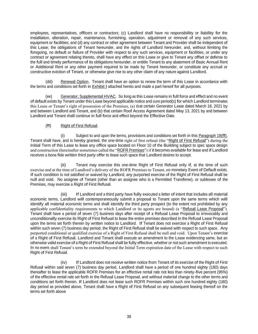 39 employees, representatives, officers or contractors; (c) Landlord shall have no responsibility or liability for the installation, alteration, repair, maintenance, furnishing, operation, adjustment or removal of any such services, equipment or facilities; and (d) any contract or other agreement between Tenant and Provider shall be independent of this Lease; the obligations of Tenant hereunder, and the rights of Landlord hereunder, and, without limiting the foregoing, no default or failure of Provider with respect to any such services, equipment or facilities, or under any contract or agreement relating thereto, shall have any effect on this Lease or give to Tenant any offset or defense to the full and timely performance of its obligations hereunder, or entitle Tenant to any abatement of Basic Annual Rent or Additional Rent or any other payment required to be made by Tenant hereunder, or constitute any accrual or constructive eviction of Tenant, or otherwise give rise to any other claim of any nature against Landlord. (dd) Renewal Option. Tenant shall have an option to renew the term of this Lease in accordance with the terms and conditions set forth in Exhibit I attached hereto and made a part hereof for all purposes. (ee) Generator; Supplemental HVAC. So long as this Lease remains in full force and effect and no event of default exists by Tenant under this Lease beyond applicable notice and cure period(s) for which Landlord terminates this Lease or Tenant’s right of possession of the Premises, (a) that certain Generator Lease dated March 18, 2021 by and between Landlord and Tenant, and (b) that certain Roof Access Agreement dated May 13, 2021 by and between Landlord and Tenant shall continue in full force and effect beyond the Effective Date. (ff) Right of First Refusal. (i) Subject to and upon the terms, provisions and conditions set forth in this Paragraph 19(ff), Tenant shall have, and is hereby granted, the one-time right of first refusal (the “Right of First Refusal”) during the Initial Term of this Lease to lease any office space located on Floor 10 of the Building subject to spec space design and construction (hereinafter sometimes called the “ROFR Premises”) if it becomes available for lease and if Landlord receives a bona fide written third party offer to lease such space that Landlord desires to accept. (ii) Tenant may exercise this one-time Right of First Refusal only if, at the time of such exercise and at the time of Landlord’s delivery of the ROFR Premises to Tenant, no monetary Event of Default exists. If such condition is not satisfied or waived by Landlord, any purported exercise of the Right of First Refusal shall be null and void. No assignee of Tenant (other than an assignee who is a Permitted Transferee), or sublessee of the Premises, may exercise a Right of First Refusal. (iii) If Landlord and a third party have fully executed a letter of intent that includes all material economic terms, Landlord will contemporaneously submit a proposal to Tenant upon the same terms which will identify all material economic terms and shall identify the third party prospect (to the extent not prohibited by any applicable confidentiality requirements to which Landlord or its agents are bound) (a “Refusal Lease Proposal”). Tenant shall have a period of seven (7) business days after receipt of a Refusal Lease Proposal to irrevocably and unconditionally exercise its Right of First Refusal to lease the entire premises described in the Refusal Lease Proposal upon the terms set forth therein by written notice to Landlord. If Tenant does not exercise a Right of First Refusal within such seven (7) business day period, the Right of First Refusal shall be waived with respect to such space. Any purported conditional or qualified exercise of a Right of First Refusal shall be null and void. Upon Tenant’s exercise of a Right of First Refusal, Landlord and Tenant shall execute an amendment to the Lease evidencing same, but an otherwise valid exercise of a Right of First Refusal shall be fully effective, whether or not such amendment is executed. In no event shall Tenant’s term be extended beyond the Initial Term expiration date of the Lease with respect to such Right of First Refusal. (iv) If Landlord does not receive written notice from Tenant of its exercise of the Right of First Refusal within said seven (7) business day period, Landlord shall have a period of one hundred eighty (180) days thereafter to lease the applicable ROFR Premises for an effective rental rate not less than ninety-five percent (95%) of the effective rental rate set forth in the Refusal Lease Proposal, and without material change to the other terms and conditions set forth therein. If Landlord does not lease such ROFR Premises within such one hundred eighty (180) day period as provided above, Tenant shall have a Right of First Refusal on any subsequent leasing thereof on the terms set forth above