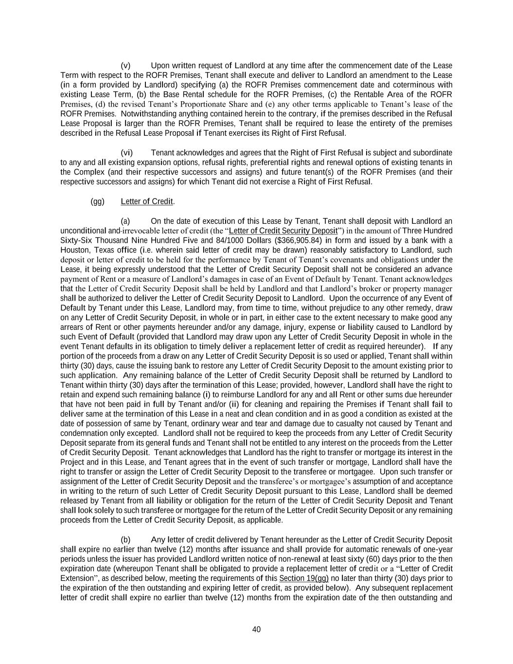 40 (v) Upon written request of Landlord at any time after the commencement date of the Lease Term with respect to the ROFR Premises, Tenant shall execute and deliver to Landlord an amendment to the Lease (in a form provided by Landlord) specifying (a) the ROFR Premises commencement date and coterminous with existing Lease Term, (b) the Base Rental schedule for the ROFR Premises, (c) the Rentable Area of the ROFR Premises, (d) the revised Tenant’s Proportionate Share and (e) any other terms applicable to Tenant’s lease of the ROFR Premises. Notwithstanding anything contained herein to the contrary, if the premises described in the Refusal Lease Proposal is larger than the ROFR Premises, Tenant shall be required to lease the entirety of the premises described in the Refusal Lease Proposal if Tenant exercises its Right of First Refusal. (vi) Tenant acknowledges and agrees that the Right of First Refusal is subject and subordinate to any and all existing expansion options, refusal rights, preferential rights and renewal options of existing tenants in the Complex (and their respective successors and assigns) and future tenant(s) of the ROFR Premises (and their respective successors and assigns) for which Tenant did not exercise a Right of First Refusal. (gg) Letter of Credit. (a) On the date of execution of this Lease by Tenant, Tenant shall deposit with Landlord an unconditional and irrevocable letter of credit (the “Letter of Credit Security Deposit”) in the amount of Three Hundred Sixty-Six Thousand Nine Hundred Five and 84/1000 Dollars ($366,905.84) in form and issued by a bank with a Houston, Texas office (i.e. wherein said letter of credit may be drawn) reasonably satisfactory to Landlord, such deposit or letter of credit to be held for the performance by Tenant of Tenant’s covenants and obligations under the Lease, it being expressly understood that the Letter of Credit Security Deposit shall not be considered an advance payment of Rent or a measure of Landlord’s damages in case of an Event of Default by Tenant. Tenant acknowledges that the Letter of Credit Security Deposit shall be held by Landlord and that Landlord’s broker or property manager shall be authorized to deliver the Letter of Credit Security Deposit to Landlord. Upon the occurrence of any Event of Default by Tenant under this Lease, Landlord may, from time to time, without prejudice to any other remedy, draw on any Letter of Credit Security Deposit, in whole or in part, in either case to the extent necessary to make good any arrears of Rent or other payments hereunder and/or any damage, injury, expense or liability caused to Landlord by such Event of Default (provided that Landlord may draw upon any Letter of Credit Security Deposit in whole in the event Tenant defaults in its obligation to timely deliver a replacement letter of credit as required hereunder). If any portion of the proceeds from a draw on any Letter of Credit Security Deposit is so used or applied, Tenant shall within thirty (30) days, cause the issuing bank to restore any Letter of Credit Security Deposit to the amount existing prior to such application. Any remaining balance of the Letter of Credit Security Deposit shall be returned by Landlord to Tenant within thirty (30) days after the termination of this Lease; provided, however, Landlord shall have the right to retain and expend such remaining balance (i) to reimburse Landlord for any and all Rent or other sums due hereunder that have not been paid in full by Tenant and/or (ii) for cleaning and repairing the Premises if Tenant shall fail to deliver same at the termination of this Lease in a neat and clean condition and in as good a condition as existed at the date of possession of same by Tenant, ordinary wear and tear and damage due to casualty not caused by Tenant and condemnation only excepted. Landlord shall not be required to keep the proceeds from any Letter of Credit Security Deposit separate from its general funds and Tenant shall not be entitled to any interest on the proceeds from the Letter of Credit Security Deposit. Tenant acknowledges that Landlord has the right to transfer or mortgage its interest in the Project and in this Lease, and Tenant agrees that in the event of such transfer or mortgage, Landlord shall have the right to transfer or assign the Letter of Credit Security Deposit to the transferee or mortgagee. Upon such transfer or assignment of the Letter of Credit Security Deposit and the transferee’s or mortgagee’s assumption of and acceptance in writing to the return of such Letter of Credit Security Deposit pursuant to this Lease, Landlord shall be deemed released by Tenant from all liability or obligation for the return of the Letter of Credit Security Deposit and Tenant shall look solely to such transferee or mortgagee for the return of the Letter of Credit Security Deposit or any remaining proceeds from the Letter of Credit Security Deposit, as applicable. (b) Any letter of credit delivered by Tenant hereunder as the Letter of Credit Security Deposit shall expire no earlier than twelve (12) months after issuance and shall provide for automatic renewals of one-year periods unless the issuer has provided Landlord written notice of non-renewal at least sixty (60) days prior to the then expiration date (whereupon Tenant shall be obligated to provide a replacement letter of credit or a “Letter of Credit Extension”, as described below, meeting the requirements of this Section 19(gg) no later than thirty (30) days prior to the expiration of the then outstanding and expiring letter of credit, as provided below). Any subsequent replacement letter of credit shall expire no earlier than twelve (12) months from the expiration date of the then outstanding and