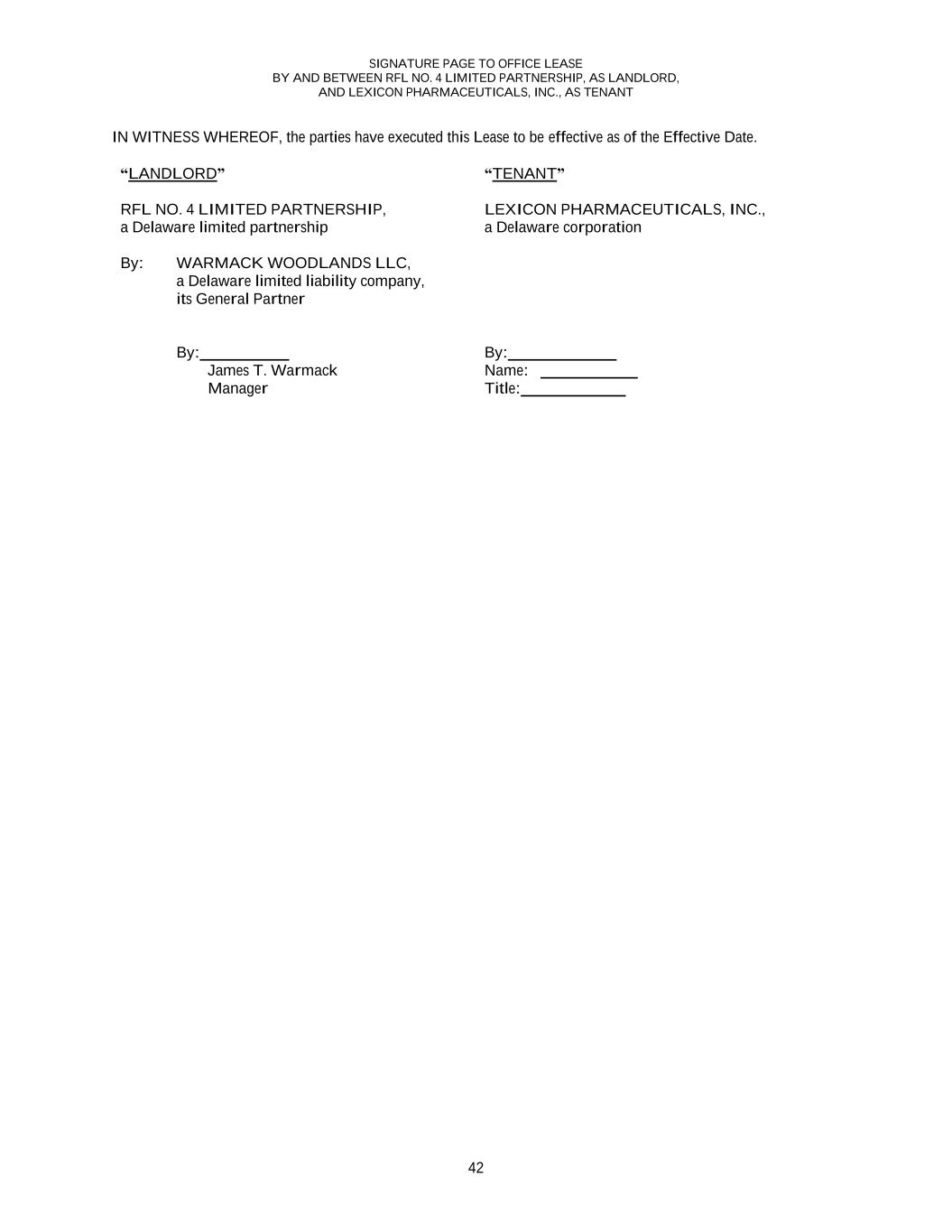 SIGNATURE PAGE TO OFFICE LEASE BY AND BETWEEN RFL NO. 4 LIMITED PARTNERSHIP, AS LANDLORD, AND LEXICON PHARMACEUTICALS, INC., AS TENANT 42 IN WITNESS WHEREOF, the parties have executed this Lease to be effective as of the Effective Date. “LANDLORD” RFL NO. 4 LIMITED PARTNERSHIP, a Delaware limited partnership By: WARMACK WOODLANDS LLC, a Delaware limited liability company, its General Partner By: James T. Warmack Manager “TENANT” LEXICON PHARMACEUTICALS, INC., a Delaware corporation By: Name: Title: