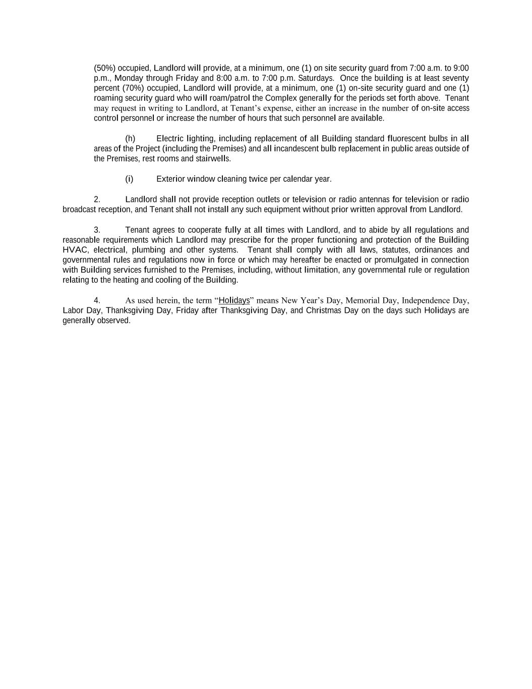 (50%) occupied, Landlord will provide, at a minimum, one (1) on site security guard from 7:00 a.m. to 9:00 p.m., Monday through Friday and 8:00 a.m. to 7:00 p.m. Saturdays. Once the building is at least seventy percent (70%) occupied, Landlord will provide, at a minimum, one (1) on-site security guard and one (1) roaming security guard who will roam/patrol the Complex generally for the periods set forth above. Tenant may request in writing to Landlord, at Tenant’s expense, either an increase in the number of on-site access control personnel or increase the number of hours that such personnel are available. (h) Electric lighting, including replacement of all Building standard fluorescent bulbs in all areas of the Project (including the Premises) and all incandescent bulb replacement in public areas outside of the Premises, rest rooms and stairwells. (i) Exterior window cleaning twice per calendar year. 2. Landlord shall not provide reception outlets or television or radio antennas for television or radio broadcast reception, and Tenant shall not install any such equipment without prior written approval from Landlord. 3. Tenant agrees to cooperate fully at all times with Landlord, and to abide by all regulations and reasonable requirements which Landlord may prescribe for the proper functioning and protection of the Building HVAC, electrical, plumbing and other systems. Tenant shall comply with all laws, statutes, ordinances and governmental rules and regulations now in force or which may hereafter be enacted or promulgated in connection with Building services furnished to the Premises, including, without limitation, any governmental rule or regulation relating to the heating and cooling of the Building. 4. As used herein, the term “Holidays” means New Year’s Day, Memorial Day, Independence Day, Labor Day, Thanksgiving Day, Friday after Thanksgiving Day, and Christmas Day on the days such Holidays are generally observed.