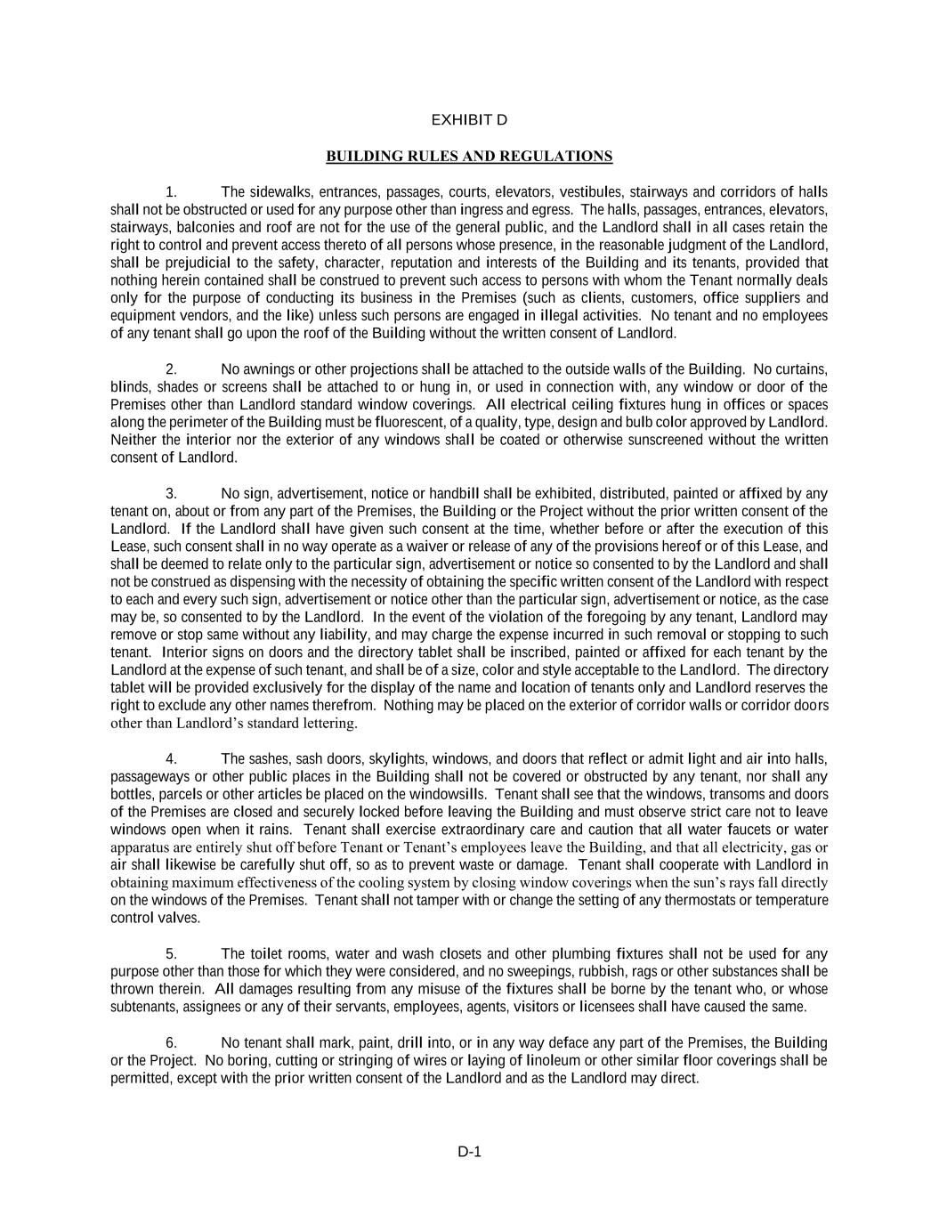 D-1 EXHIBIT D BUILDING RULES AND REGULATIONS 1. The sidewalks, entrances, passages, courts, elevators, vestibules, stairways and corridors of halls shall not be obstructed or used for any purpose other than ingress and egress. The halls, passages, entrances, elevators, stairways, balconies and roof are not for the use of the general public, and the Landlord shall in all cases retain the right to control and prevent access thereto of all persons whose presence, in the reasonable judgment of the Landlord, shall be prejudicial to the safety, character, reputation and interests of the Building and its tenants, provided that nothing herein contained shall be construed to prevent such access to persons with whom the Tenant normally deals only for the purpose of conducting its business in the Premises (such as clients, customers, office suppliers and equipment vendors, and the like) unless such persons are engaged in illegal activities. No tenant and no employees of any tenant shall go upon the roof of the Building without the written consent of Landlord. 2. No awnings or other projections shall be attached to the outside walls of the Building. No curtains, blinds, shades or screens shall be attached to or hung in, or used in connection with, any window or door of the Premises other than Landlord standard window coverings. All electrical ceiling fixtures hung in offices or spaces along the perimeter of the Building must be fluorescent, of a quality, type, design and bulb color approved by Landlord. Neither the interior nor the exterior of any windows shall be coated or otherwise sunscreened without the written consent of Landlord. 3. No sign, advertisement, notice or handbill shall be exhibited, distributed, painted or affixed by any tenant on, about or from any part of the Premises, the Building or the Project without the prior written consent of the Landlord. If the Landlord shall have given such consent at the time, whether before or after the execution of this Lease, such consent shall in no way operate as a waiver or release of any of the provisions hereof or of this Lease, and shall be deemed to relate only to the particular sign, advertisement or notice so consented to by the Landlord and shall not be construed as dispensing with the necessity of obtaining the specific written consent of the Landlord with respect to each and every such sign, advertisement or notice other than the particular sign, advertisement or notice, as the case may be, so consented to by the Landlord. In the event of the violation of the foregoing by any tenant, Landlord may remove or stop same without any liability, and may charge the expense incurred in such removal or stopping to such tenant. Interior signs on doors and the directory tablet shall be inscribed, painted or affixed for each tenant by the Landlord at the expense of such tenant, and shall be of a size, color and style acceptable to the Landlord. The directory tablet will be provided exclusively for the display of the name and location of tenants only and Landlord reserves the right to exclude any other names therefrom. Nothing may be placed on the exterior of corridor walls or corridor doors other than Landlord’s standard lettering. 4. The sashes, sash doors, skylights, windows, and doors that reflect or admit light and air into halls, passageways or other public places in the Building shall not be covered or obstructed by any tenant, nor shall any bottles, parcels or other articles be placed on the windowsills. Tenant shall see that the windows, transoms and doors of the Premises are closed and securely locked before leaving the Building and must observe strict care not to leave windows open when it rains. Tenant shall exercise extraordinary care and caution that all water faucets or water apparatus are entirely shut off before Tenant or Tenant’s employees leave the Building, and that all electricity, gas or air shall likewise be carefully shut off, so as to prevent waste or damage. Tenant shall cooperate with Landlord in obtaining maximum effectiveness of the cooling system by closing window coverings when the sun’s rays fall directly on the windows of the Premises. Tenant shall not tamper with or change the setting of any thermostats or temperature control valves. 5. The toilet rooms, water and wash closets and other plumbing fixtures shall not be used for any purpose other than those for which they were considered, and no sweepings, rubbish, rags or other substances shall be thrown therein. All damages resulting from any misuse of the fixtures shall be borne by the tenant who, or whose subtenants, assignees or any of their servants, employees, agents, visitors or licensees shall have caused the same. 6. No tenant shall mark, paint, drill into, or in any way deface any part of the Premises, the Building or the Project. No boring, cutting or stringing of wires or laying of linoleum or other similar floor coverings shall be permitted, except with the prior written consent of the Landlord and as the Landlord may direct.