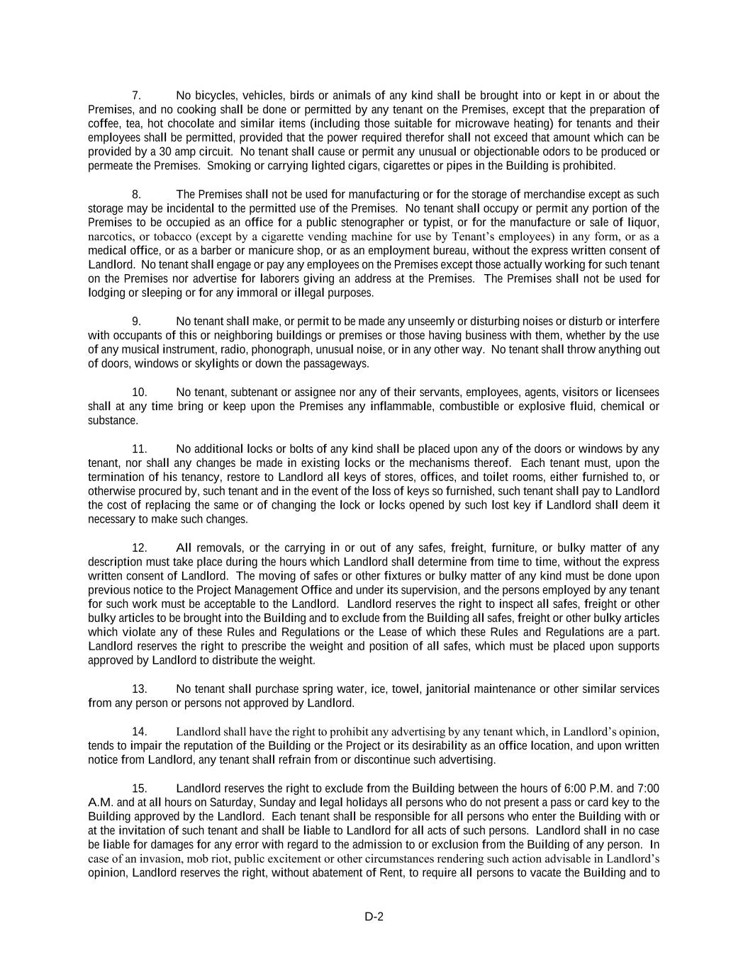 D-2 7. No bicycles, vehicles, birds or animals of any kind shall be brought into or kept in or about the Premises, and no cooking shall be done or permitted by any tenant on the Premises, except that the preparation of coffee, tea, hot chocolate and similar items (including those suitable for microwave heating) for tenants and their employees shall be permitted, provided that the power required therefor shall not exceed that amount which can be provided by a 30 amp circuit. No tenant shall cause or permit any unusual or objectionable odors to be produced or permeate the Premises. Smoking or carrying lighted cigars, cigarettes or pipes in the Building is prohibited. 8. The Premises shall not be used for manufacturing or for the storage of merchandise except as such storage may be incidental to the permitted use of the Premises. No tenant shall occupy or permit any portion of the Premises to be occupied as an office for a public stenographer or typist, or for the manufacture or sale of liquor, narcotics, or tobacco (except by a cigarette vending machine for use by Tenant’s employees) in any form, or as a medical office, or as a barber or manicure shop, or as an employment bureau, without the express written consent of Landlord. No tenant shall engage or pay any employees on the Premises except those actually working for such tenant on the Premises nor advertise for laborers giving an address at the Premises. The Premises shall not be used for lodging or sleeping or for any immoral or illegal purposes. 9. No tenant shall make, or permit to be made any unseemly or disturbing noises or disturb or interfere with occupants of this or neighboring buildings or premises or those having business with them, whether by the use of any musical instrument, radio, phonograph, unusual noise, or in any other way. No tenant shall throw anything out of doors, windows or skylights or down the passageways. 10. No tenant, subtenant or assignee nor any of their servants, employees, agents, visitors or licensees shall at any time bring or keep upon the Premises any inflammable, combustible or explosive fluid, chemical or substance. 11. No additional locks or bolts of any kind shall be placed upon any of the doors or windows by any tenant, nor shall any changes be made in existing locks or the mechanisms thereof. Each tenant must, upon the termination of his tenancy, restore to Landlord all keys of stores, offices, and toilet rooms, either furnished to, or otherwise procured by, such tenant and in the event of the loss of keys so furnished, such tenant shall pay to Landlord the cost of replacing the same or of changing the lock or locks opened by such lost key if Landlord shall deem it necessary to make such changes. 12. All removals, or the carrying in or out of any safes, freight, furniture, or bulky matter of any description must take place during the hours which Landlord shall determine from time to time, without the express written consent of Landlord. The moving of safes or other fixtures or bulky matter of any kind must be done upon previous notice to the Project Management Office and under its supervision, and the persons employed by any tenant for such work must be acceptable to the Landlord. Landlord reserves the right to inspect all safes, freight or other bulky articles to be brought into the Building and to exclude from the Building all safes, freight or other bulky articles which violate any of these Rules and Regulations or the Lease of which these Rules and Regulations are a part. Landlord reserves the right to prescribe the weight and position of all safes, which must be placed upon supports approved by Landlord to distribute the weight. 13. No tenant shall purchase spring water, ice, towel, janitorial maintenance or other similar services from any person or persons not approved by Landlord. 14. Landlord shall have the right to prohibit any advertising by any tenant which, in Landlord’s opinion, tends to impair the reputation of the Building or the Project or its desirability as an office location, and upon written notice from Landlord, any tenant shall refrain from or discontinue such advertising. 15. Landlord reserves the right to exclude from the Building between the hours of 6:00 P.M. and 7:00 A.M. and at all hours on Saturday, Sunday and legal holidays all persons who do not present a pass or card key to the Building approved by the Landlord. Each tenant shall be responsible for all persons who enter the Building with or at the invitation of such tenant and shall be liable to Landlord for all acts of such persons. Landlord shall in no case be liable for damages for any error with regard to the admission to or exclusion from the Building of any person. In case of an invasion, mob riot, public excitement or other circumstances rendering such action advisable in Landlord’s opinion, Landlord reserves the right, without abatement of Rent, to require all persons to vacate the Building and to