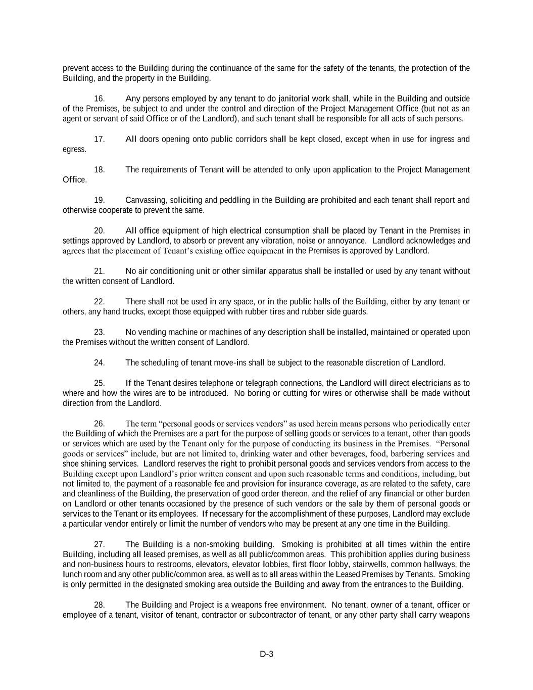 D-3 prevent access to the Building during the continuance of the same for the safety of the tenants, the protection of the Building, and the property in the Building. 16. Any persons employed by any tenant to do janitorial work shall, while in the Building and outside of the Premises, be subject to and under the control and direction of the Project Management Office (but not as an agent or servant of said Office or of the Landlord), and such tenant shall be responsible for all acts of such persons. 17. All doors opening onto public corridors shall be kept closed, except when in use for ingress and egress. 18. The requirements of Tenant will be attended to only upon application to the Project Management Office. 19. Canvassing, soliciting and peddling in the Building are prohibited and each tenant shall report and otherwise cooperate to prevent the same. 20. All office equipment of high electrical consumption shall be placed by Tenant in the Premises in settings approved by Landlord, to absorb or prevent any vibration, noise or annoyance. Landlord acknowledges and agrees that the placement of Tenant’s existing office equipment in the Premises is approved by Landlord. 21. No air conditioning unit or other similar apparatus shall be installed or used by any tenant without the written consent of Landlord. 22. There shall not be used in any space, or in the public halls of the Building, either by any tenant or others, any hand trucks, except those equipped with rubber tires and rubber side guards. 23. No vending machine or machines of any description shall be installed, maintained or operated upon the Premises without the written consent of Landlord. 24. The scheduling of tenant move-ins shall be subject to the reasonable discretion of Landlord. 25. If the Tenant desires telephone or telegraph connections, the Landlord will direct electricians as to where and how the wires are to be introduced. No boring or cutting for wires or otherwise shall be made without direction from the Landlord. 26. The term “personal goods or services vendors” as used herein means persons who periodically enter the Building of which the Premises are a part for the purpose of selling goods or services to a tenant, other than goods or services which are used by the Tenant only for the purpose of conducting its business in the Premises. “Personal goods or services” include, but are not limited to, drinking water and other beverages, food, barbering services and shoe shining services. Landlord reserves the right to prohibit personal goods and services vendors from access to the Building except upon Landlord’s prior written consent and upon such reasonable terms and conditions, including, but not limited to, the payment of a reasonable fee and provision for insurance coverage, as are related to the safety, care and cleanliness of the Building, the preservation of good order thereon, and the relief of any financial or other burden on Landlord or other tenants occasioned by the presence of such vendors or the sale by them of personal goods or services to the Tenant or its employees. If necessary for the accomplishment of these purposes, Landlord may exclude a particular vendor entirely or limit the number of vendors who may be present at any one time in the Building. 27. The Building is a non-smoking building. Smoking is prohibited at all times within the entire Building, including all leased premises, as well as all public/common areas. This prohibition applies during business and non-business hours to restrooms, elevators, elevator lobbies, first floor lobby, stairwells, common hallways, the lunch room and any other public/common area, as well as to all areas within the Leased Premises by Tenants. Smoking is only permitted in the designated smoking area outside the Building and away from the entrances to the Building. 28. The Building and Project is a weapons free environment. No tenant, owner of a tenant, officer or employee of a tenant, visitor of tenant, contractor or subcontractor of tenant, or any other party shall carry weapons