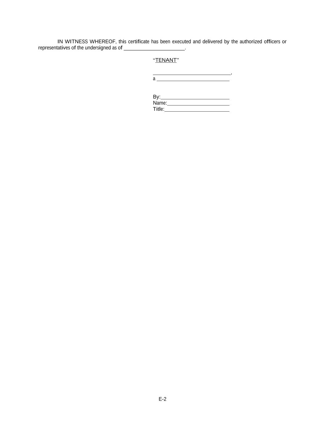 E-2 IN WITNESS WHEREOF, this certificate has been executed and delivered by the authorized officers or representatives of the undersigned as of _______________________. “TENANT” , a By: Name: Title: