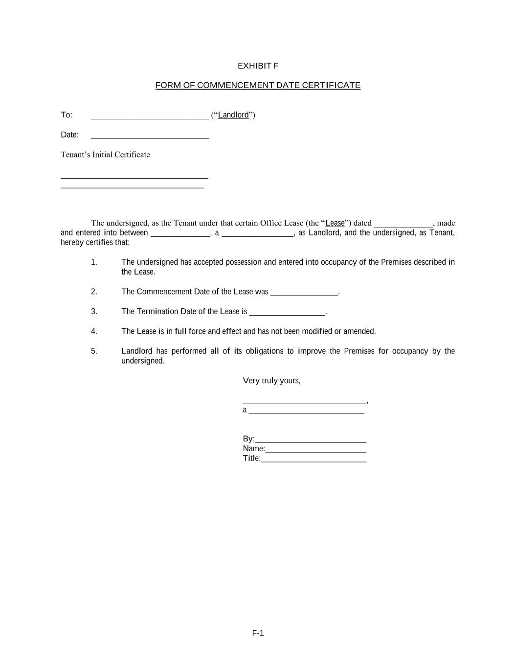 F-1 EXHIBIT F FORM OF COMMENCEMENT DATE CERTIFICATE To: ____________________________ (“Landlord”) Date: ____________________________ Tenant’s Initial Certificate ___________________________________ __________________________________ The undersigned, as the Tenant under that certain Office Lease (the “Lease”) dated ______________, made and entered into between ______________, a _________________, as Landlord, and the undersigned, as Tenant, hereby certifies that: 1. The undersigned has accepted possession and entered into occupancy of the Premises described in the Lease. 2. The Commencement Date of the Lease was ________________. 3. The Termination Date of the Lease is __________________. 4. The Lease is in full force and effect and has not been modified or amended. 5. Landlord has performed all of its obligations to improve the Premises for occupancy by the undersigned. Very truly yours, , a By: Name: Title: