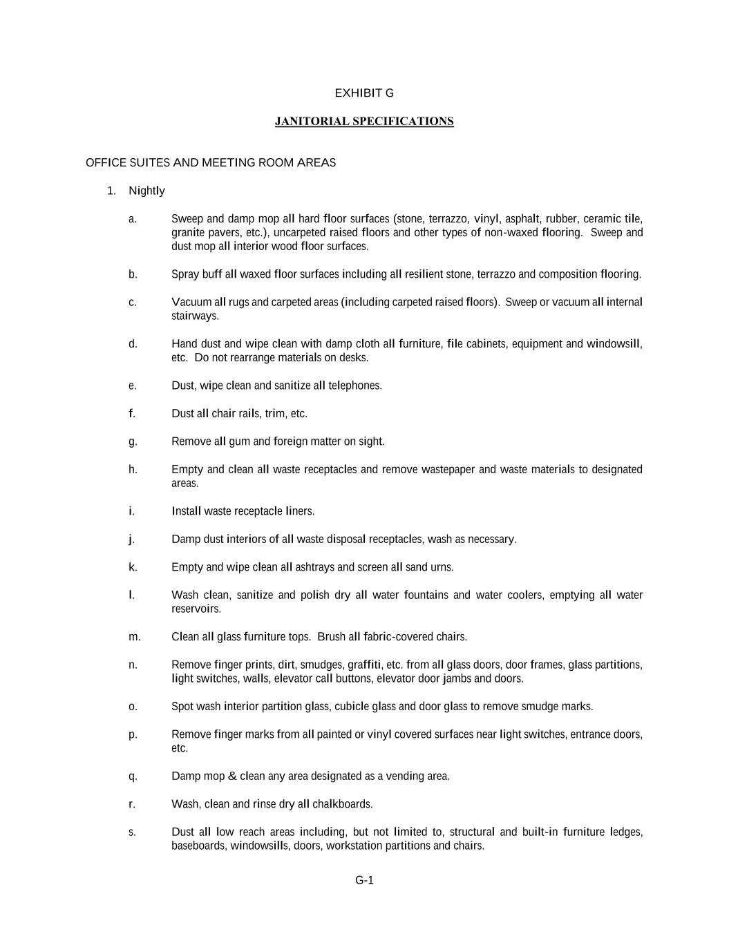 G-1 EXHIBIT G JANITORIAL SPECIFICATIONS OFFICE SUITES AND MEETING ROOM AREAS 1. Nightly a. Sweep and damp mop all hard floor surfaces (stone, terrazzo, vinyl, asphalt, rubber, ceramic tile, granite pavers, etc.), uncarpeted raised floors and other types of non-waxed flooring. Sweep and dust mop all interior wood floor surfaces. b. Spray buff all waxed floor surfaces including all resilient stone, terrazzo and composition flooring. c. Vacuum all rugs and carpeted areas (including carpeted raised floors). Sweep or vacuum all internal stairways. d. Hand dust and wipe clean with damp cloth all furniture, file cabinets, equipment and windowsill, etc. Do not rearrange materials on desks. e. Dust, wipe clean and sanitize all telephones. f. Dust all chair rails, trim, etc. g. Remove all gum and foreign matter on sight. h. Empty and clean all waste receptacles and remove wastepaper and waste materials to designated areas. i. Install waste receptacle liners. j. Damp dust interiors of all waste disposal receptacles, wash as necessary. k. Empty and wipe clean all ashtrays and screen all sand urns. l. Wash clean, sanitize and polish dry all water fountains and water coolers, emptying all water reservoirs. m. Clean all glass furniture tops. Brush all fabric-covered chairs. n. Remove finger prints, dirt, smudges, graffiti, etc. from all glass doors, door frames, glass partitions, light switches, walls, elevator call buttons, elevator door jambs and doors. o. Spot wash interior partition glass, cubicle glass and door glass to remove smudge marks. p. Remove finger marks from all painted or vinyl covered surfaces near light switches, entrance doors, etc. q. Damp mop & clean any area designated as a vending area. r. Wash, clean and rinse dry all chalkboards. s. Dust all low reach areas including, but not limited to, structural and built-in furniture ledges, baseboards, windowsills, doors, workstation partitions and chairs.