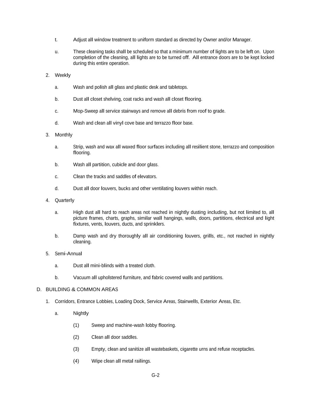 G-2 t. Adjust all window treatment to uniform standard as directed by Owner and/or Manager. u. These cleaning tasks shall be scheduled so that a minimum number of lights are to be left on. Upon completion of the cleaning, all lights are to be turned off. All entrance doors are to be kept locked during this entire operation. 2. Weekly a. Wash and polish all glass and plastic desk and tabletops. b. Dust all closet shelving, coat racks and wash all closet flooring. c. Mop-Sweep all service stairways and remove all debris from roof to grade. d. Wash and clean all vinyl cove base and terrazzo floor base. 3. Monthly a. Strip, wash and wax all waxed floor surfaces including all resilient stone, terrazzo and composition flooring. b. Wash all partition, cubicle and door glass. c. Clean the tracks and saddles of elevators. d. Dust all door louvers, bucks and other ventilating louvers within reach. 4. Quarterly a. High dust all hard to reach areas not reached in nightly dusting including, but not limited to, all picture frames, charts, graphs, similar wall hangings, walls, doors, partitions, electrical and light fixtures, vents, louvers, ducts, and sprinklers. b. Damp wash and dry thoroughly all air conditioning louvers, grills, etc., not reached in nightly cleaning. 5. Semi-Annual a. Dust all mini-blinds with a treated cloth. b. Vacuum all upholstered furniture, and fabric covered walls and partitions. D. BUILDING & COMMON AREAS 1. Corridors, Entrance Lobbies, Loading Dock, Service Areas, Stairwells, Exterior Areas, Etc. a. Nightly (1) Sweep and machine-wash lobby flooring. (2) Clean all door saddles. (3) Empty, clean and sanitize all wastebaskets, cigarette urns and refuse receptacles. (4) Wipe clean all metal railings.